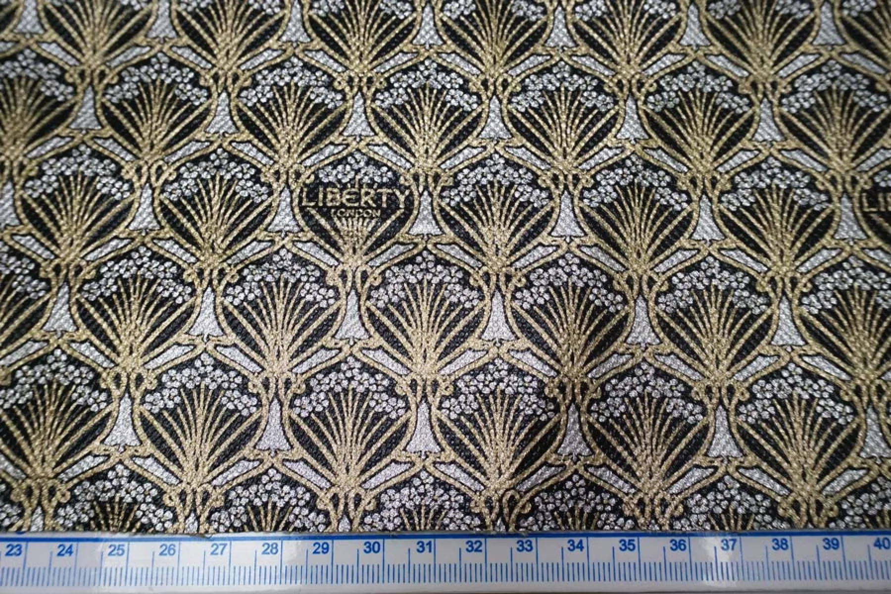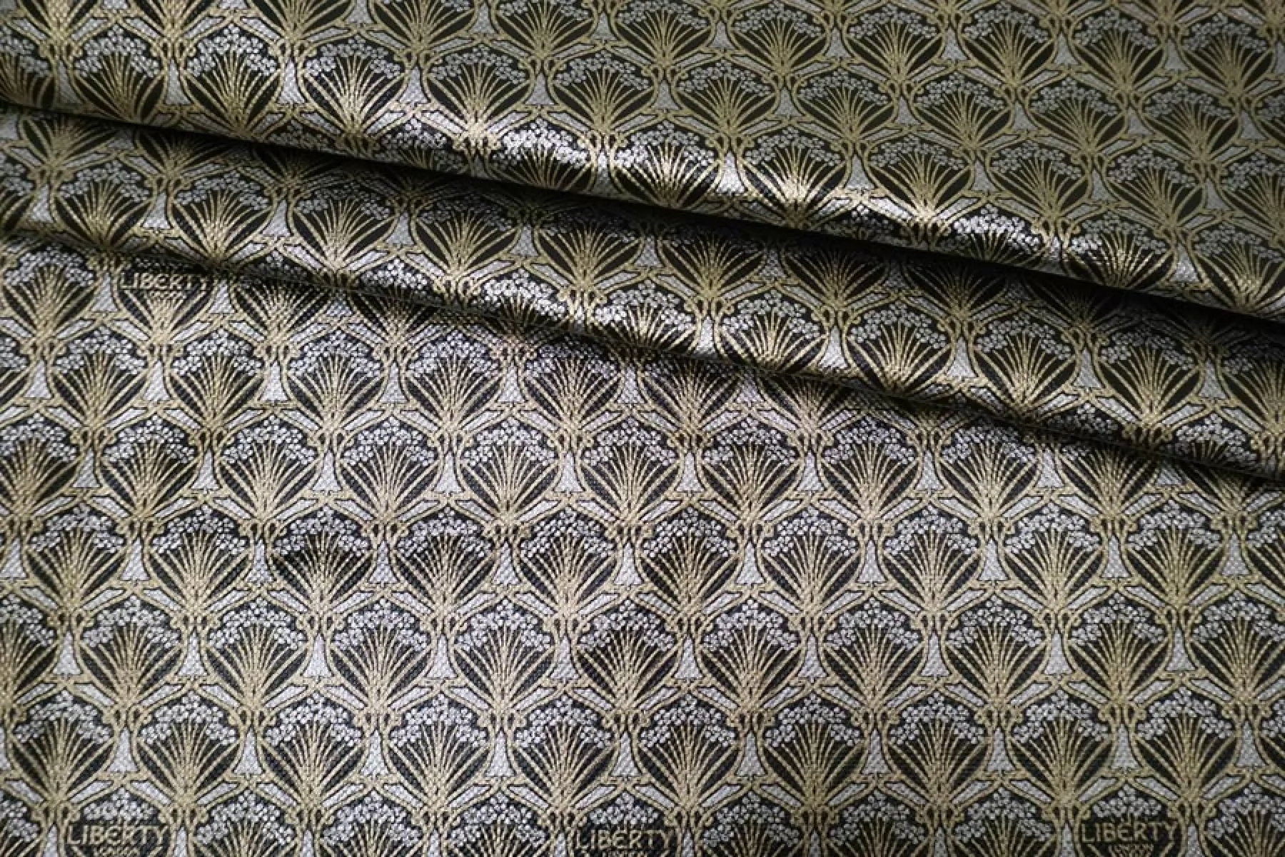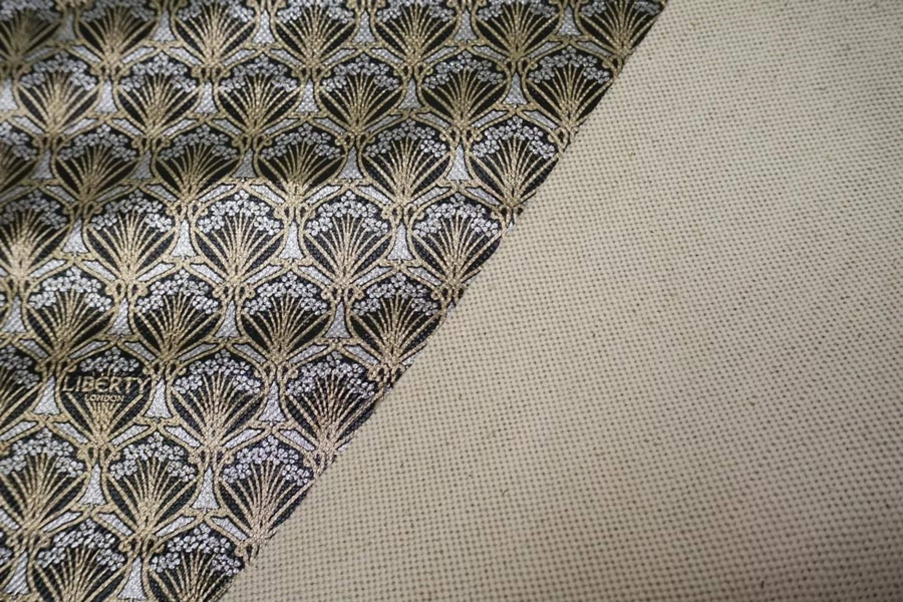 Крутая ткань от бренда Liberty, накат с орнаментальным принтом (чёрный, серебристый и золотистый цвета), на чёрном фоне. В основе хлопок со льном (молочно-бежевый). Держит форму, жёсткая, не пластичная. Не тянется, не просвечивает. Изначально это ткань для пошива сумок.