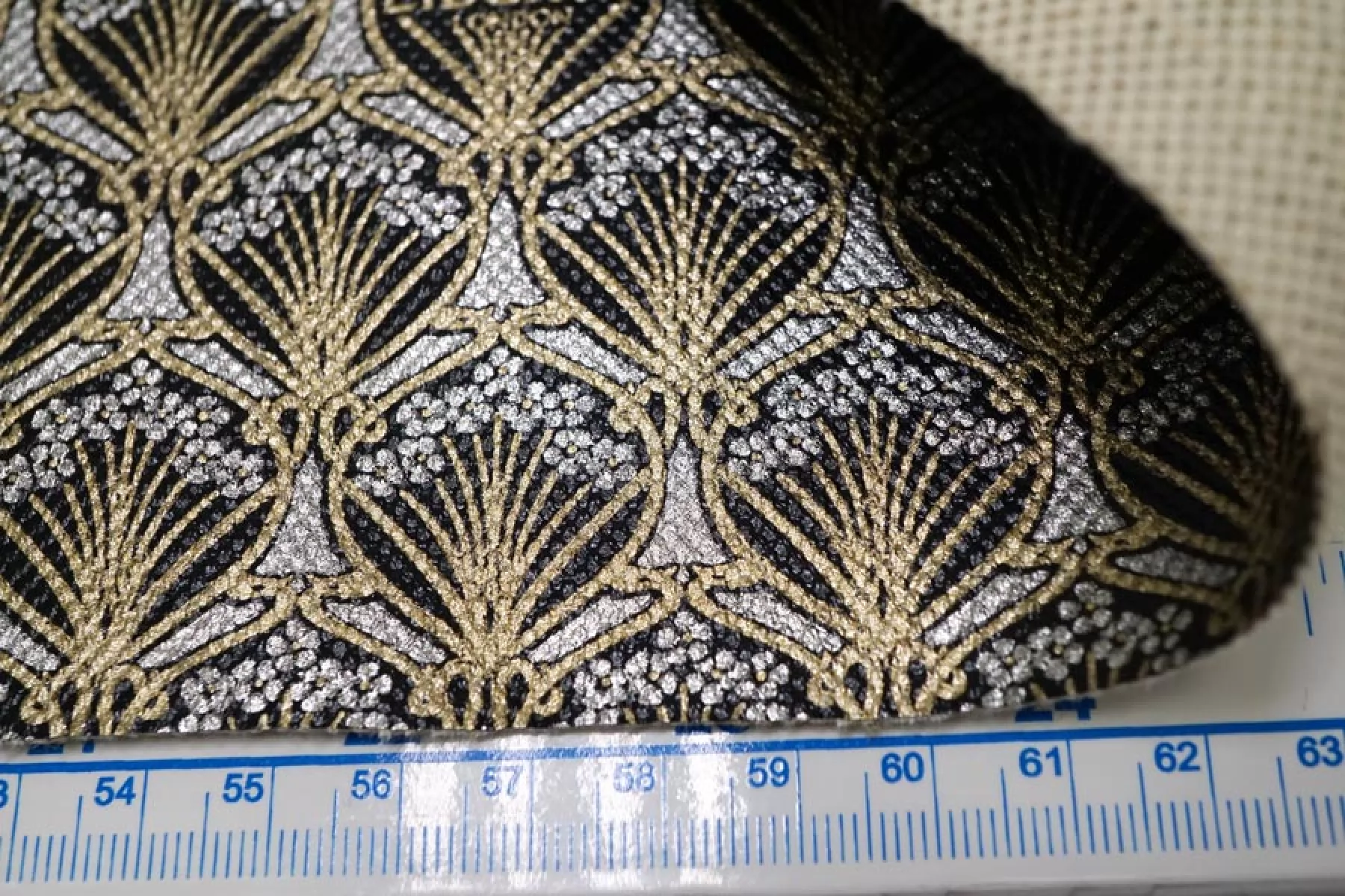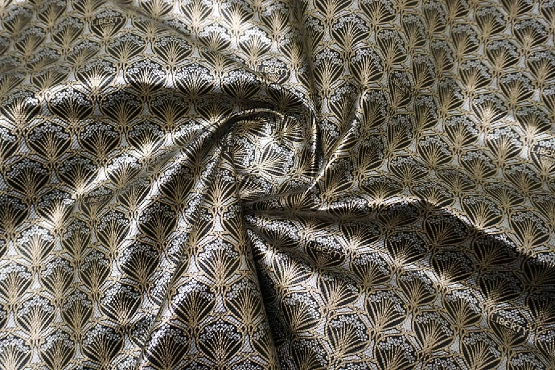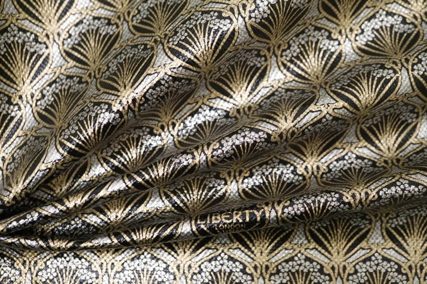Крутая ткань от бренда Liberty, накат с орнаментальным принтом (чёрный, серебристый и золотистый цвета), на чёрном фоне. В основе хлопок со льном (молочно-бежевый). Держит форму, жёсткая, не пластичная. Не тянется, не просвечивает. Изначально это ткань для пошива сумок.