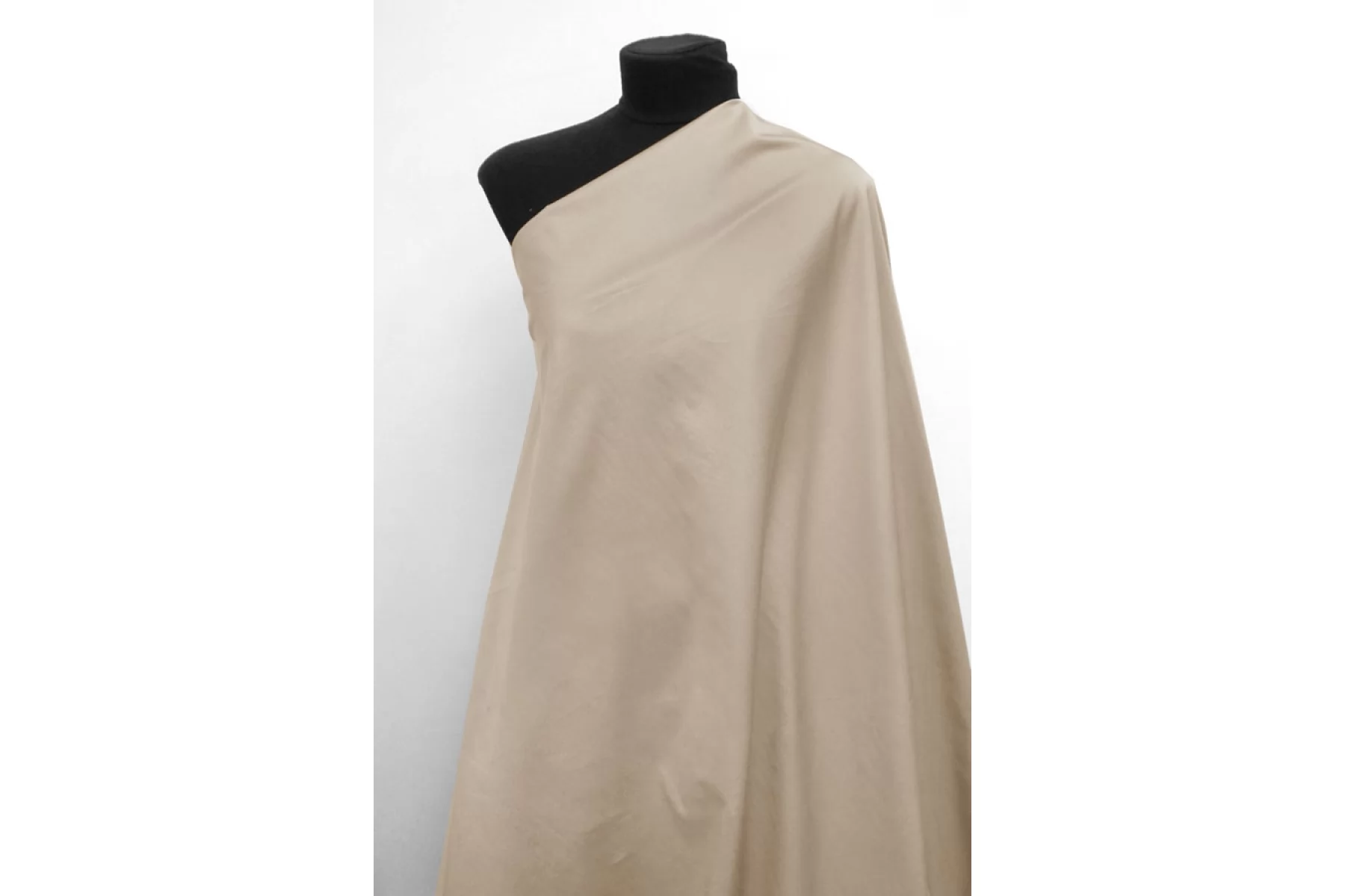 Шикарный костюмно-плательный хлопок в классическом бежевом оттенке. Очень приятный наощупь, мягкий. С великолепным легким лоском. Тянется благодаря эластану в составе. Сминается. Форму держит, при этом очень пластичный. Не просвечивает. Отличный вариант на летние костюмы, платья-сафари, юбки и другое. Учитывайте возможную усадку.