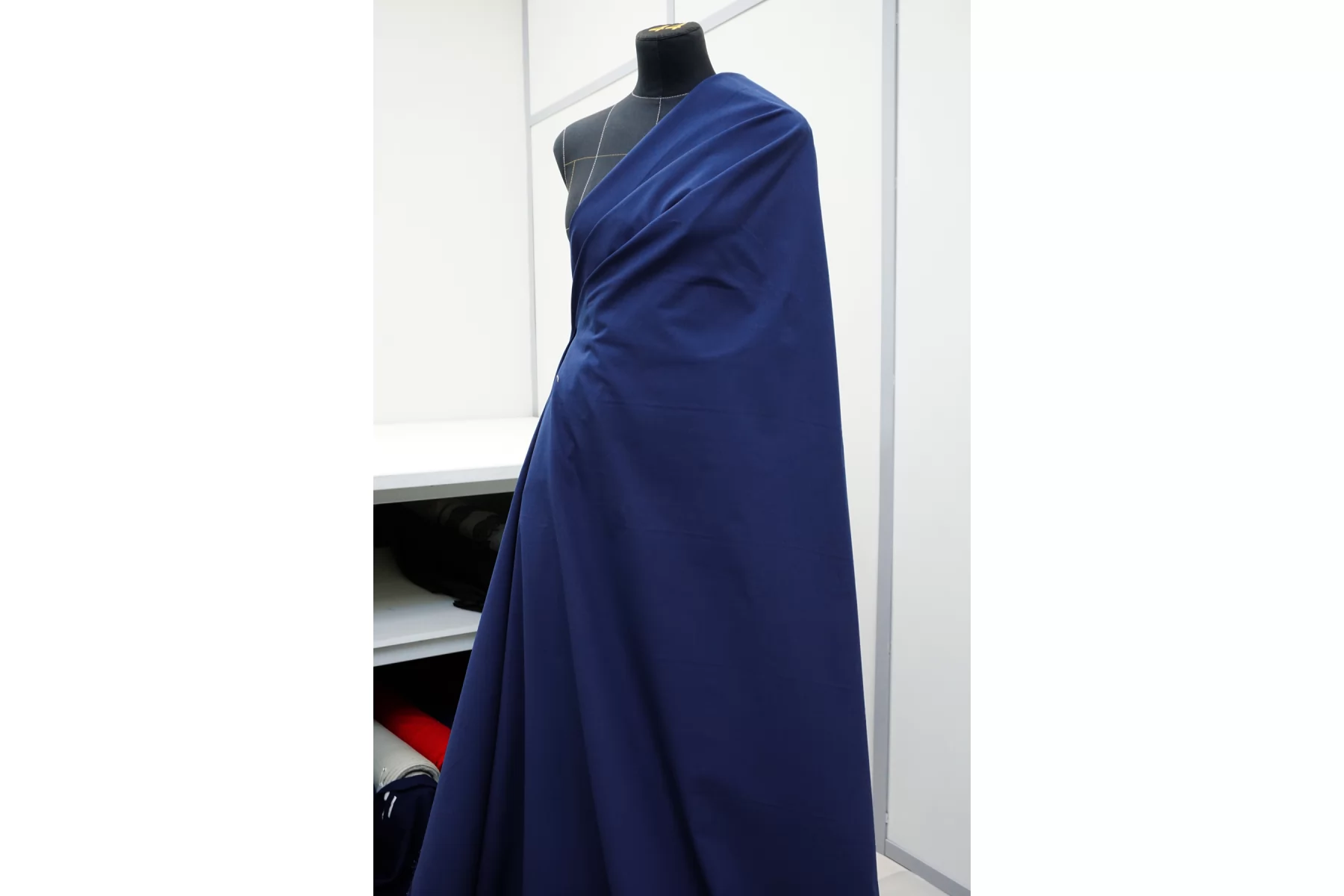 Отличного качества костюмно-плательный хлопок диагонального плетения в синем цвете. Рубчик слабо выражен, ткань хорошо тянется по всем направлениям (би-стрейч). Тактильно материал приятный. Не просвечивает, упругий. Мнется слабо, держит форму но при этом пластичный. Шьем костюмы, платья, юбки, брюки.