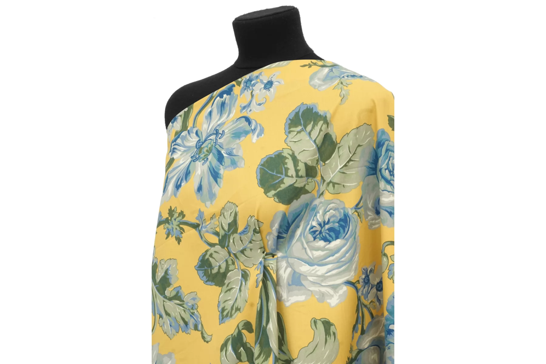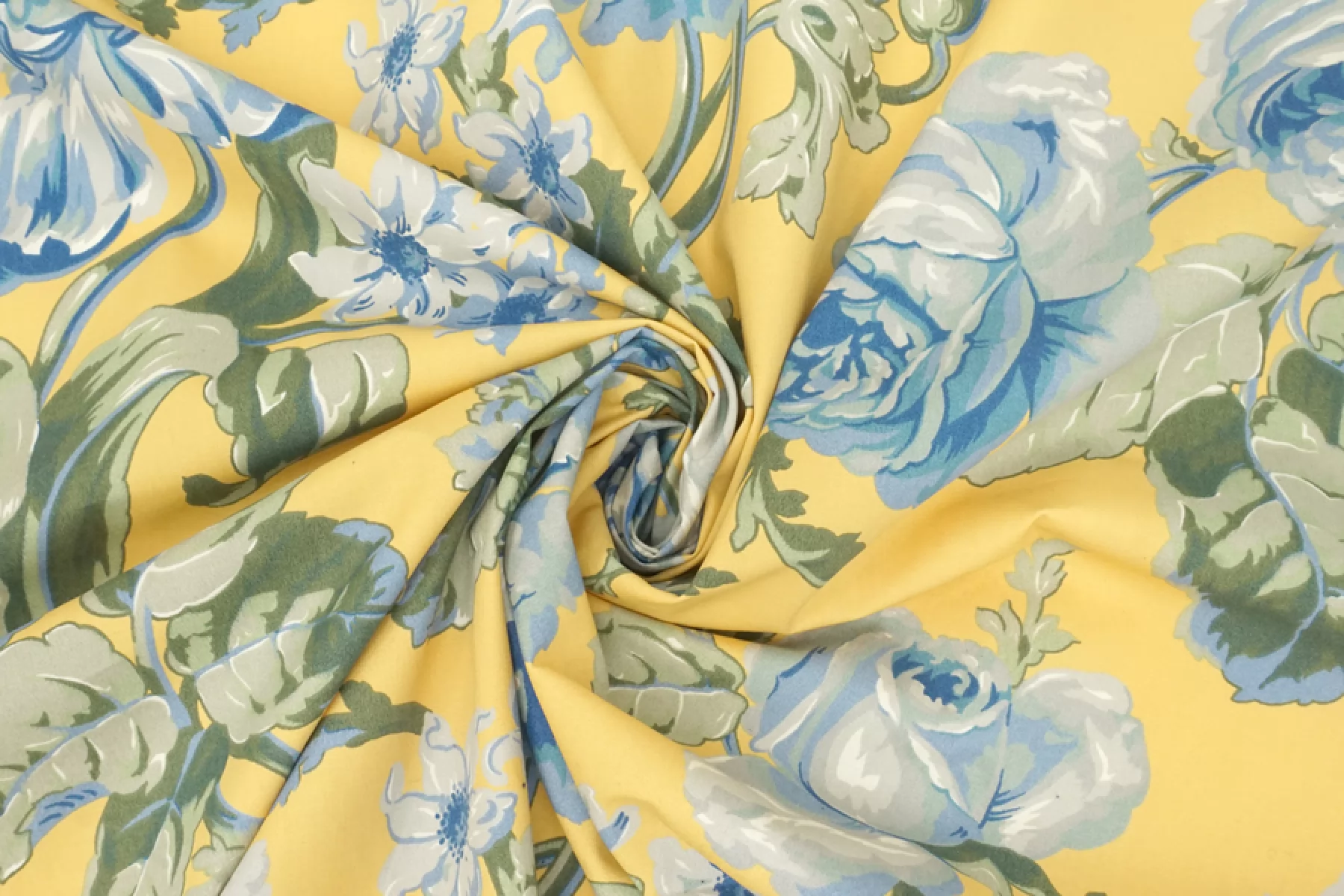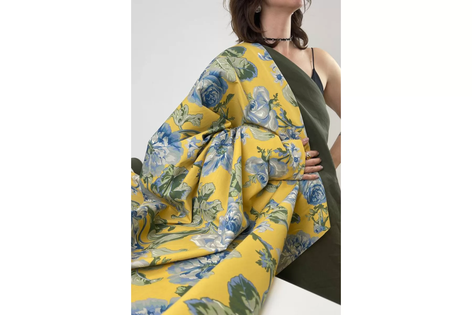 Костюмно-плательный хлопок ненасыщенно-желтого оттенка с цветочным принтом, в также ненасыщенных оттенках голубого, синего, серого, зеленого. Тактильно материал плотный, гладкий. Отлично держит форму и драпируется. Не просвечивает и не тянется. Мнется. Прекрасно подойдет на платья, костюмные варианты, жакеты и юбки.