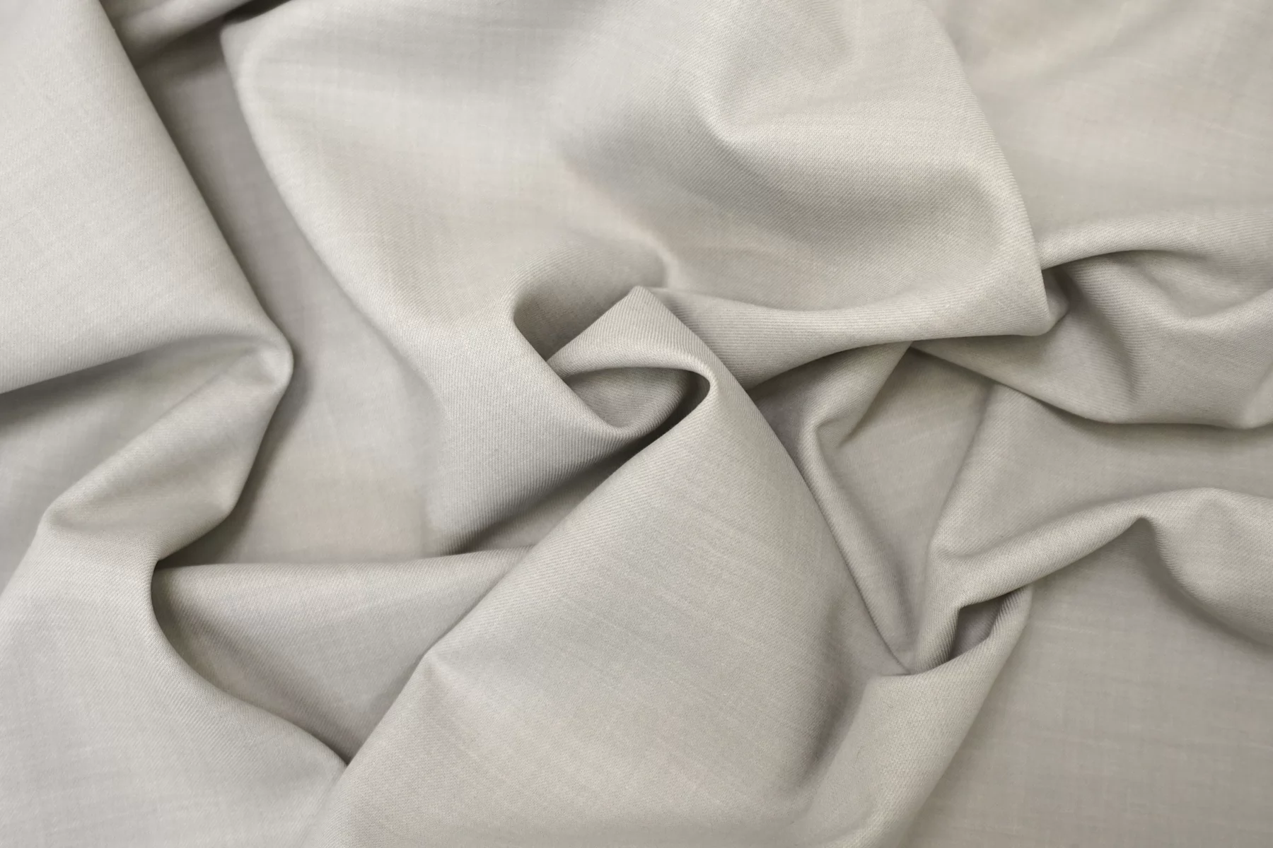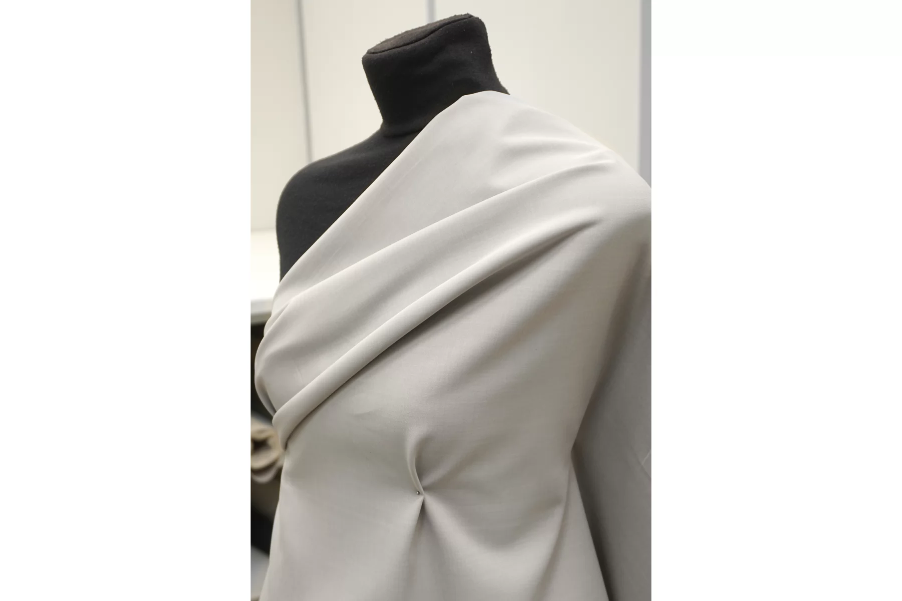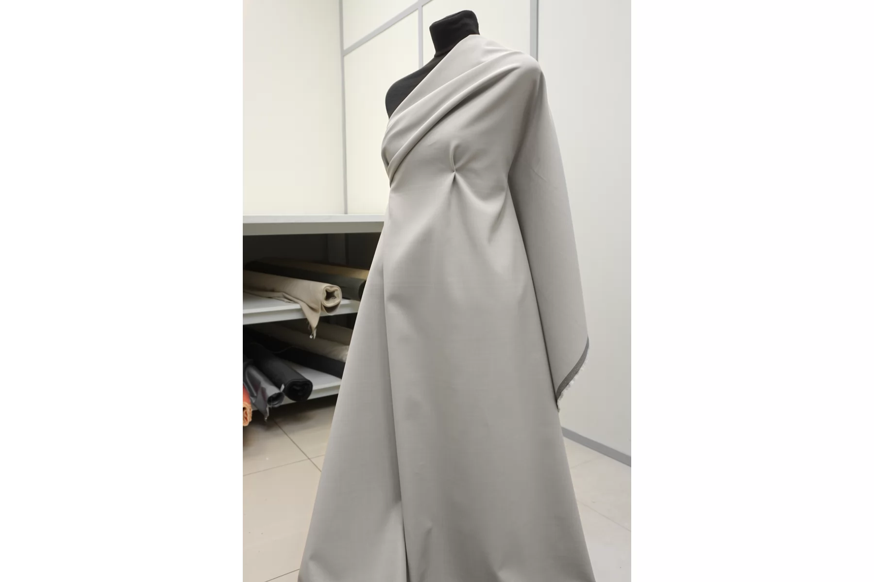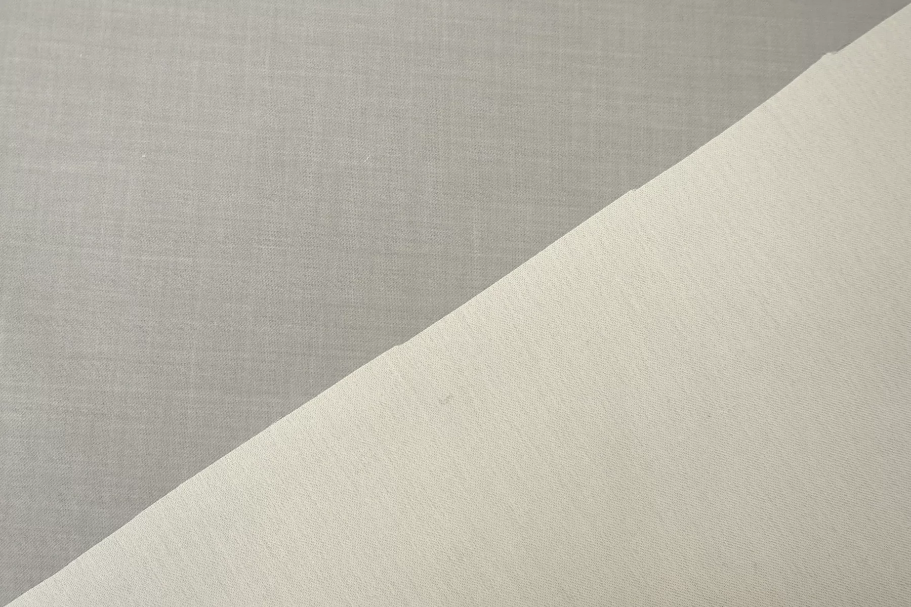 Хлопок костюмно-плательной плотности, одна сторона тёплая серая, другая светло-бежевая. Плотный, с упругой пластикой. Пластичный, тянется. Мнется умеренно. Не просвечивает силуэт. Подойдет для необычных жакетов, юбок, формодержащих платьев. Уход деликатный.