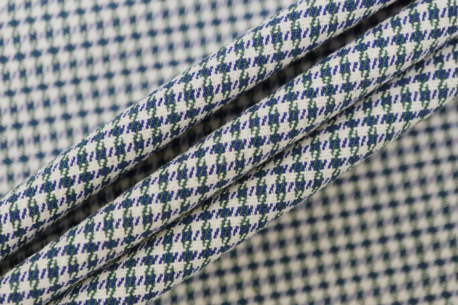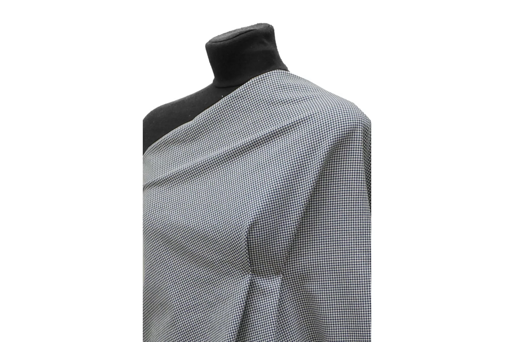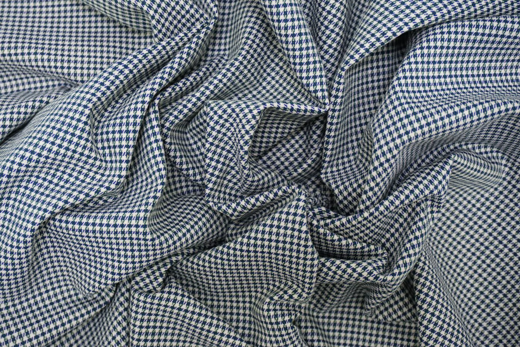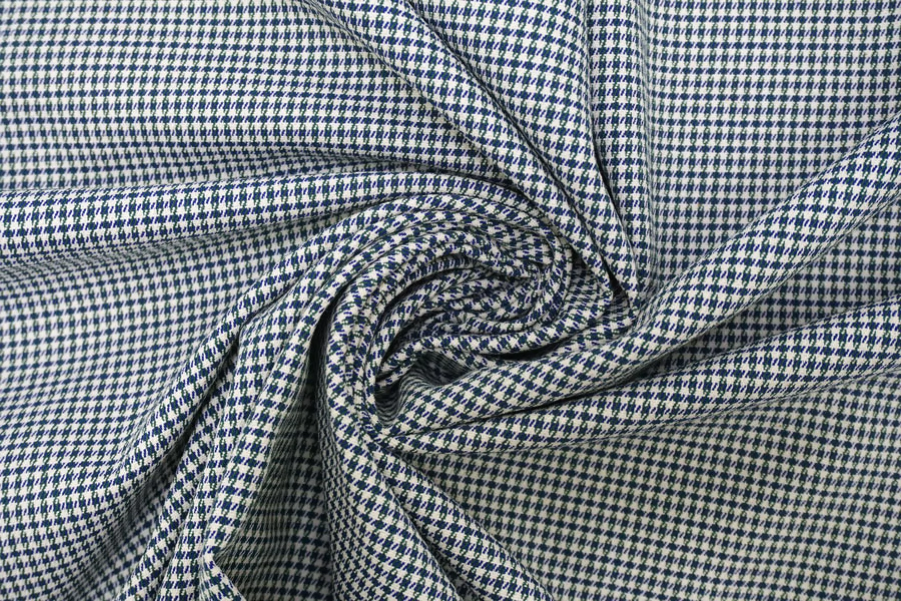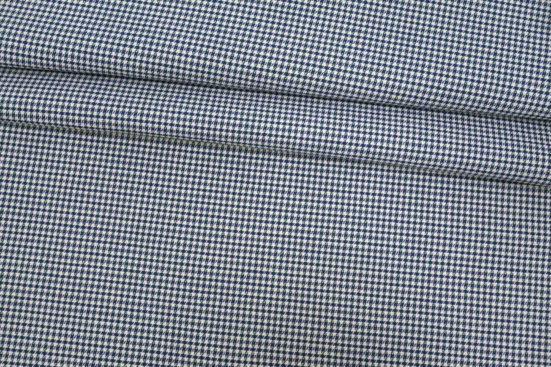 Классный хлопок с узором - гусиной лапкой, костюмно-плательной плотности. Узор соткан из нитей темно-синего, темно-зеленого и белого цвета. Материал тактильно слегка суховатый. Тонкий, но плотный, хорошо тянется. Не просвечивает. Мнется, но восстанавливается. Держит форму. Отлично подойдет для пошива костюмов, брюк, юбок, шорт, платьев. Учитывайте усадку.