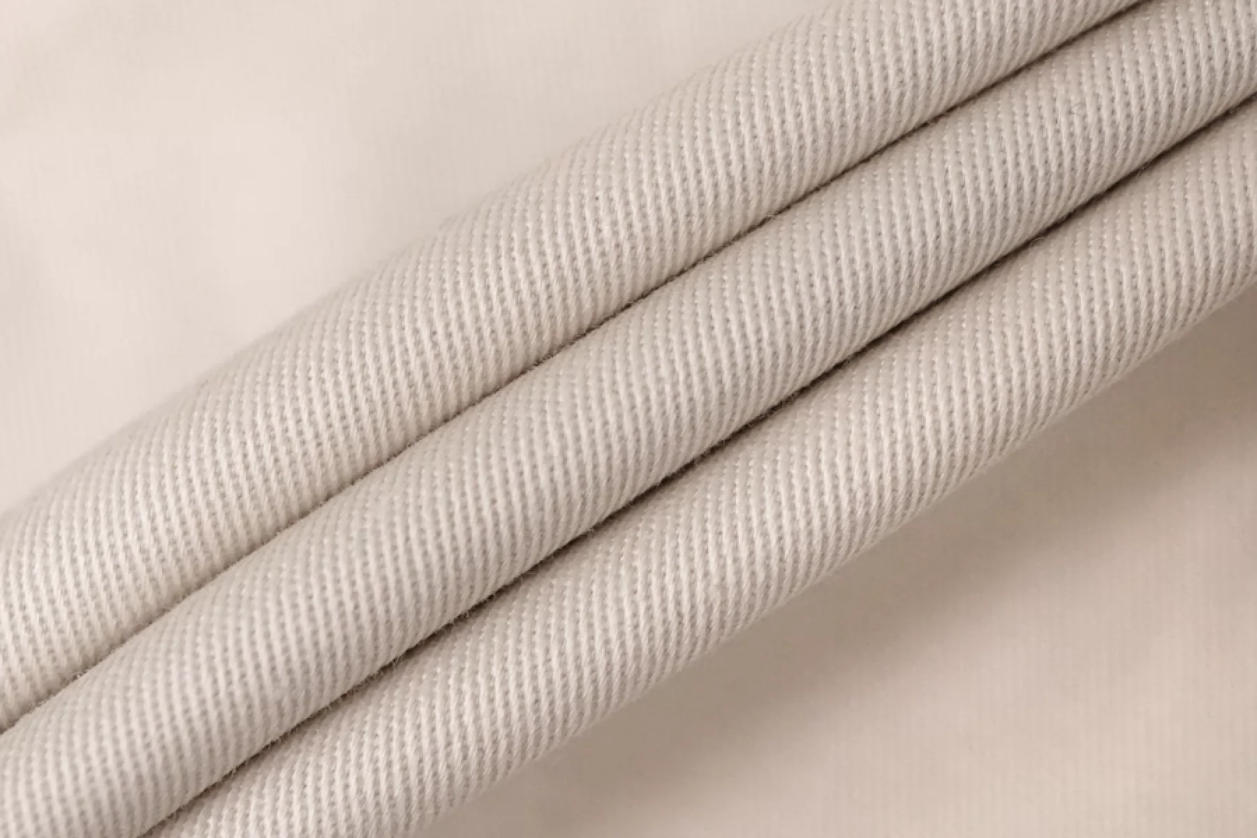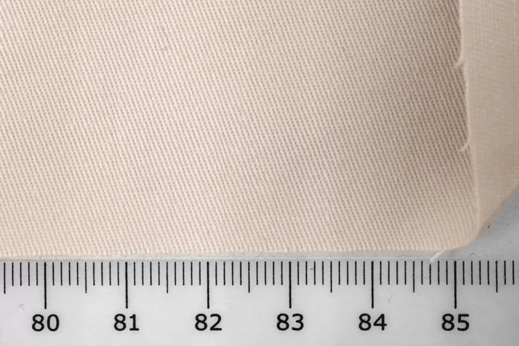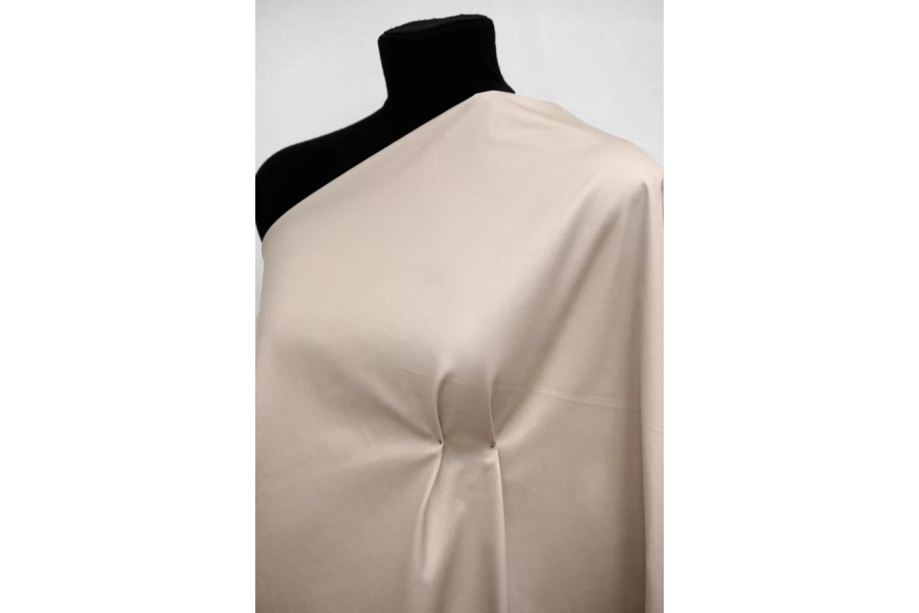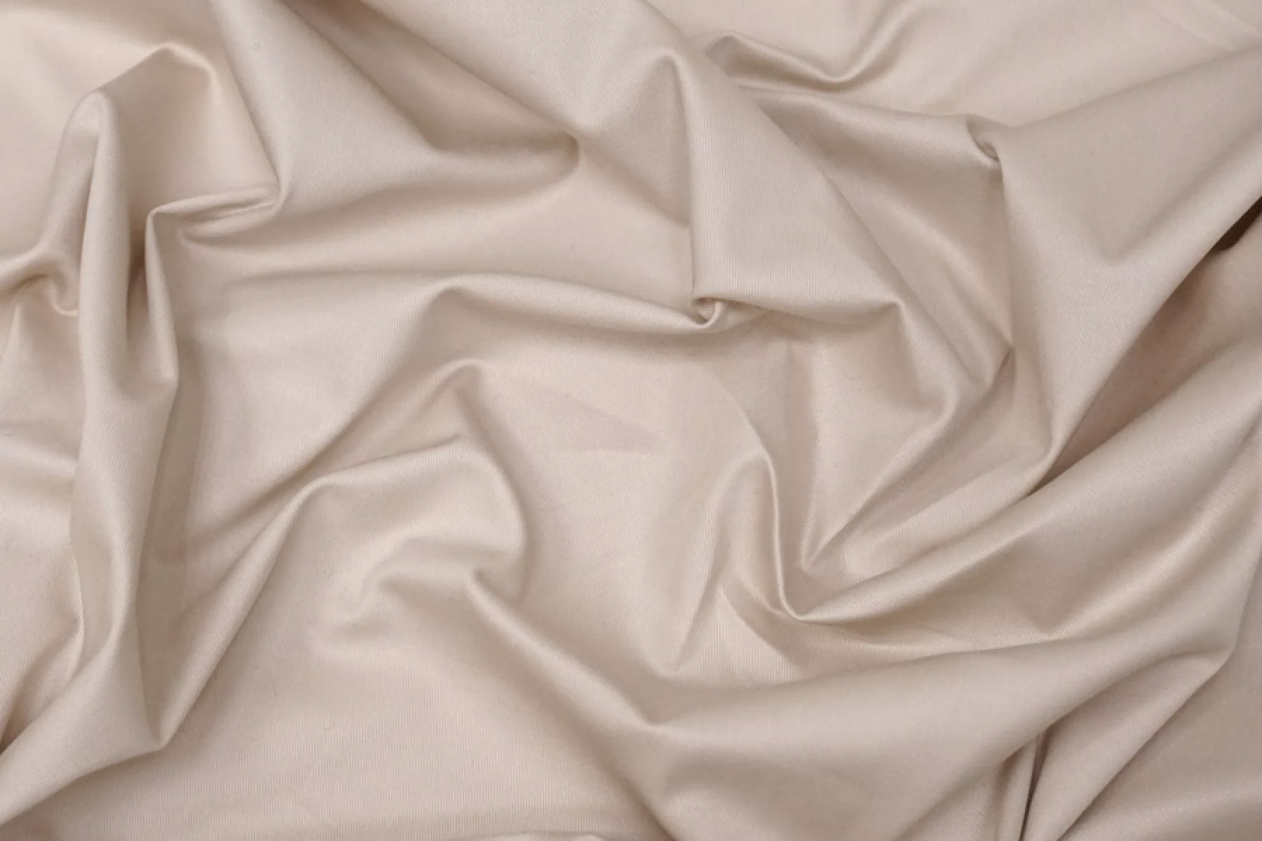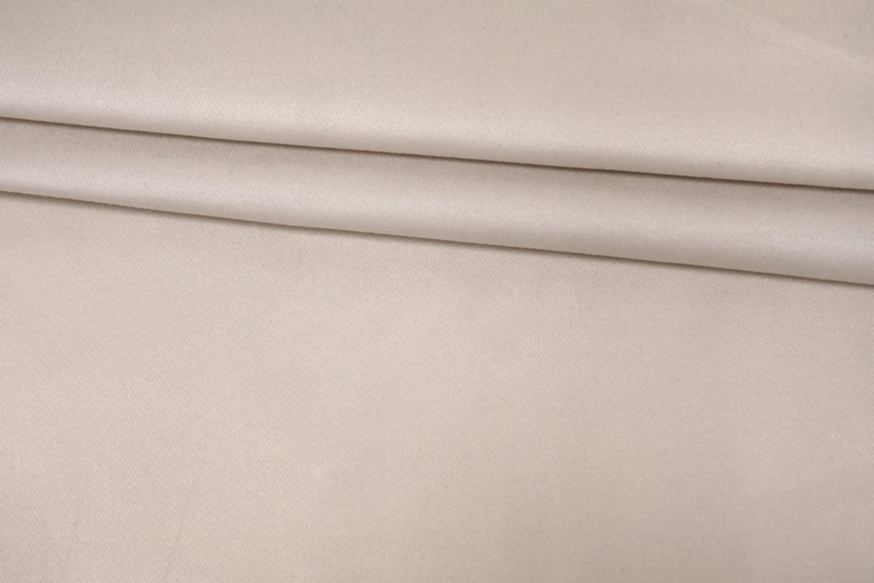 Костюмно-плательный хлопок в светлом кремовом оттенке диагонального плетения. Плотный, гладкий, пластичный, хорошо тянется, не просвечивает. Обладает приятным лоском. Неплохо держит форму. Подойдет для пошива платья, плотной рубашки, костюма, юбки, брюк, мягкого жакета. Учитывайте усадку материала.