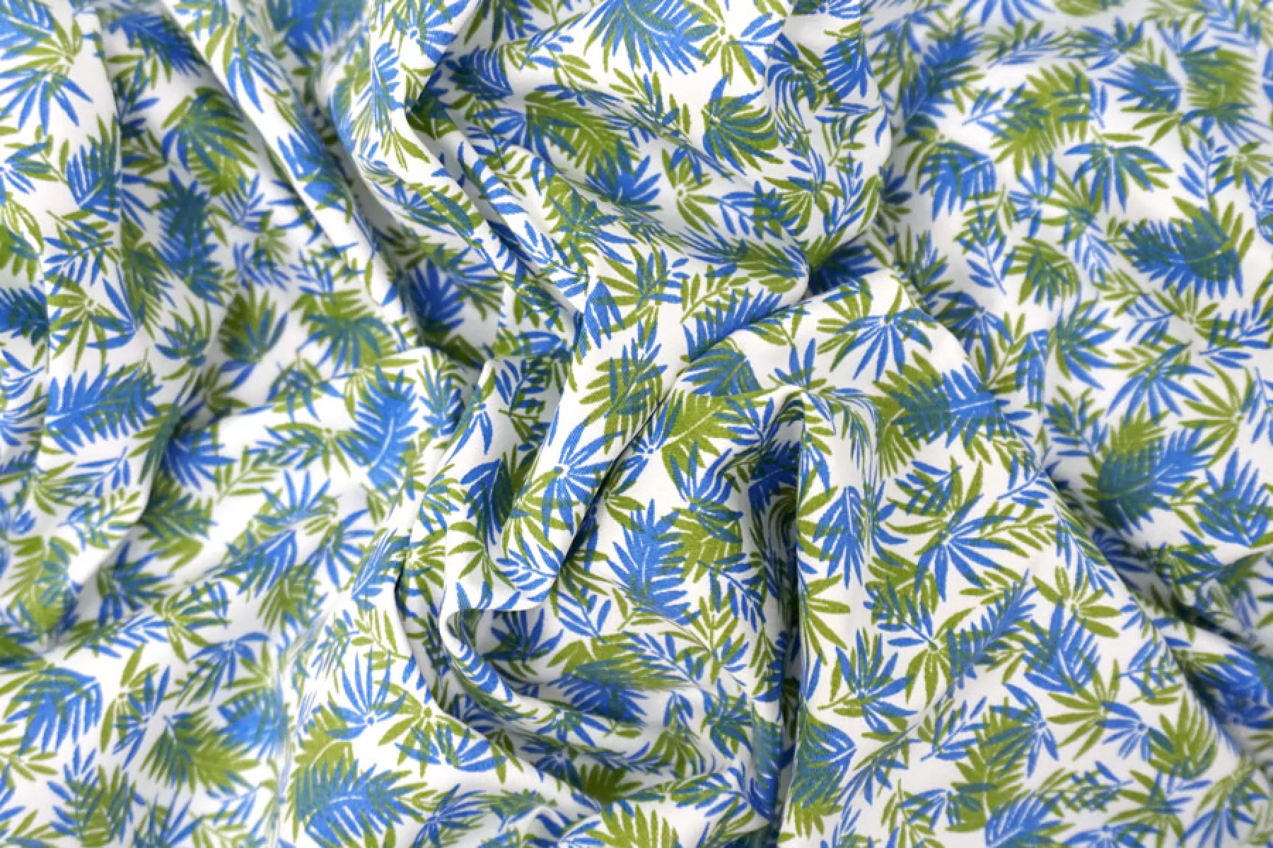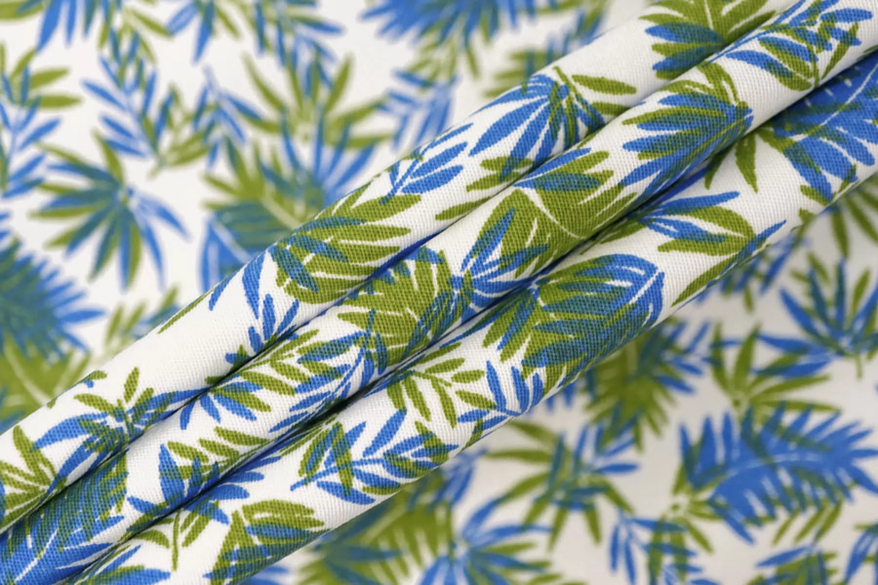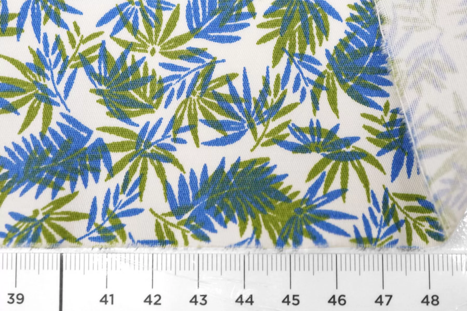Костюмно-плательный хлопок от Monnalisa с принтом в виде листьев зеленого и сине-голубого цвета на белом фоне. Тактильно материал плотный, гладкий, плетение диагональное, присутствуют легкие утолщения нити утка. Отлично держит форму и драпируется. Тянется, мнется средне, не просвечивает. Прекрасно подойдет на платья, костюмные варианты, жакеты и юбки.