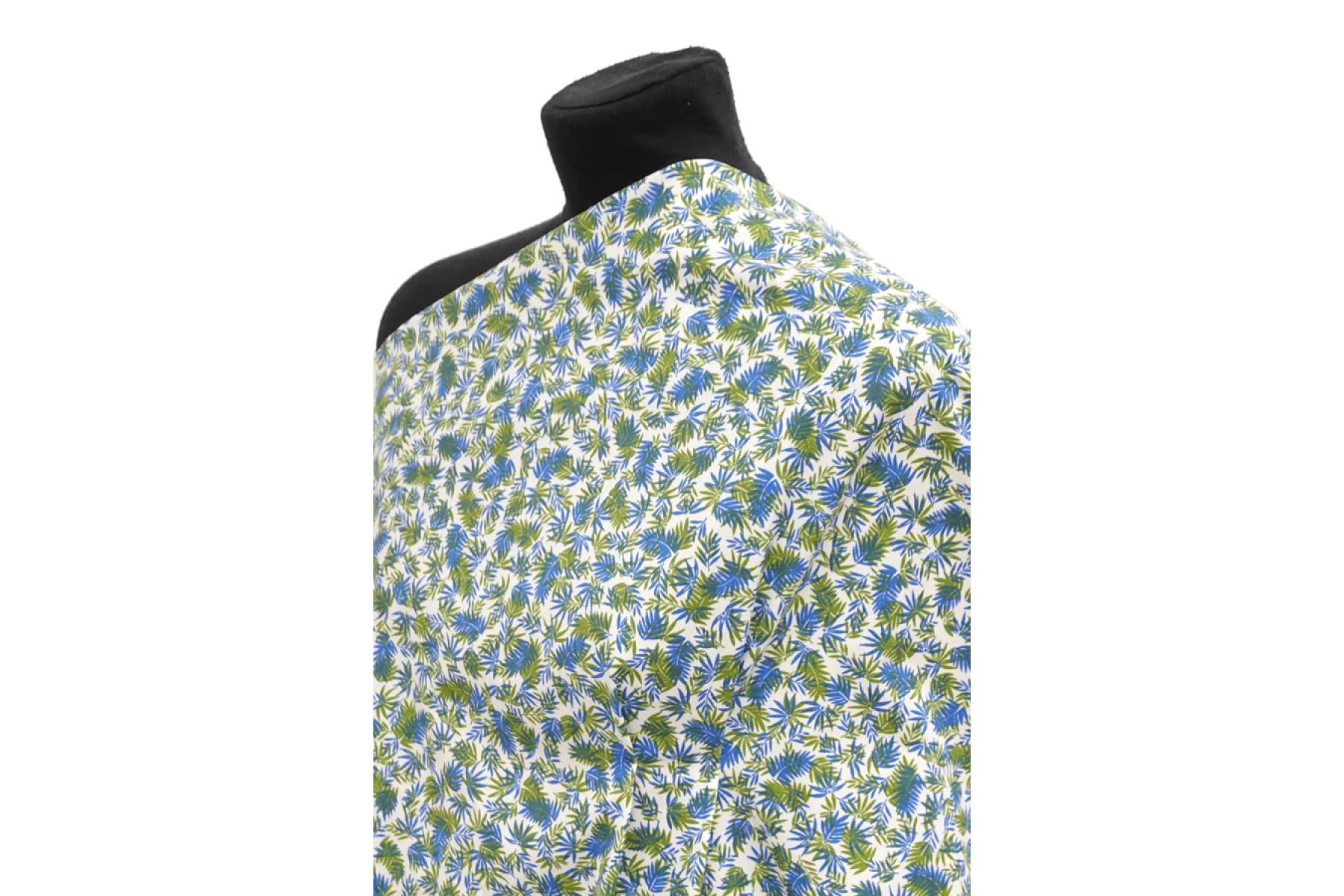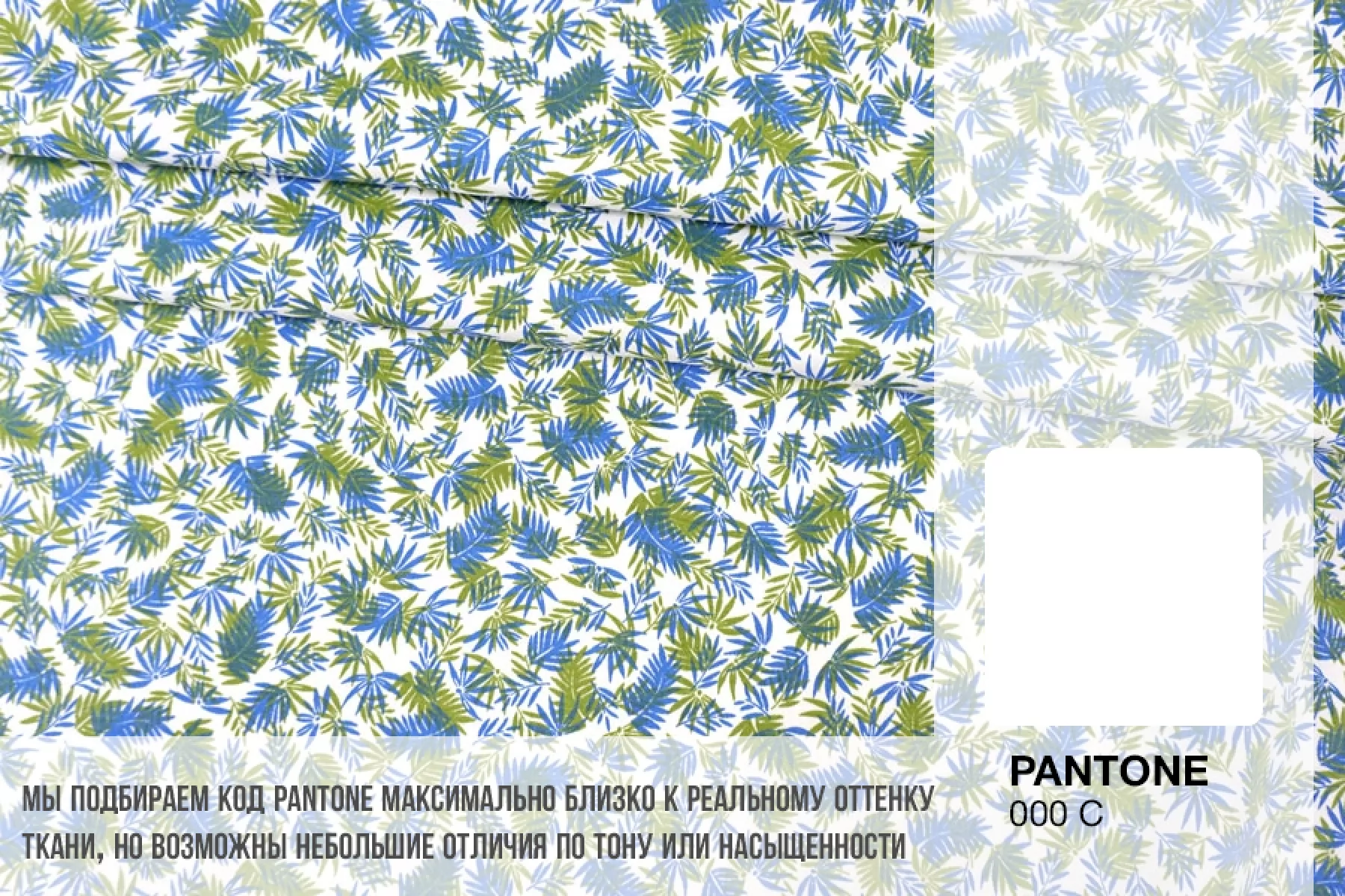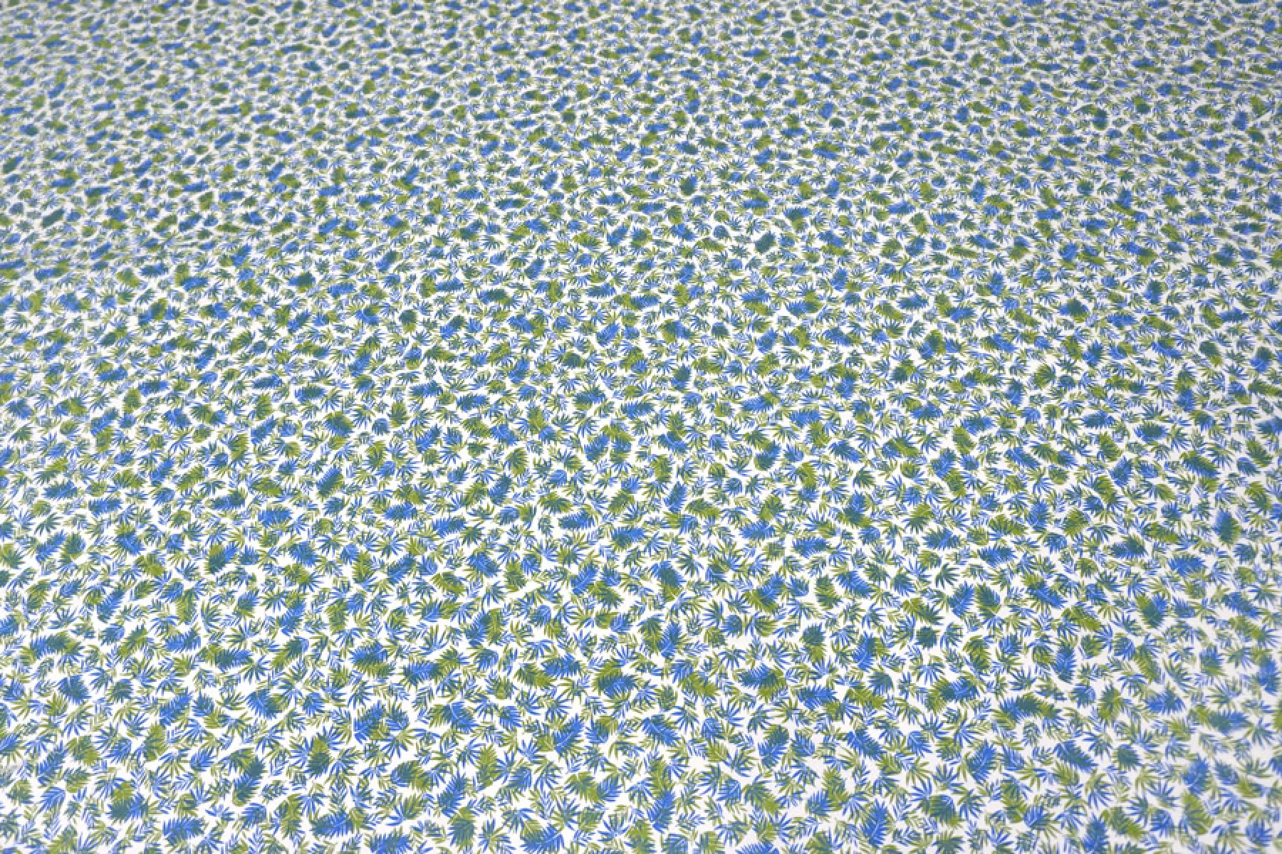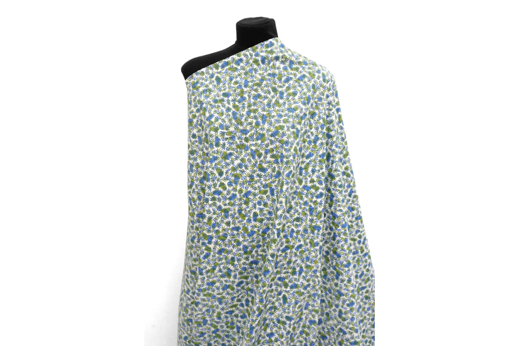 Костюмно-плательный хлопок от Monnalisa с принтом в виде листьев зеленого и сине-голубого цвета на белом фоне. Тактильно материал плотный, гладкий, плетение диагональное, присутствуют легкие утолщения нити утка. Отлично держит форму и драпируется. Тянется, мнется средне, не просвечивает. Прекрасно подойдет на платья, костюмные варианты, жакеты и юбки.