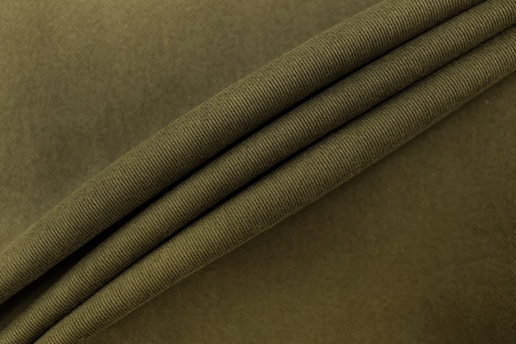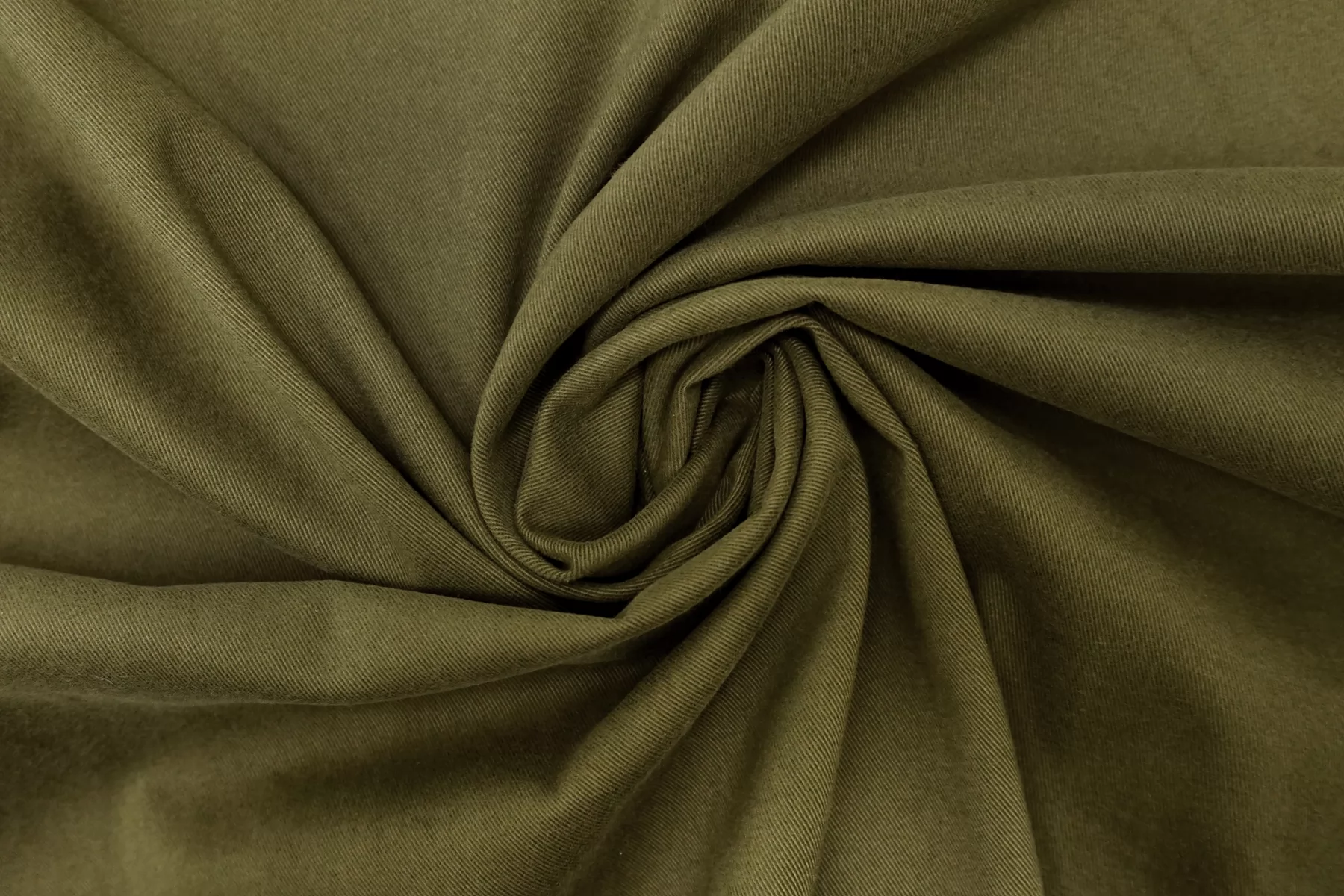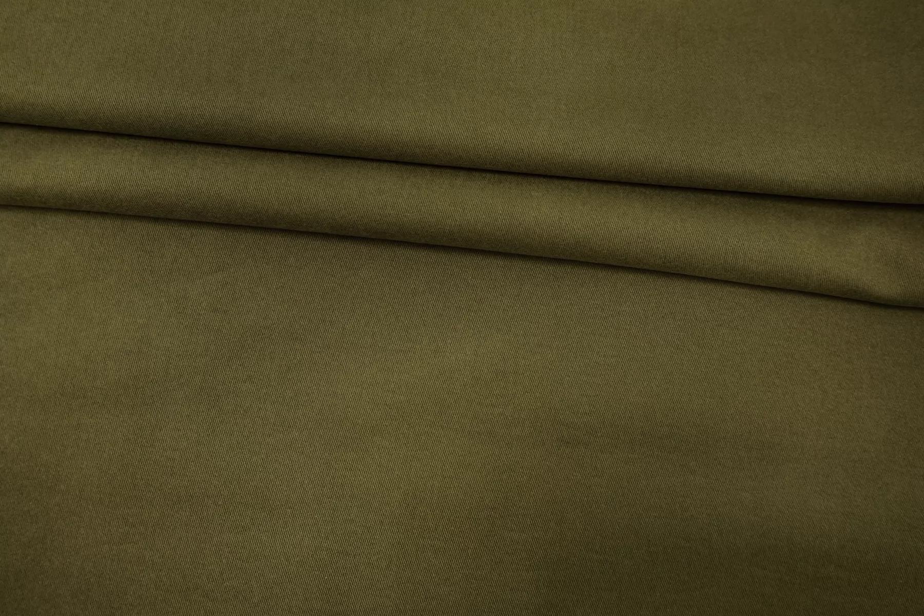 Классный костюмно-плательный хлопок, диагонального плетения, в защитном зелёном оттенке. Поверхность бархатистая, с peach - эффектом. Тактильно приятный, мягкий, пластичный. Достаточно плотненький, при этом тонкий. Не просвечивает. Сминается. Тянется. Умеренно держит форму, пластичный. Вариант на костюмы, платья, юбки, брюки.