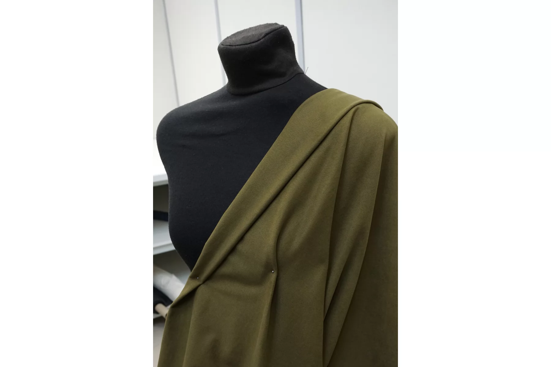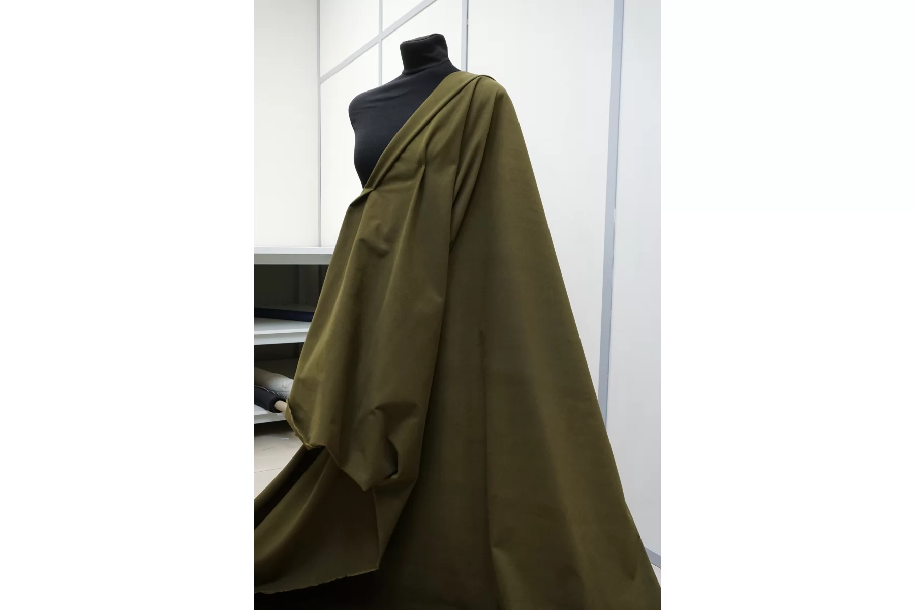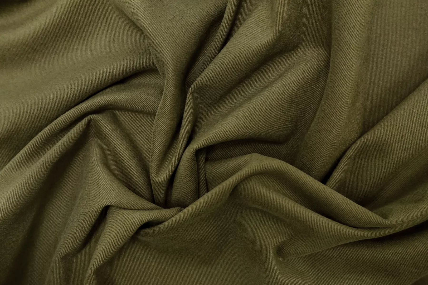 Классный костюмно-плательный хлопок, диагонального плетения, в защитном зелёном оттенке. Поверхность бархатистая, с peach - эффектом. Тактильно приятный, мягкий, пластичный. Достаточно плотненький, при этом тонкий. Не просвечивает. Сминается. Тянется. Умеренно держит форму, пластичный. Вариант на костюмы, платья, юбки, брюки.