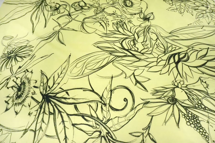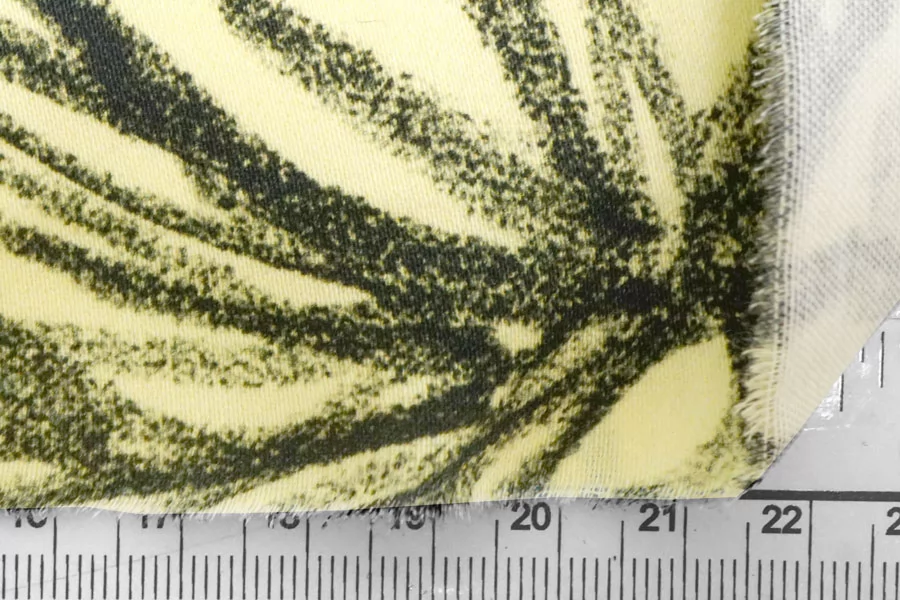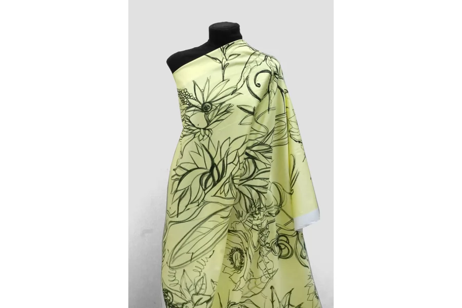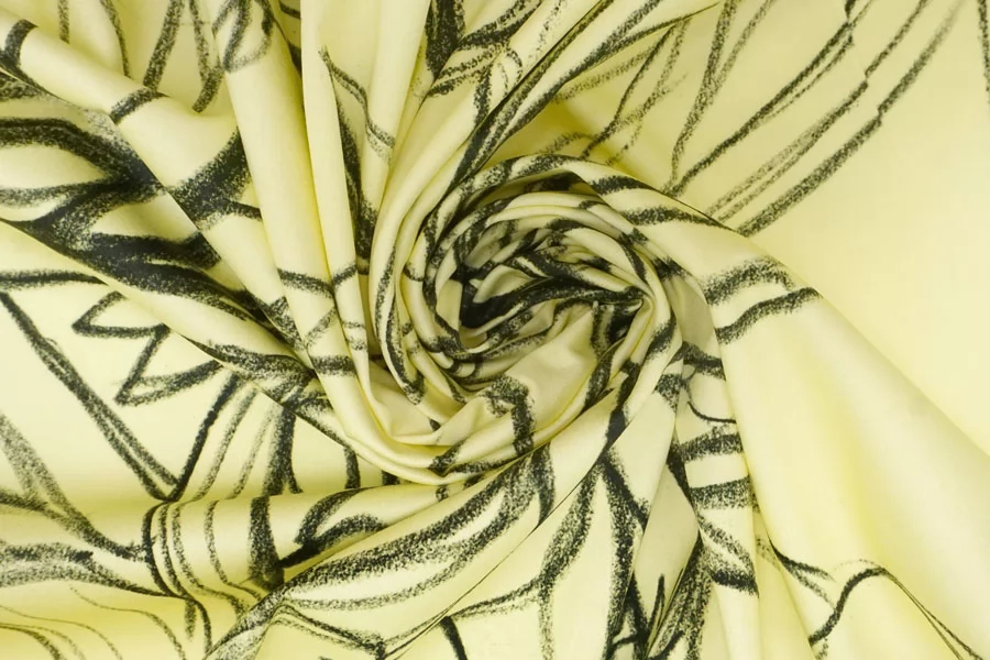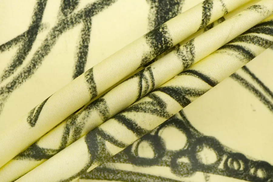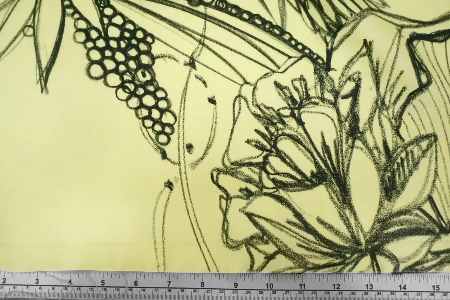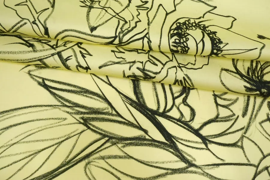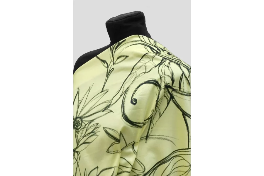 ВНИМАНИЕ!! Есть дефект принта см. фото. Костюмно-плательный хлопок от бренда Max Mara с черными абстрактными цветами в красивом лимонном цвете. Тонкий, очень приятный наощупь, слегка заметен силуэт, если смотреть прямо на просвет. Немного тянется за счет добавления эластана. Материал гладкий, с небольшим матовым лоском. Немного держит форму. Отличный вариант для летнего изделия - платья, рубашки, сарафана, кимоно.