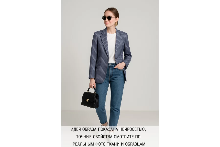 Классный хлопок с узором - полоской и ёлочкой, костюмно-плательной плотности. Узор соткан из нитей темно-синего и белого цвета. Нить слегка неравномерная, что создаёт визуально лёгкую "твидовость". Материал тактильно слегка суховатый. Тонкий, но плотный, хорошо тянется. Не просвечивает. Мнется, но частично восстанавливается. Держит форму. Отлично подойдет для пошива костюмов, брюк, юбок, шорт, платьев. Учитывайте усадку.