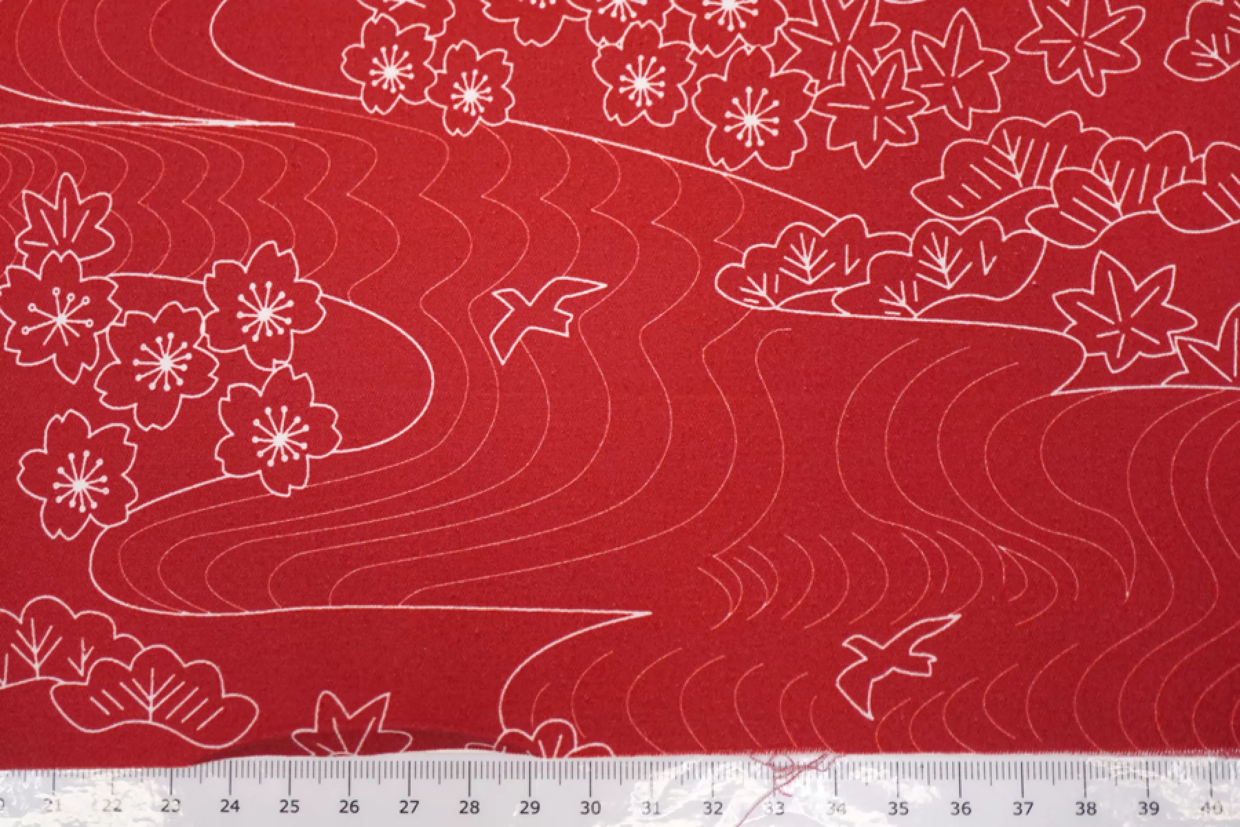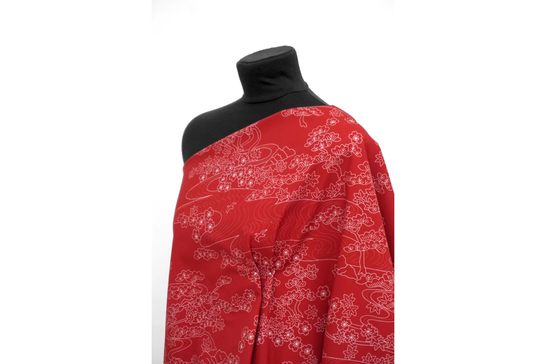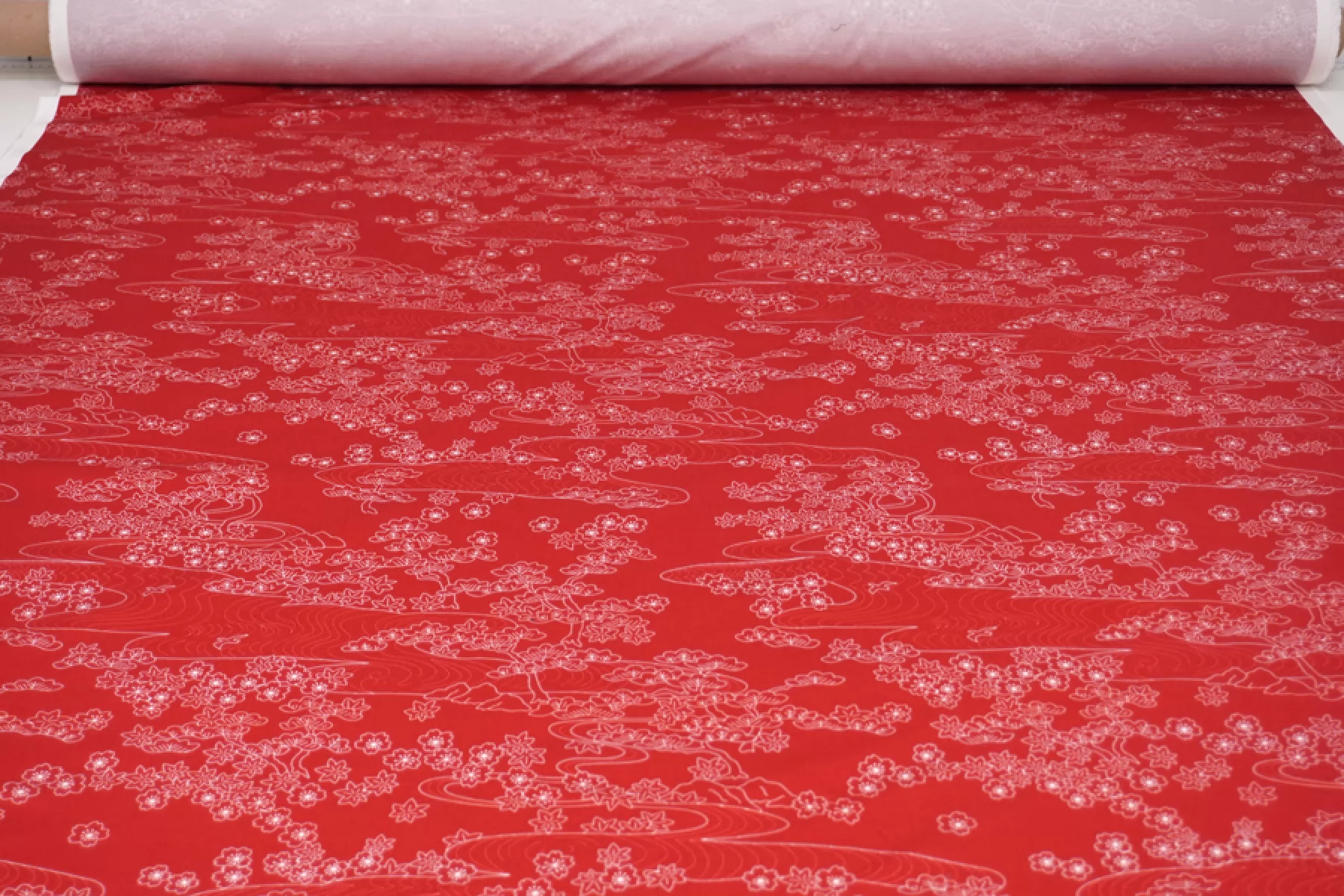 Костюмно-плательный хлопок ягодно-красного оттенка с принтом в виде восточных мотивов: река, птицы, деревья и цветение сакуры. Рисунок выполнен белым контуром. Материал мягкий, пластичный. Отлично и упруго тянется за счет эластана. Не просвечивает. Достаточно тонкий, но плотный. Хорошо драпируется и держит форму. Мнется. Отличный вариант на платья, костюмы, юбки, жакеты и не только.