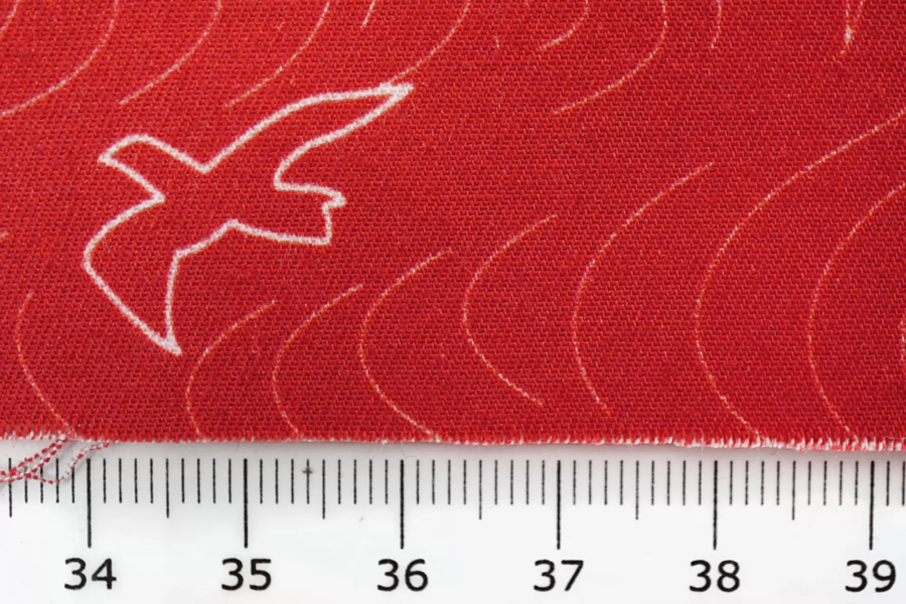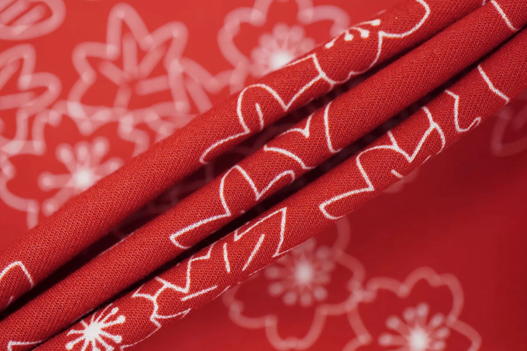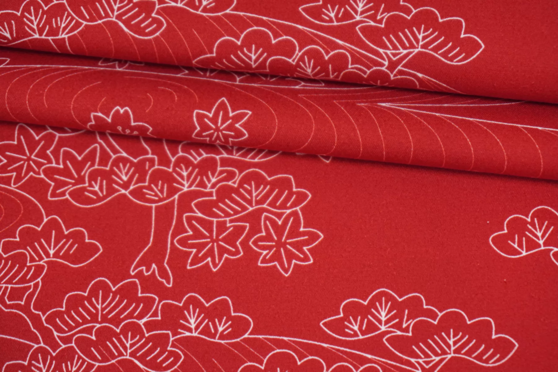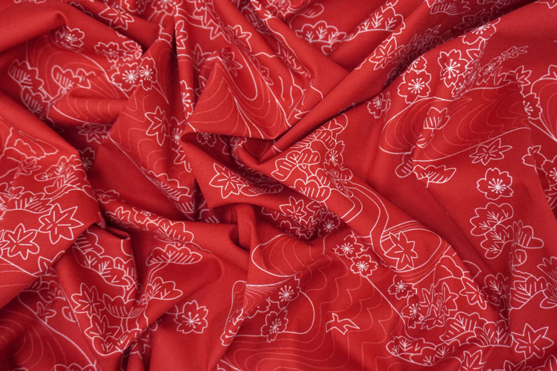 Костюмно-плательный хлопок ягодно-красного оттенка с принтом в виде восточных мотивов: река, птицы, деревья и цветение сакуры. Рисунок выполнен белым контуром. Материал мягкий, пластичный. Отлично и упруго тянется за счет эластана. Не просвечивает. Достаточно тонкий, но плотный. Хорошо драпируется и держит форму. Мнется. Отличный вариант на платья, костюмы, юбки, жакеты и не только.