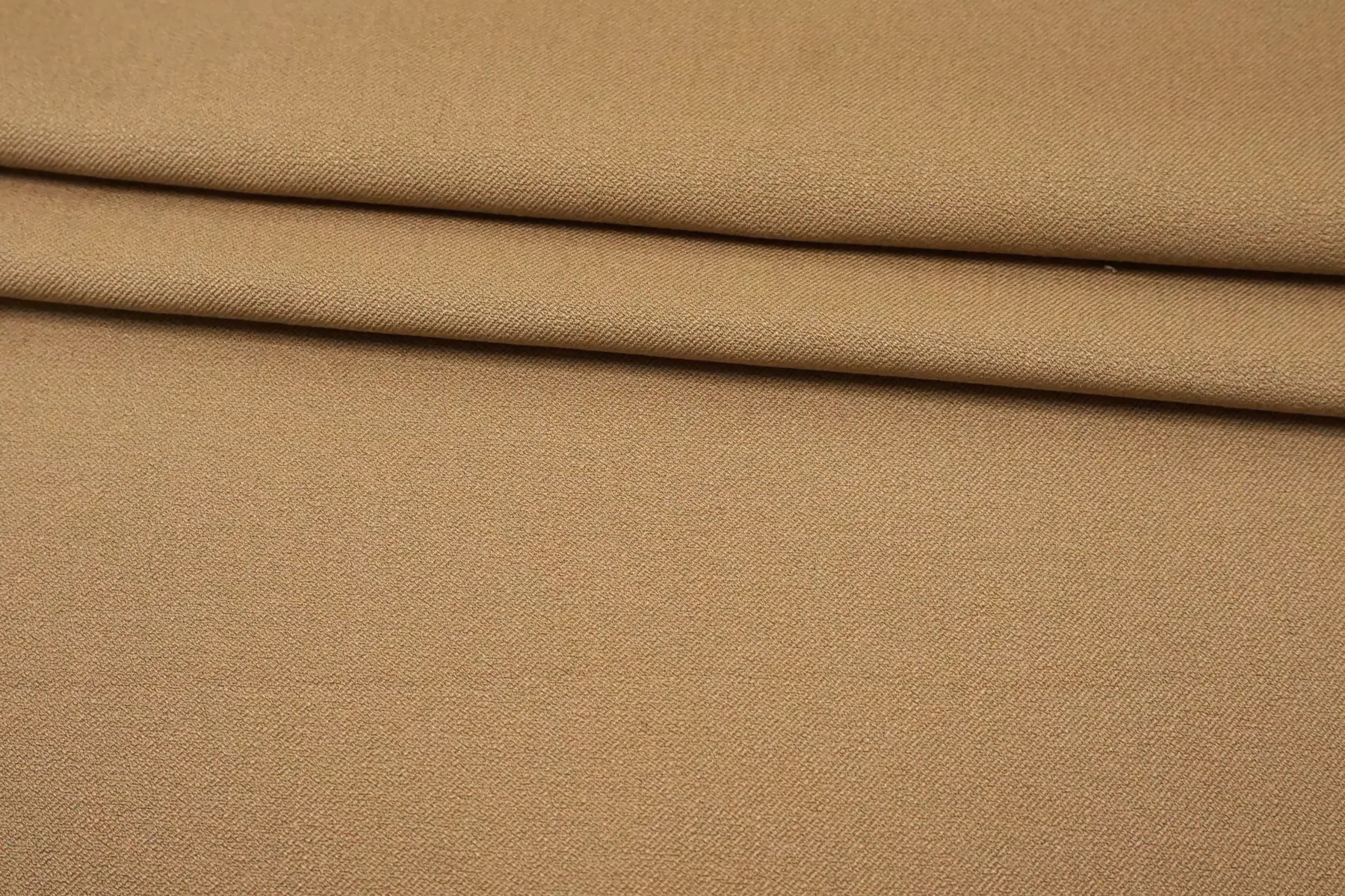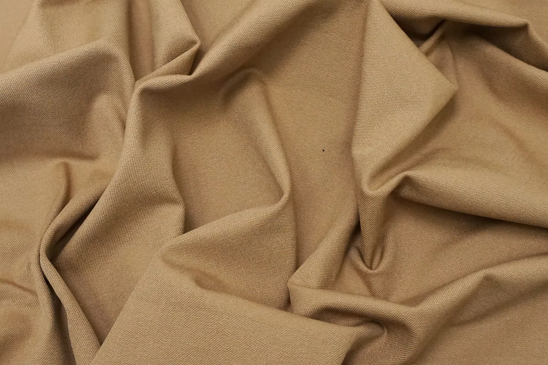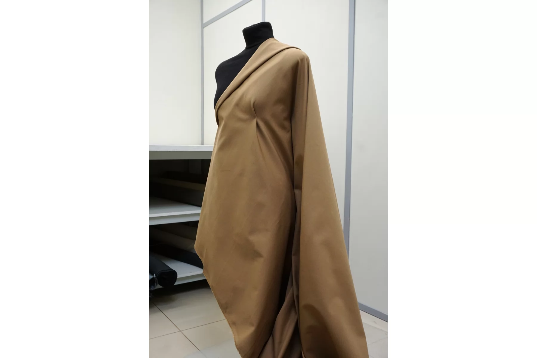 Отличного качества костюмный хлопок диагонального плетения в красивом песочно-бежевом оттенке, близком к цвету кэмел. Рубчик слабо выражен, ткань хорошо тянется по всем направлениям (би-стрейч). Тактильно материал приятный. Не просвечивает, упругий. Мнется слабо, держит форму. Шьем костюмы, платья, юбки, брюки. Можно использовать и для пошива тренча либо пыльника, но учитывайте что материал сразу промокает.
