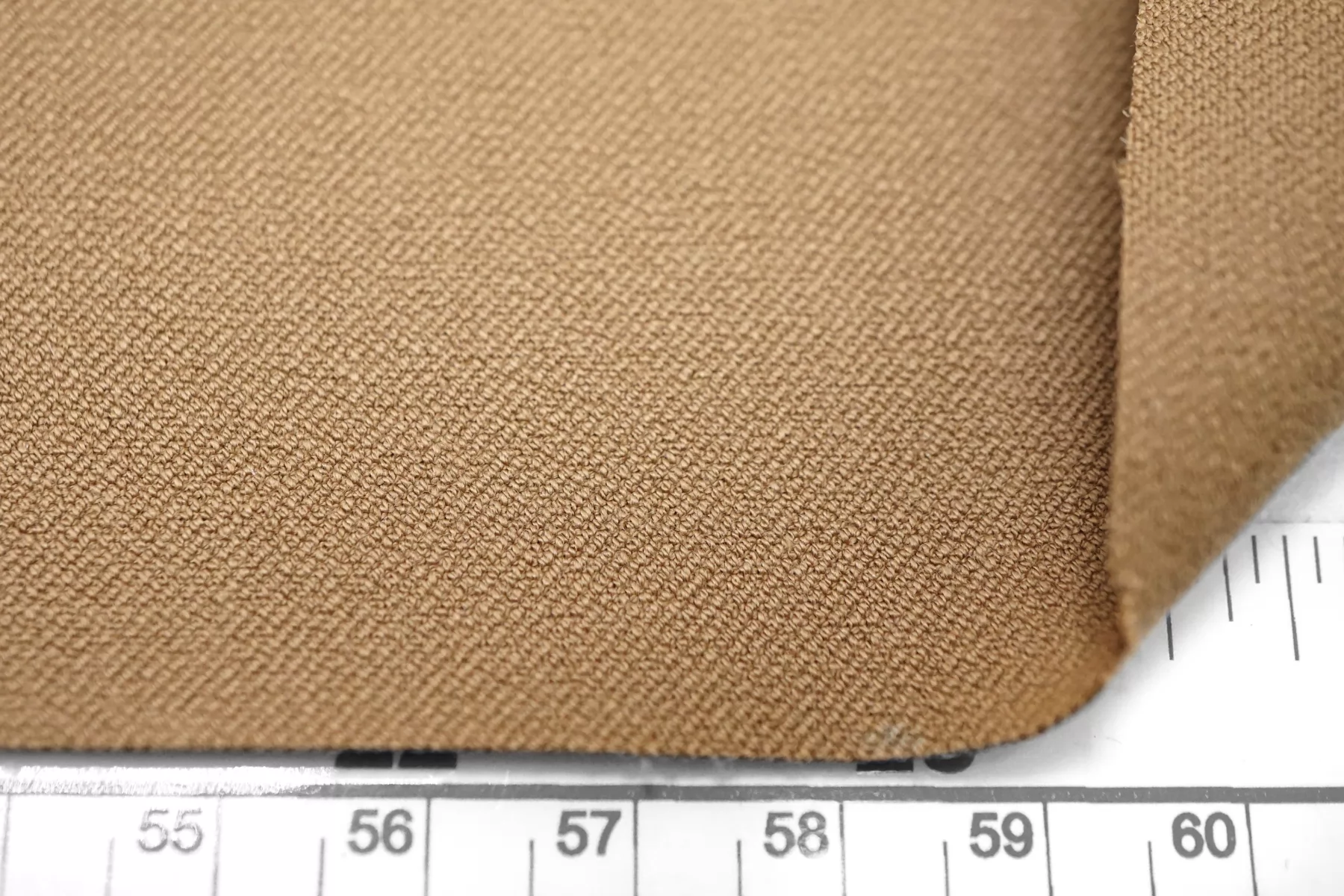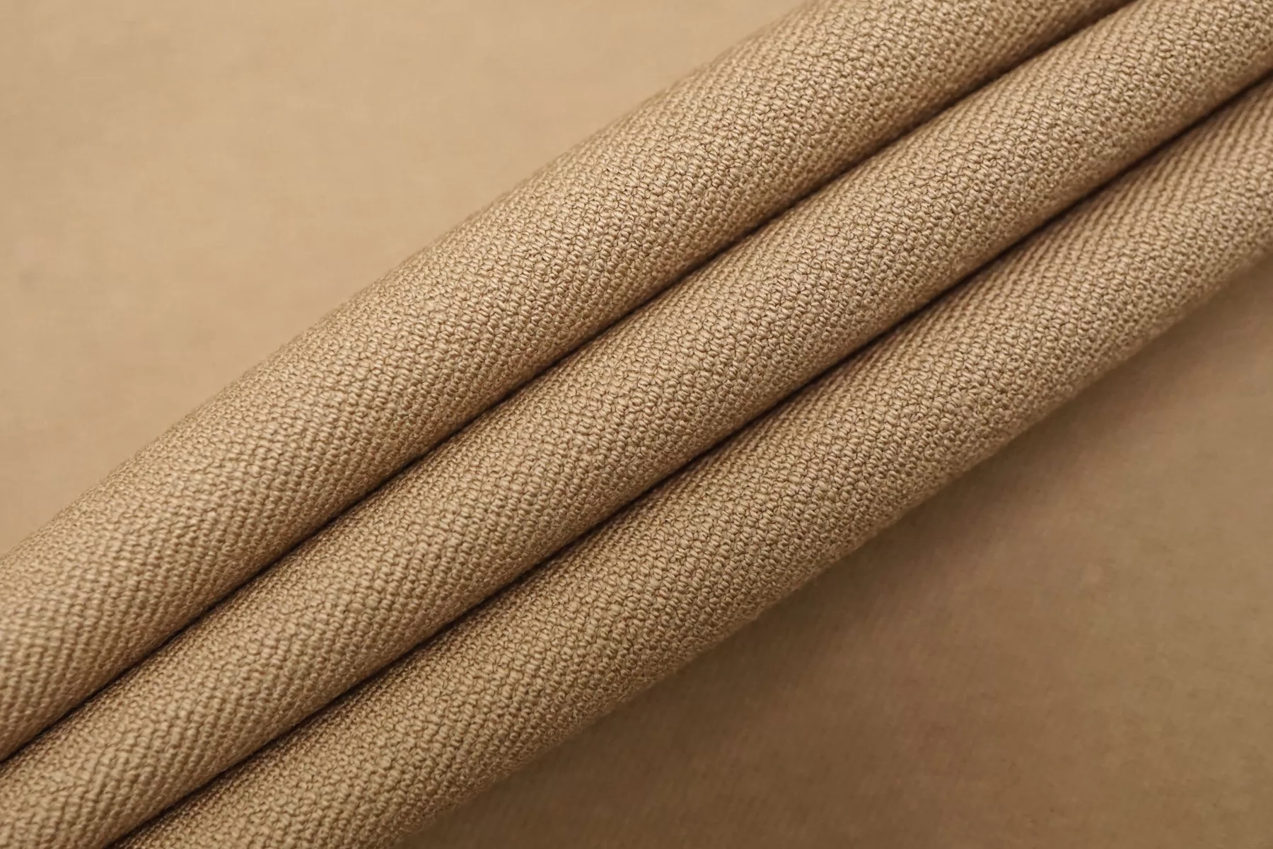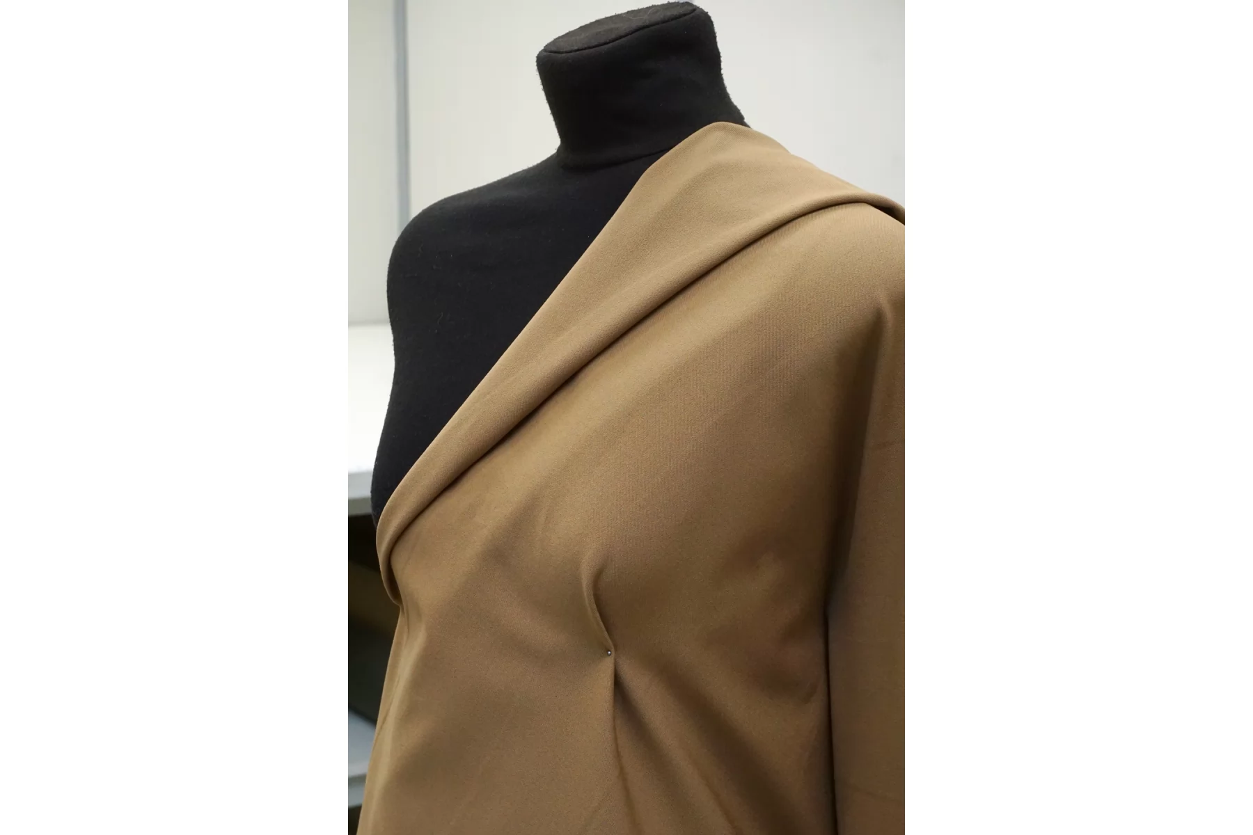 Отличного качества костюмный хлопок диагонального плетения в красивом песочно-бежевом оттенке, близком к цвету кэмел. Рубчик слабо выражен, ткань хорошо тянется по всем направлениям (би-стрейч). Тактильно материал приятный. Не просвечивает, упругий. Мнется слабо, держит форму. Шьем костюмы, платья, юбки, брюки. Можно использовать и для пошива тренча либо пыльника, но учитывайте что материал сразу промокает.