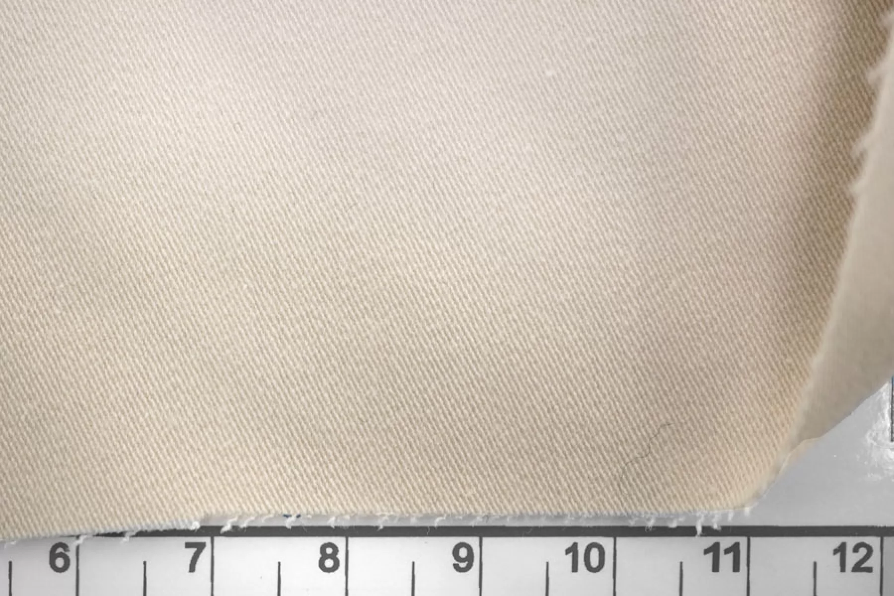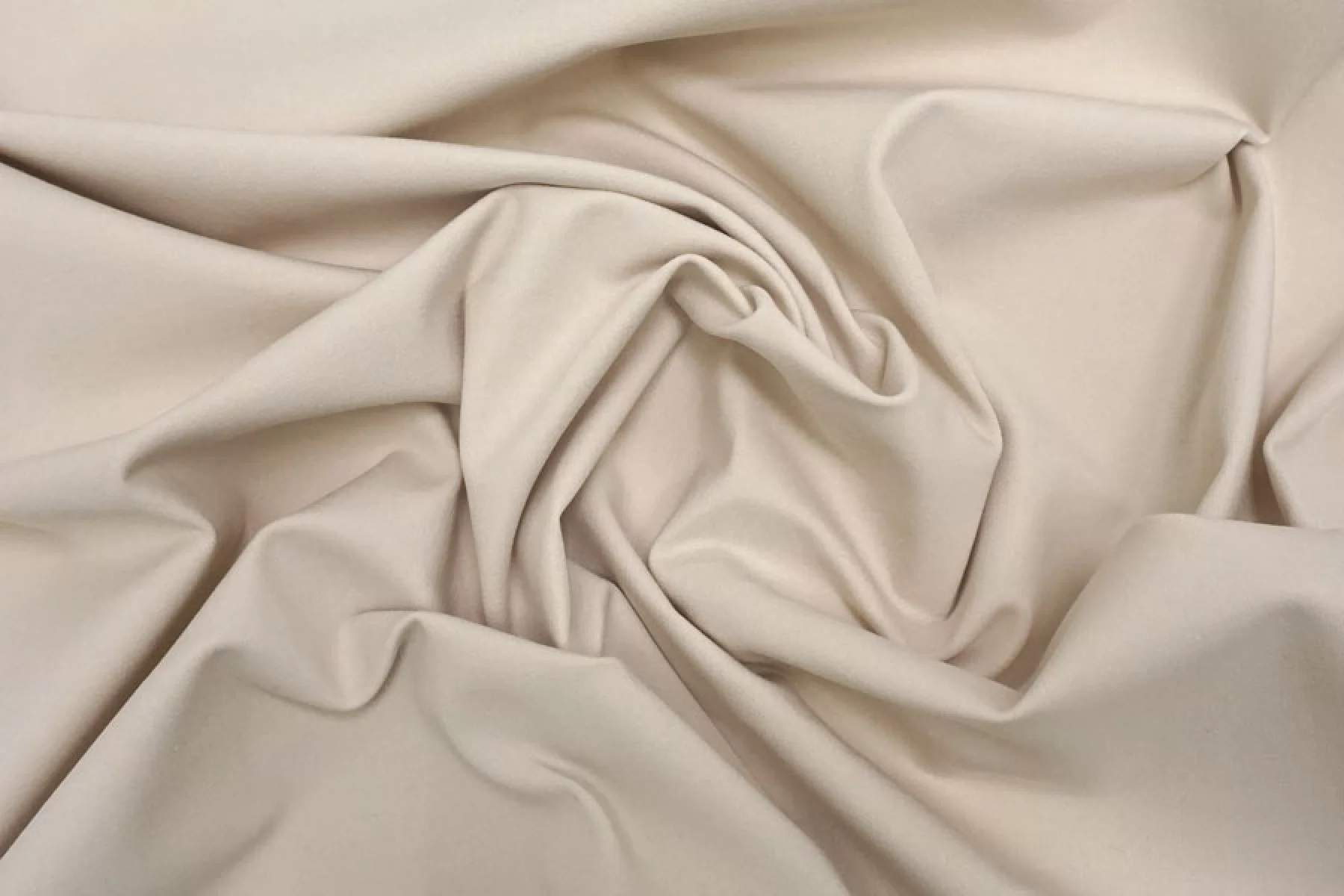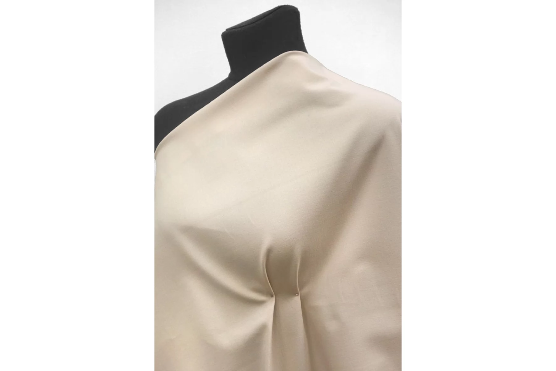 Отличного качества костюмный хлопок диагонального плетения в светлом бежевом цвете с лёгким серым подтоном. Рубчик слабо выражен, ткань хорошо тянется по всем направлениям (би-стрейч). Тактильно материал приятный. Не просвечивает, упругий. Мнется слабо, держит форму. Шьем костюмы, платья, юбки, брюки. Можно использовать и для пошива тренча либо пыльника, но учитывайте что материал сразу промокает.