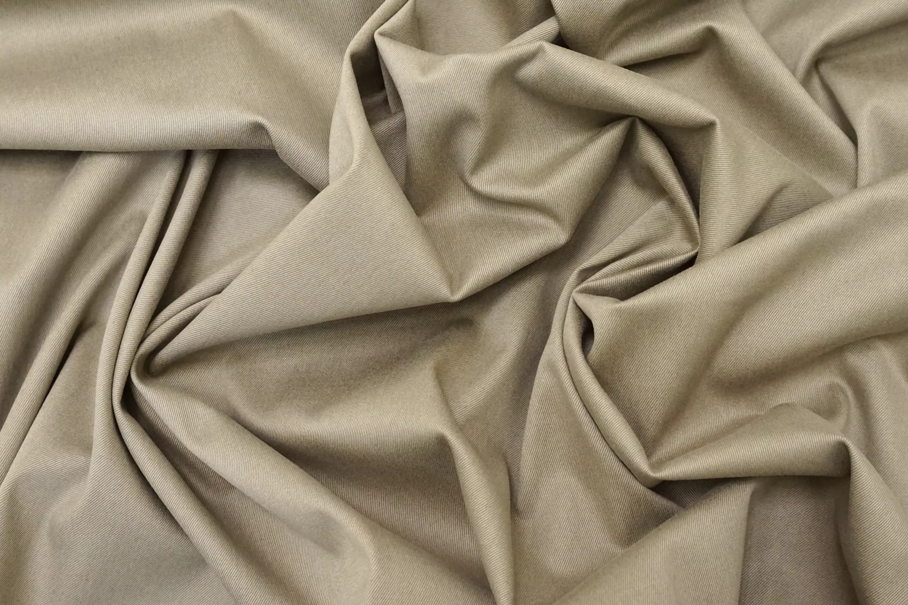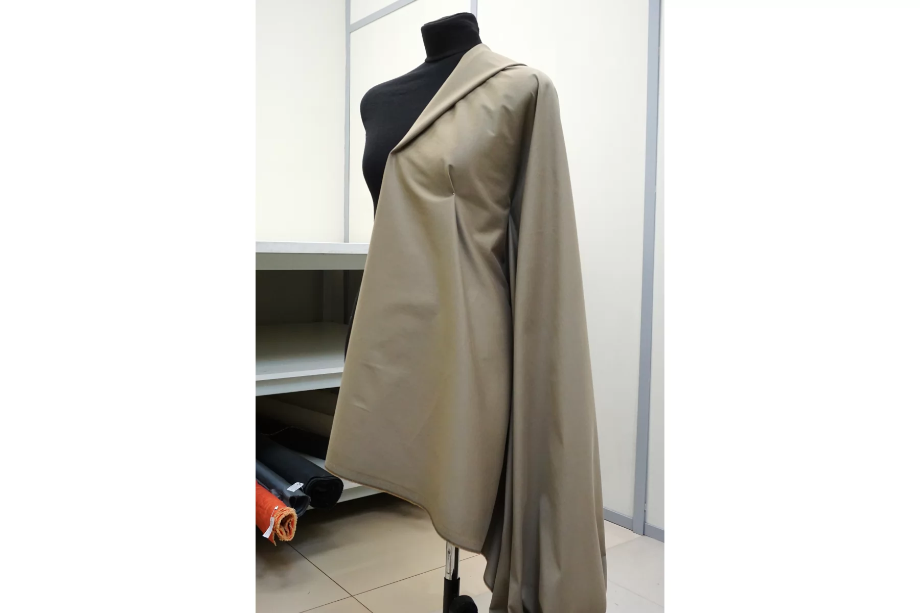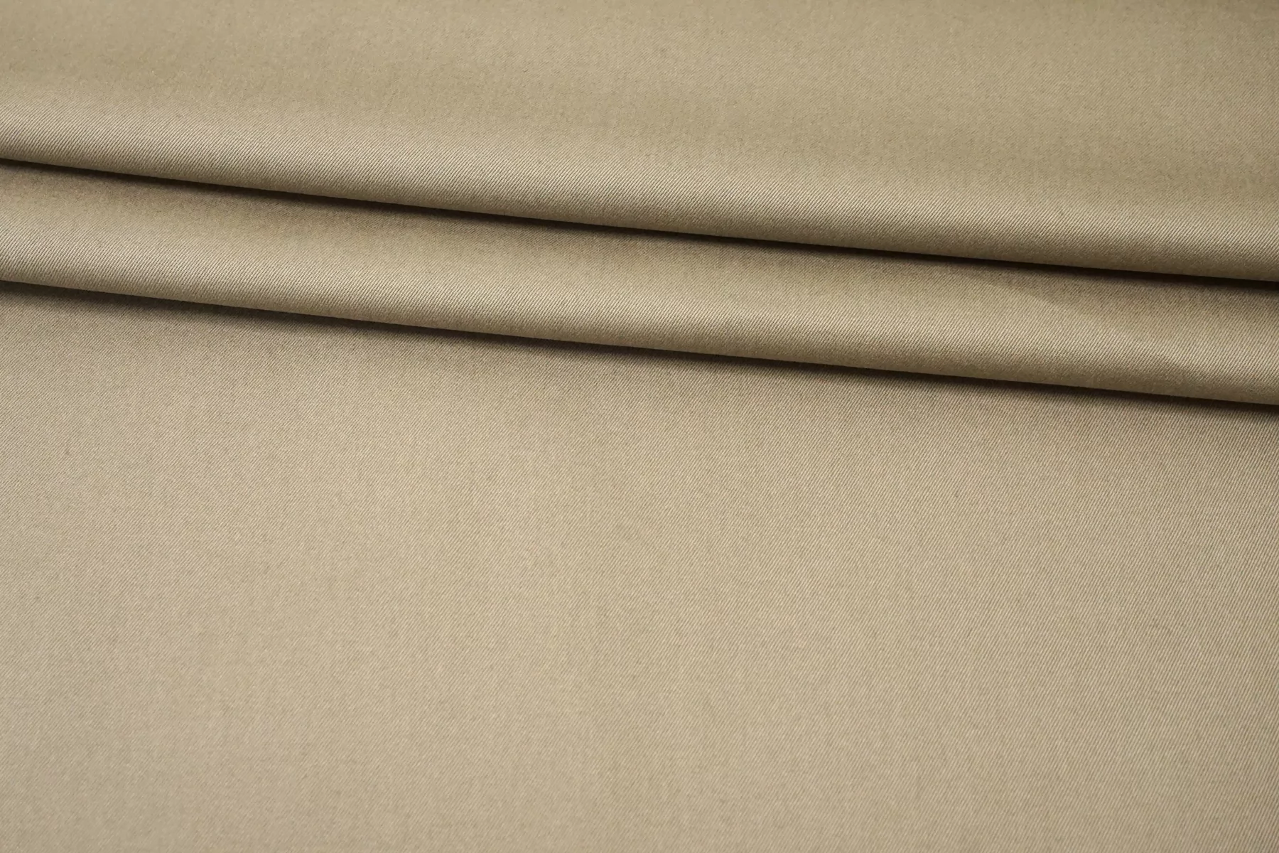 Хлопок костюмной плотности, диагонального плетения, в ненасыщенном, сложном сером цвете с очень лёгким зеленовато-бежевым подтоном. Тактильно приятный, велюристый, не грубый. Пластичный но форму держит. Мнется умеренно, тянется, не просвечивает. Отлично подойдет для пошива летних костюмов, брюк, юбок, платьев-сафари, можно на пыльник или тренч, но учитывайте что ткань воду не отталкивает.