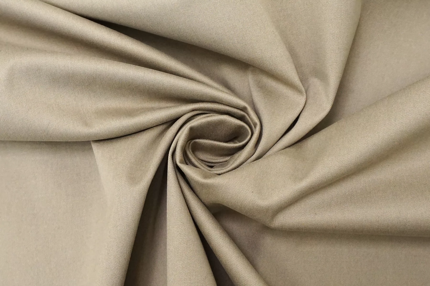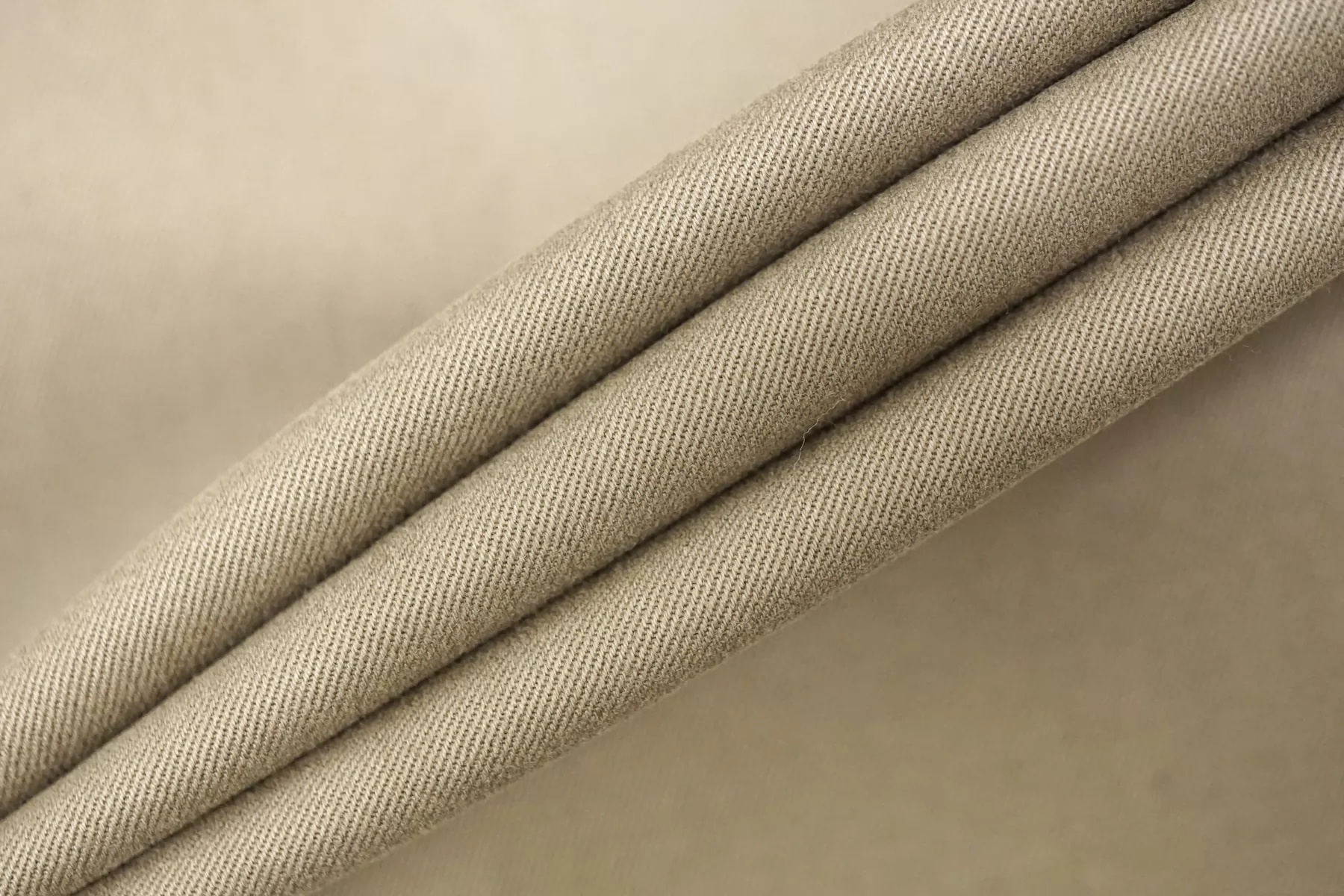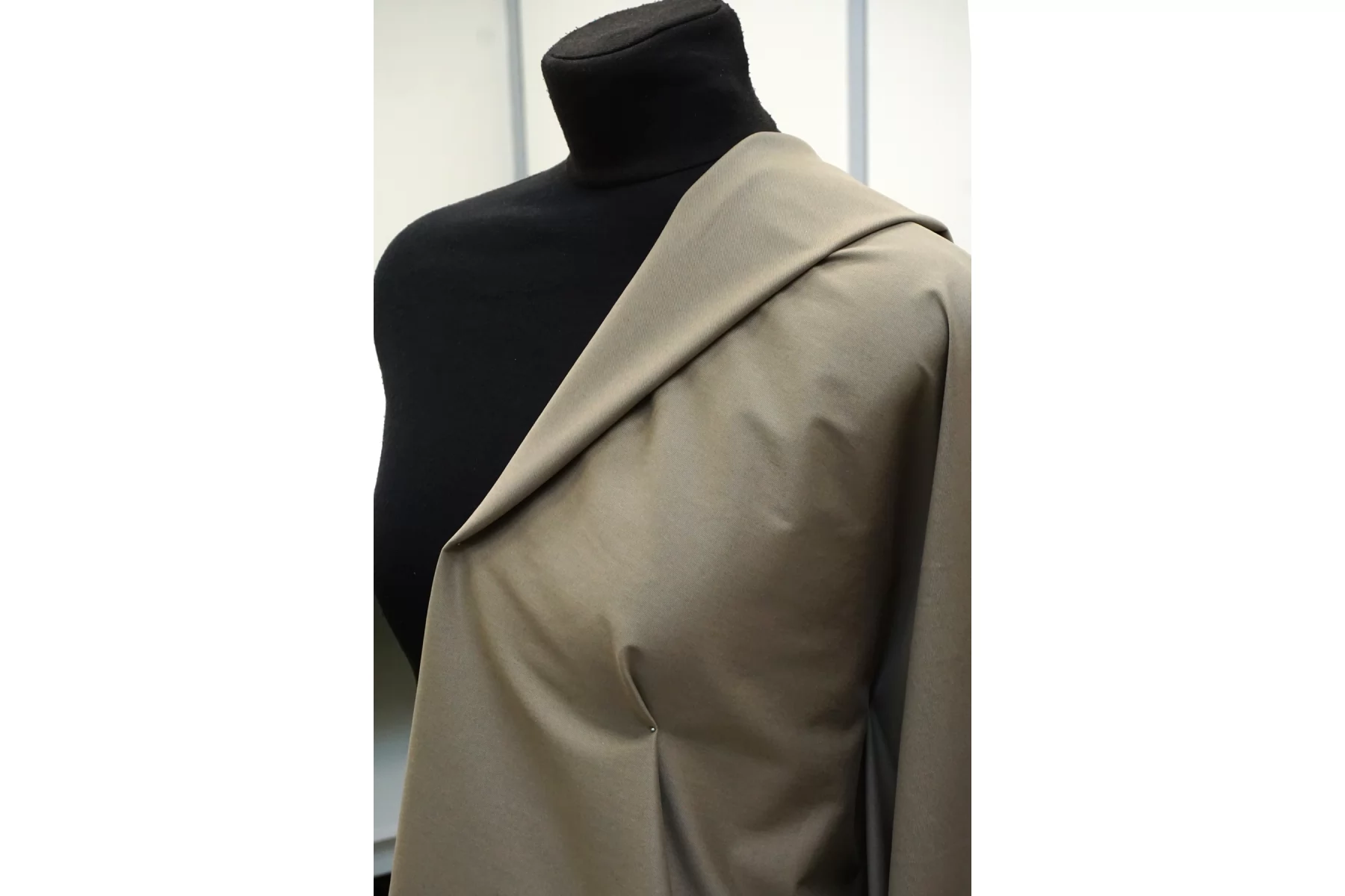 Хлопок костюмной плотности, диагонального плетения, в ненасыщенном, сложном сером цвете с очень лёгким зеленовато-бежевым подтоном. Тактильно приятный, велюристый, не грубый. Пластичный но форму держит. Мнется умеренно, тянется, не просвечивает. Отлично подойдет для пошива летних костюмов, брюк, юбок, платьев-сафари, можно на пыльник или тренч, но учитывайте что ткань воду не отталкивает.