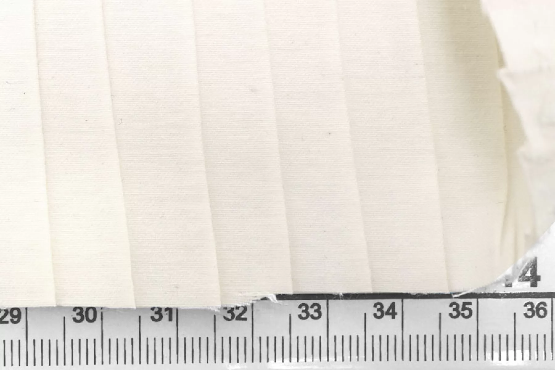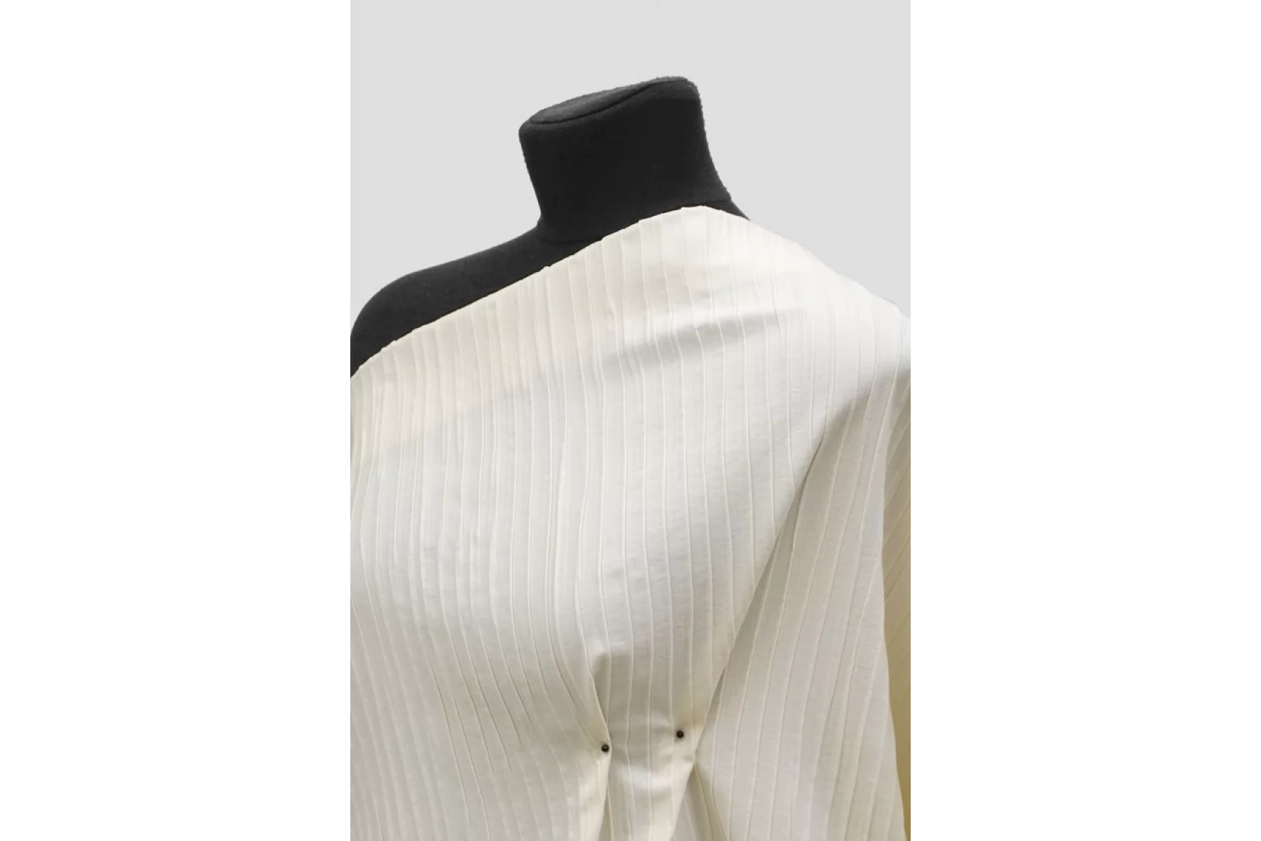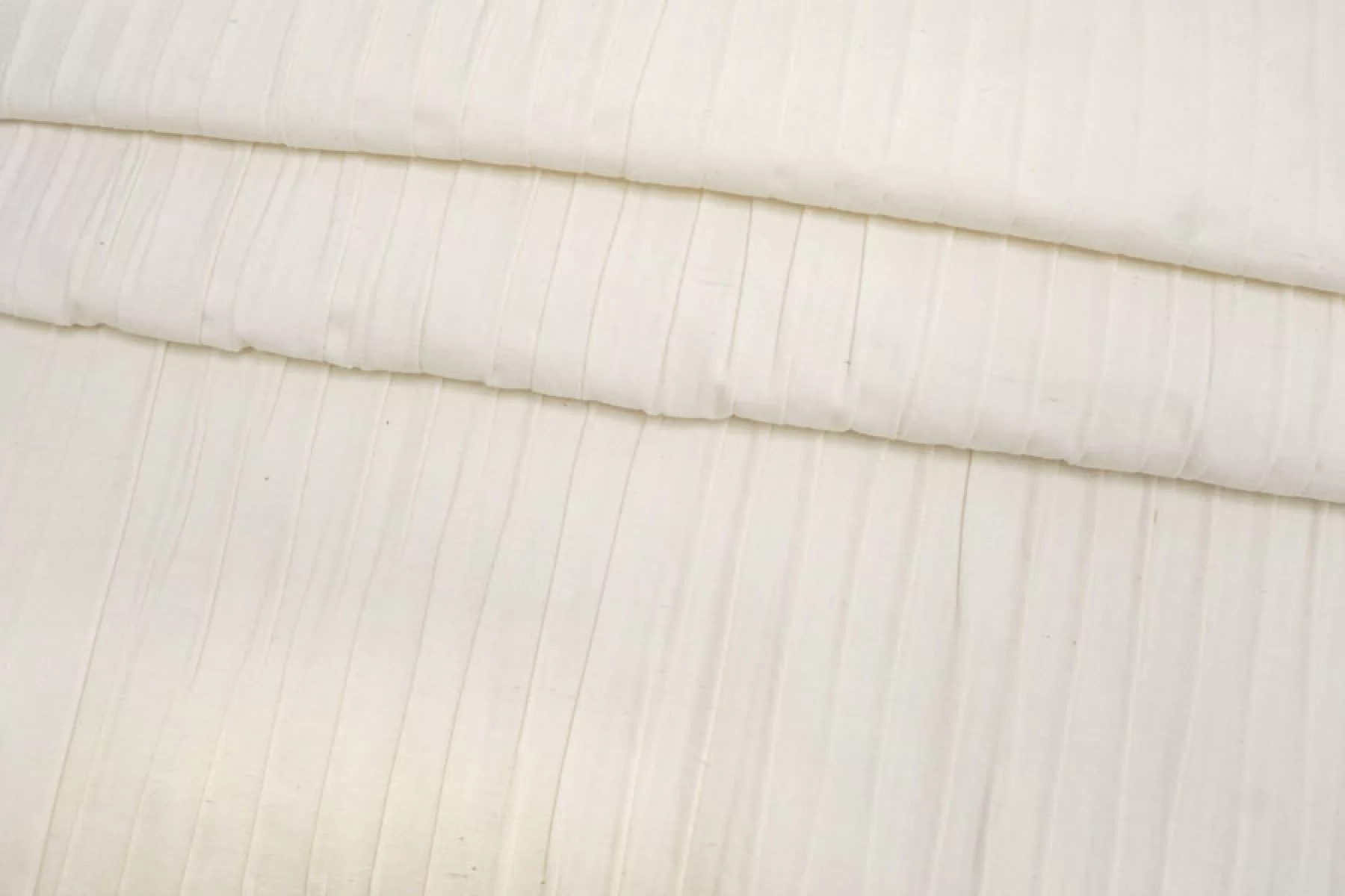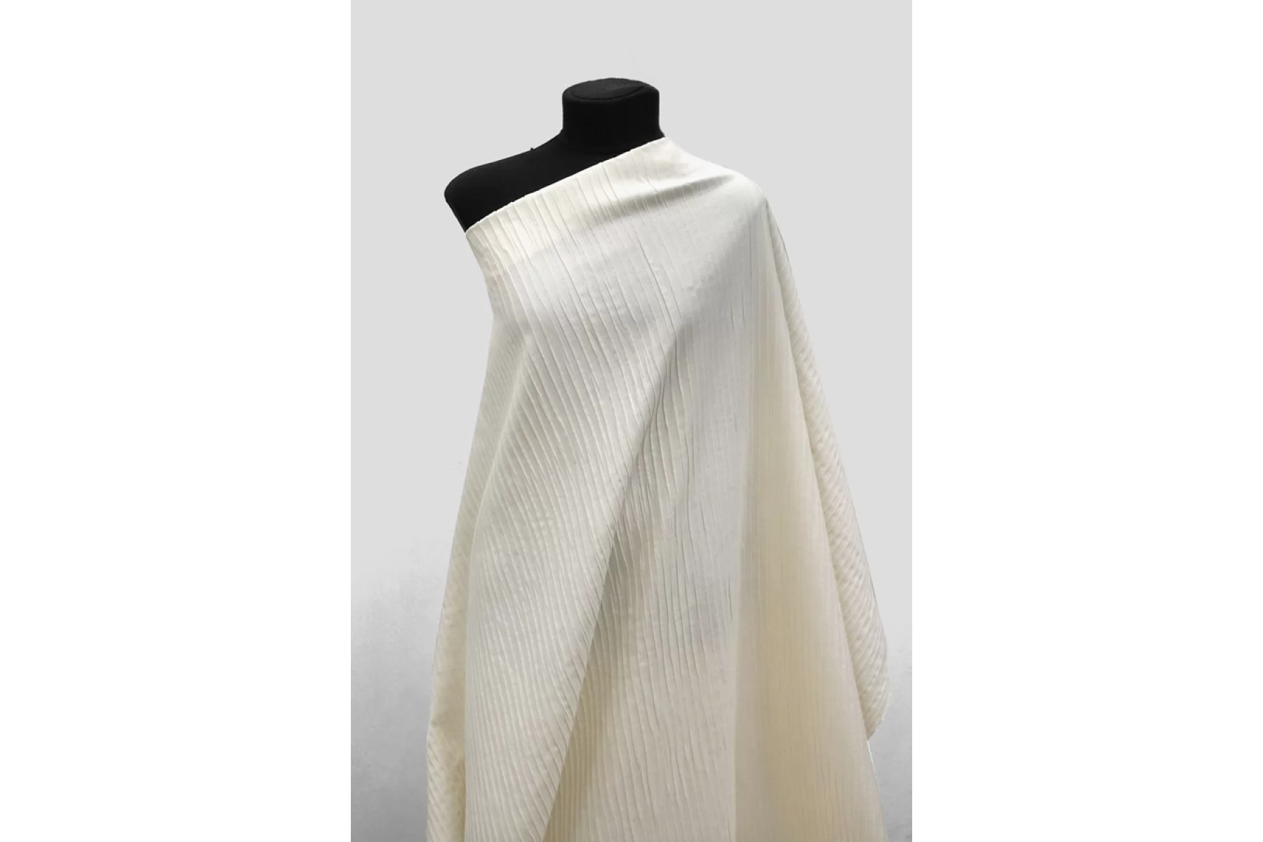 ВНИМАНИЕ!! Присутствуют вкрапления и чёрные полосы см. фото. Необычный хлопок, с складками как у плиссе, но они сохраняют форму благодаря особому плетению. Цвет светлый молочный, лицевая часть с добавкой акрила, изнанка хлопковая. Плотность костюмная, форму материал держит. Немного тянется благодаря растяжению складок. Просвечивает минимально силуэт. Подойдет для пошива необычных жакетов, платьев, юбок. Учитывайте усадку.