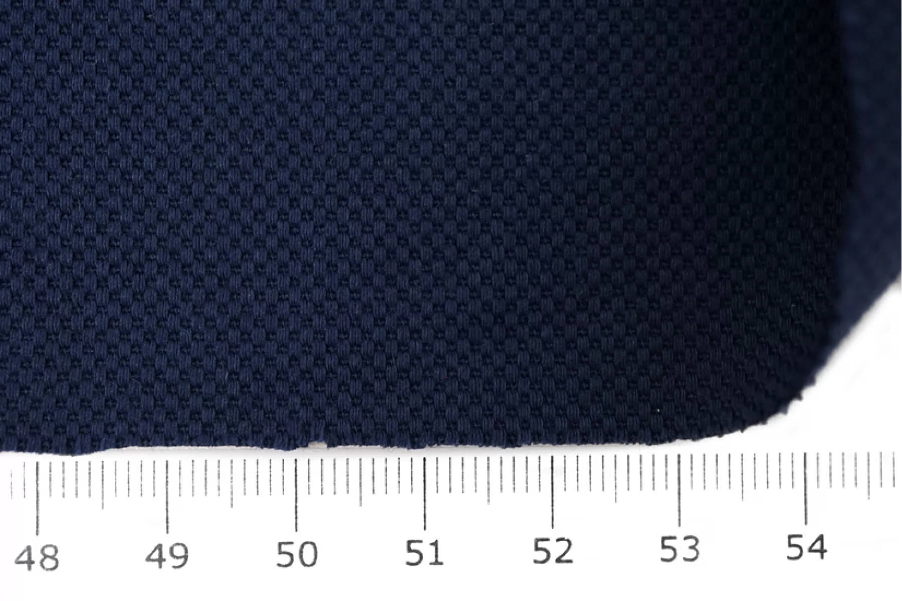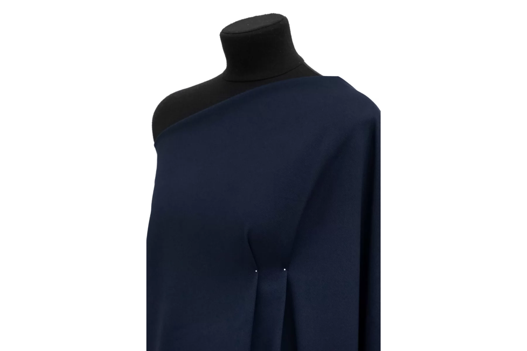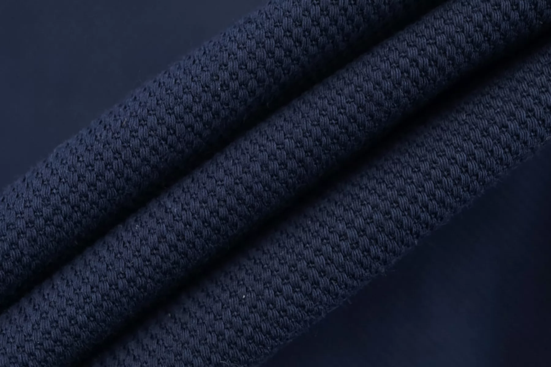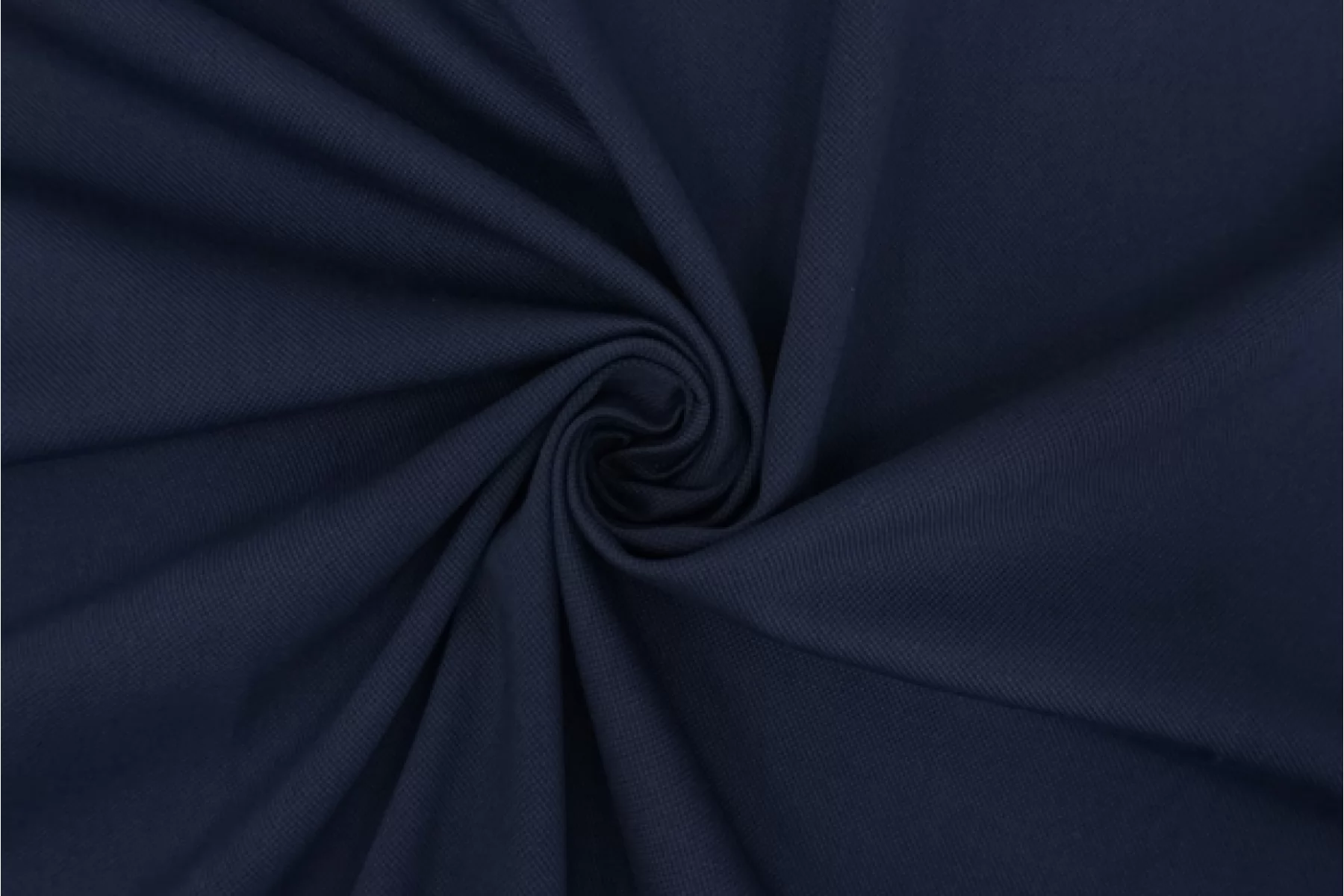 Костюмный фактурный хлопок, выработка отдаленно напоминает рисунок пике, темно-синего цвета. Материал тактильно приятный, плотный, ощущается фактура плетения. Не просвечивает и не тянется. Неплохо держит форму. Обладает легким лоском. Немного мнется. Классный вариант на жакеты, костюмы, платья, юбки и бомберы.