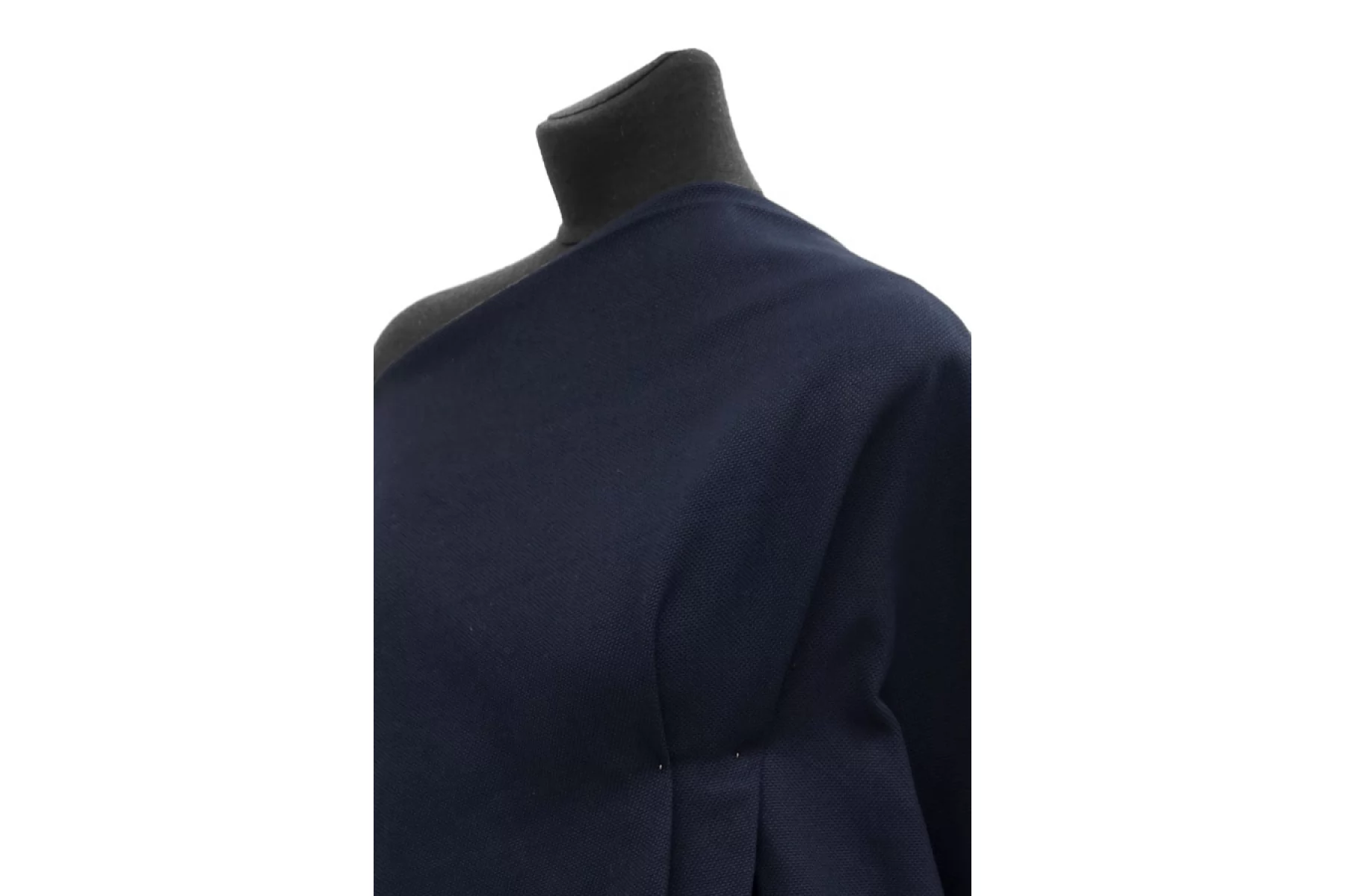 Хлопок фактурный костюмной плотности в темно-синем цвете. Материал тактильно приятный, не просвечивает, не тянется, держит форму. Идеально подойдет на летние костюмы - как мужские, так и женские, жакеты в стиле шанель, платья и юбки (учитывайте, что не тянется). Уход деликатный.