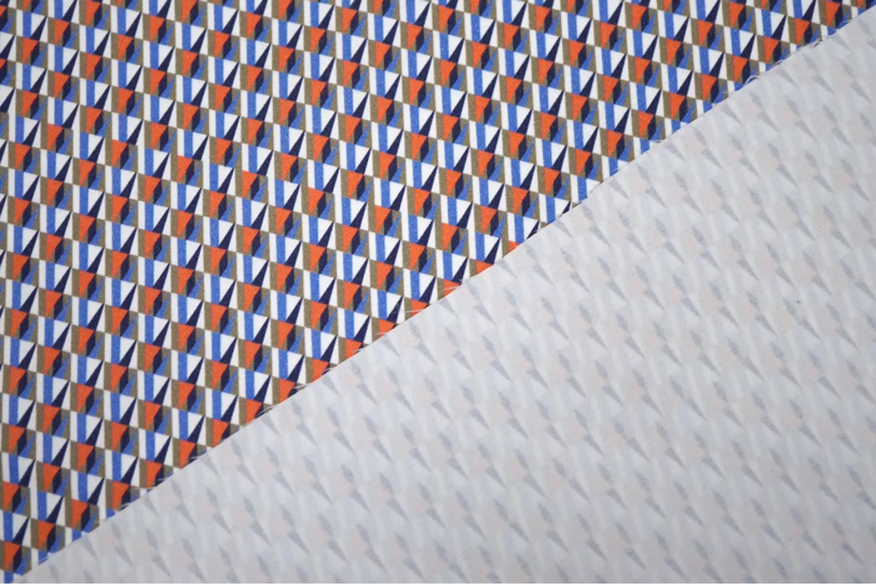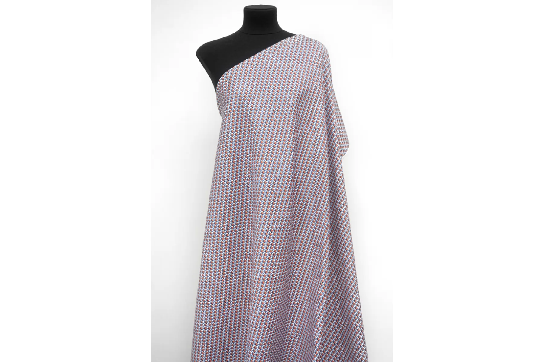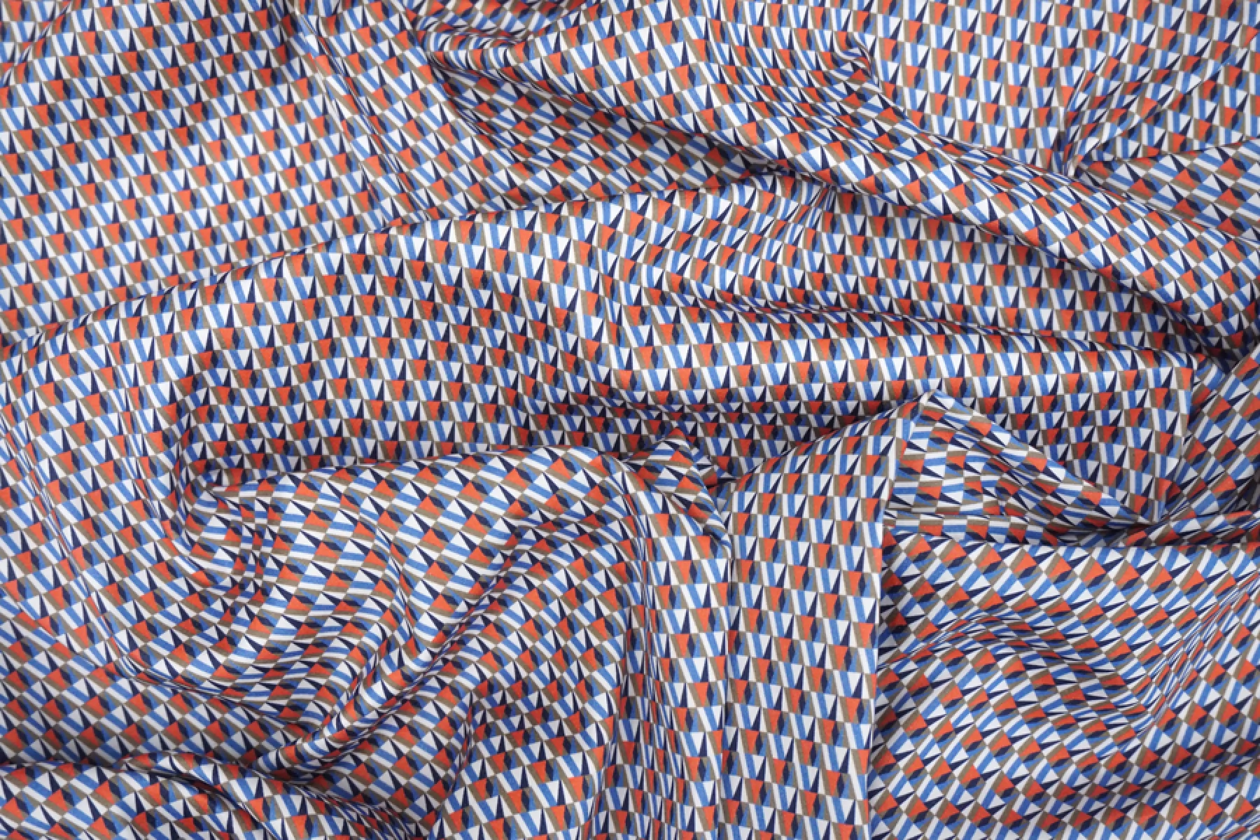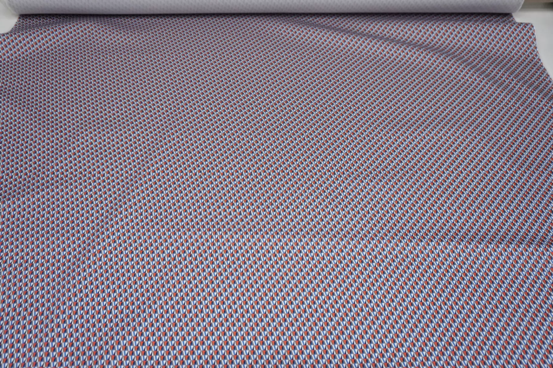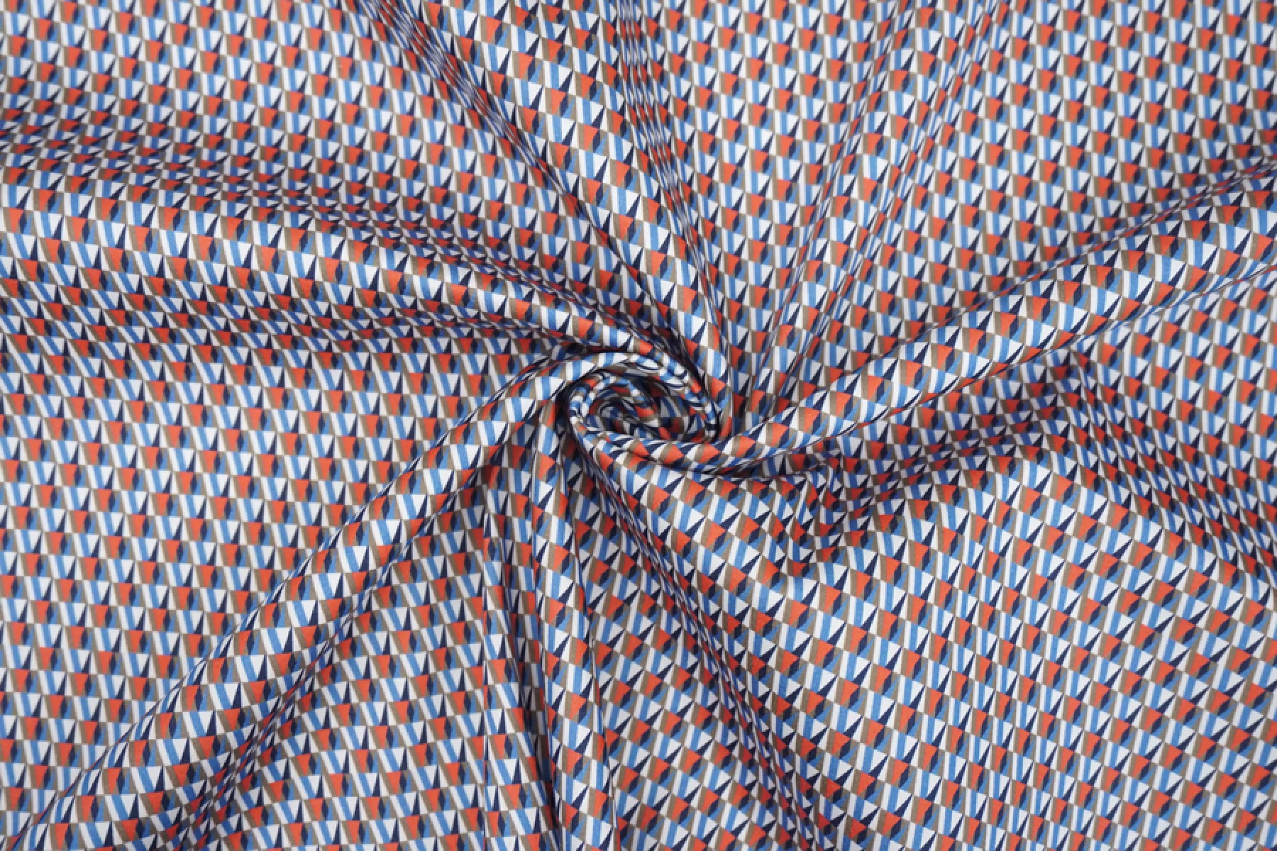 Костюмный хлопок-стрейч с геометрическим принтом в оттенках красного, синего, белого и черного. Материал тактильно приятный, мягкий. Отлично тянется за счет содержания эластана. Немного мнется, но восстанавливается. Не просвечивает, достаточно плотненький. Отлично держит форму и красив в складке. Шьем костюмные варианты, жакеты, юбки, брюки и не только.