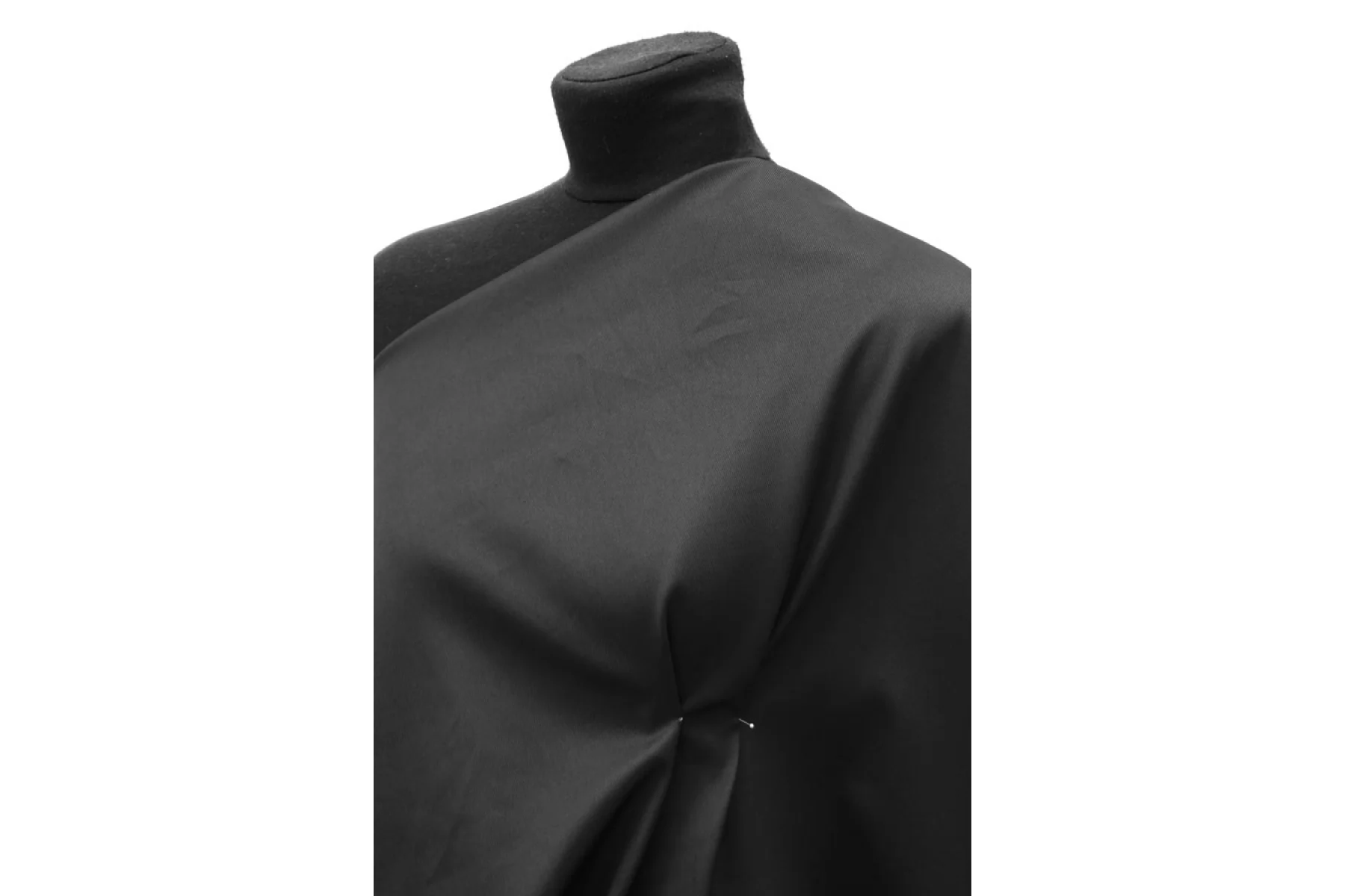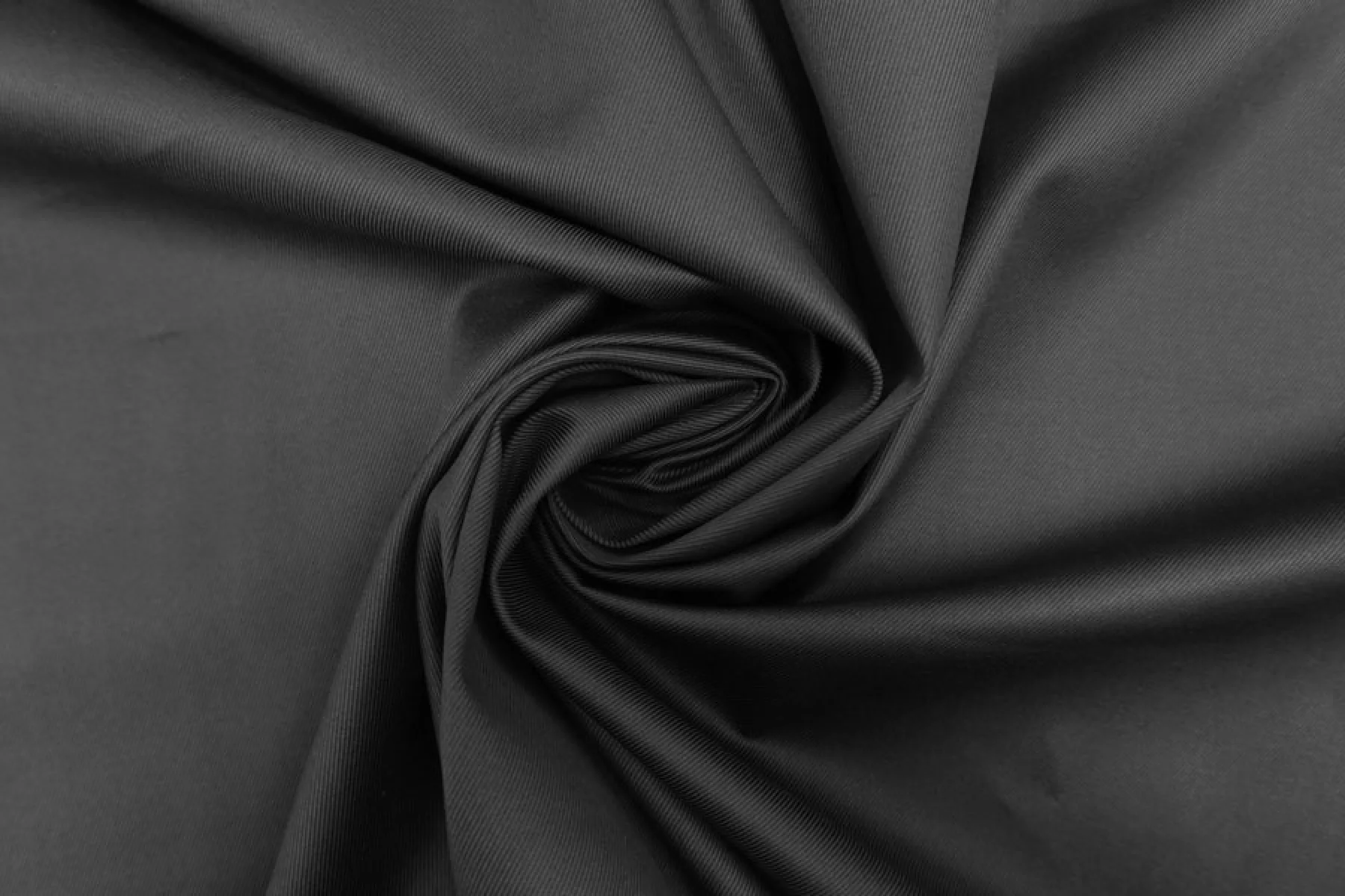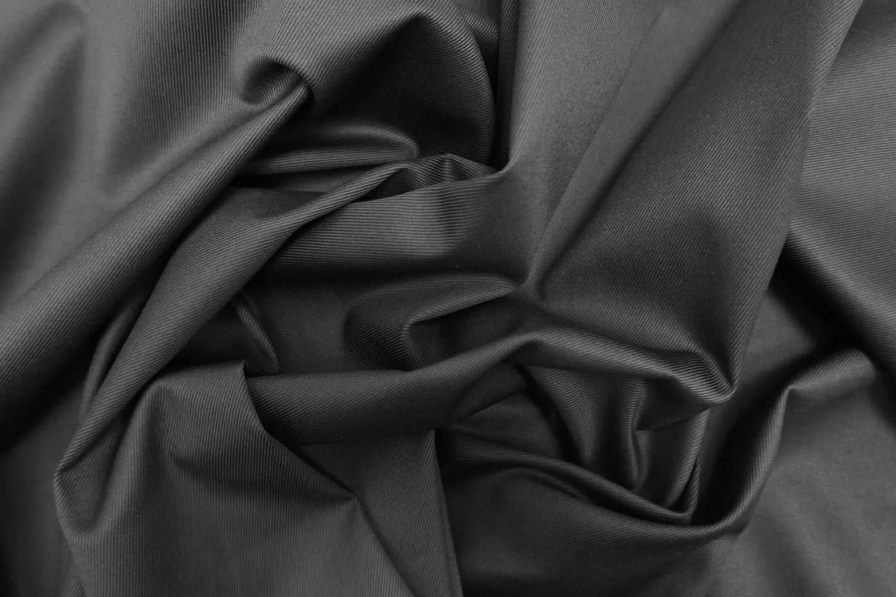 Отличного качества костюмный хлопок диагонального плетения в тёмно-сером, графитовом оттенке. Тактильно материал приятный хоть и чуть суховатый. Не просвечивает, тянется. Мнется средне, держит форму. Шьем костюмы, платья, юбки, брюки. Можно использовать и для пошива тренча либо пыльника, но учитывайте что материал сразу промокает.