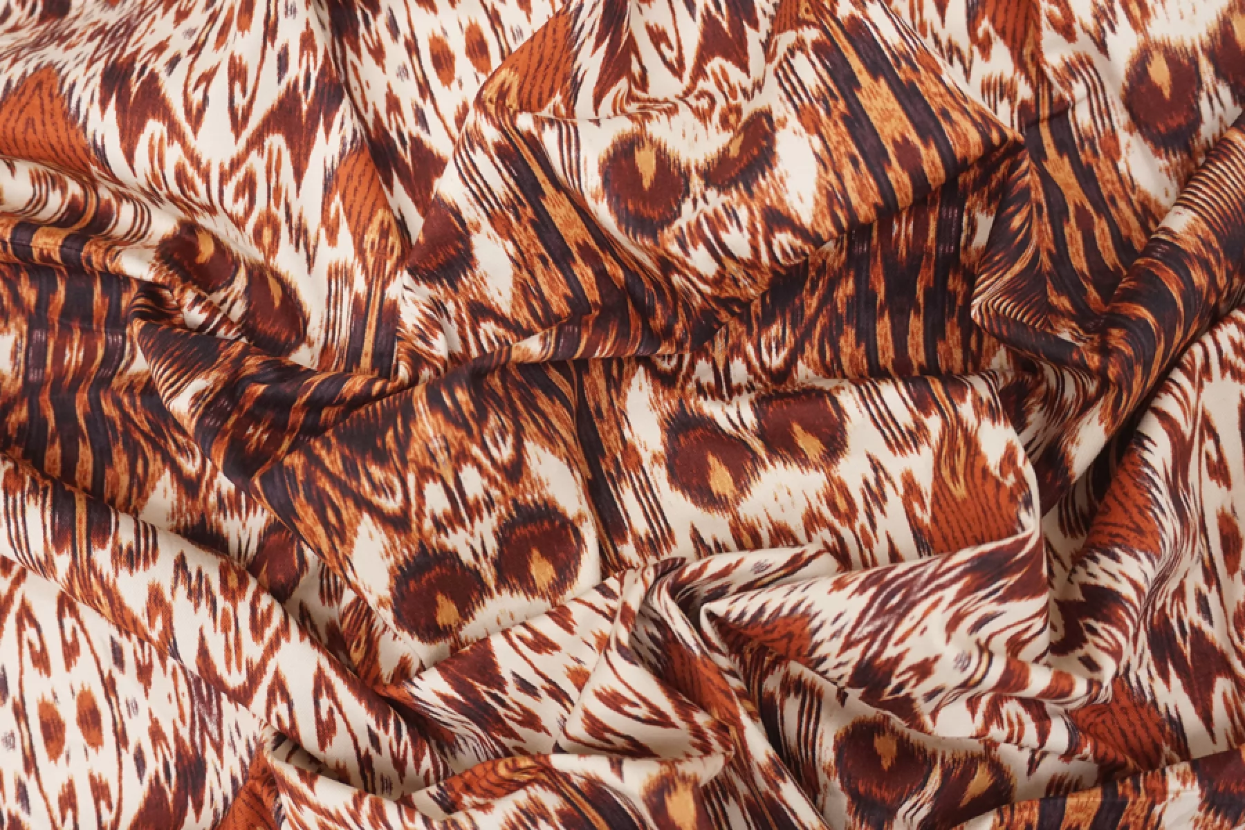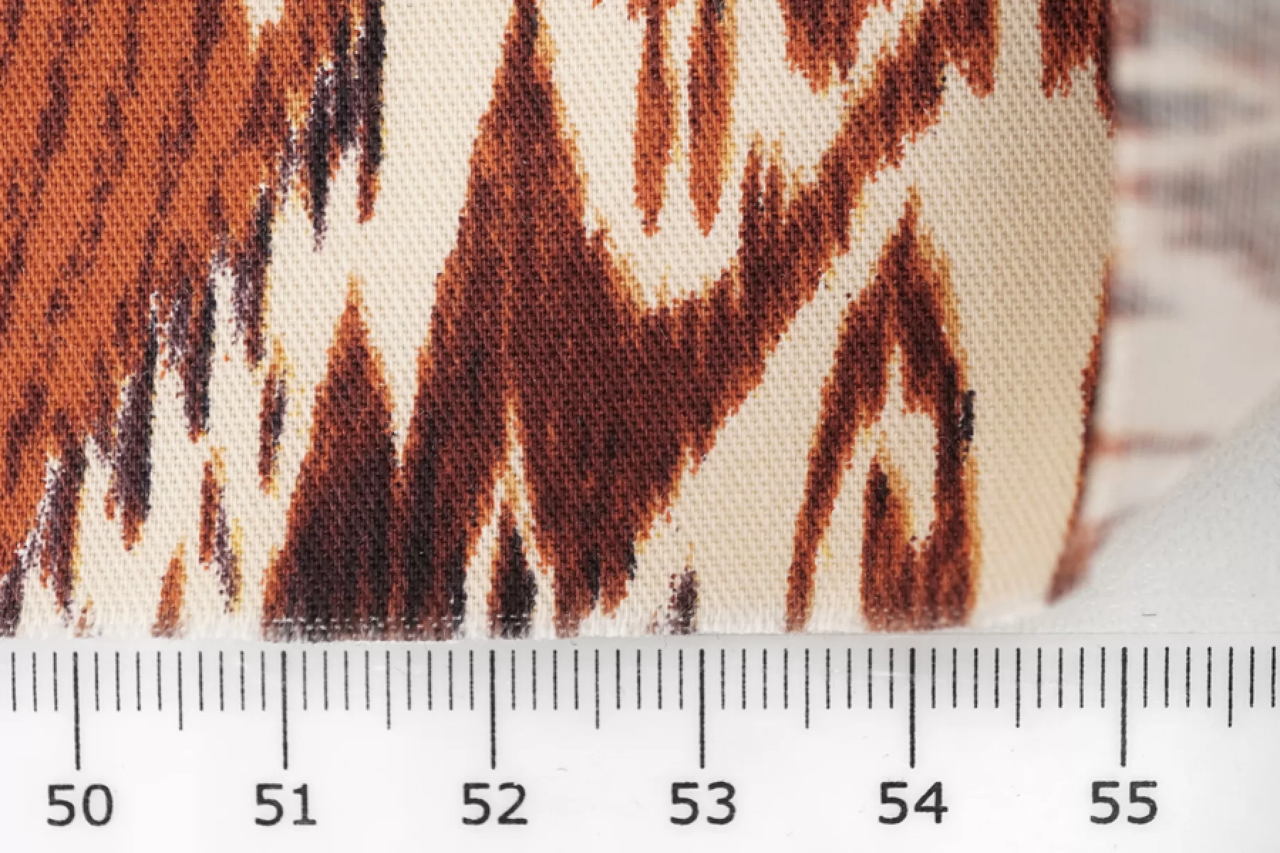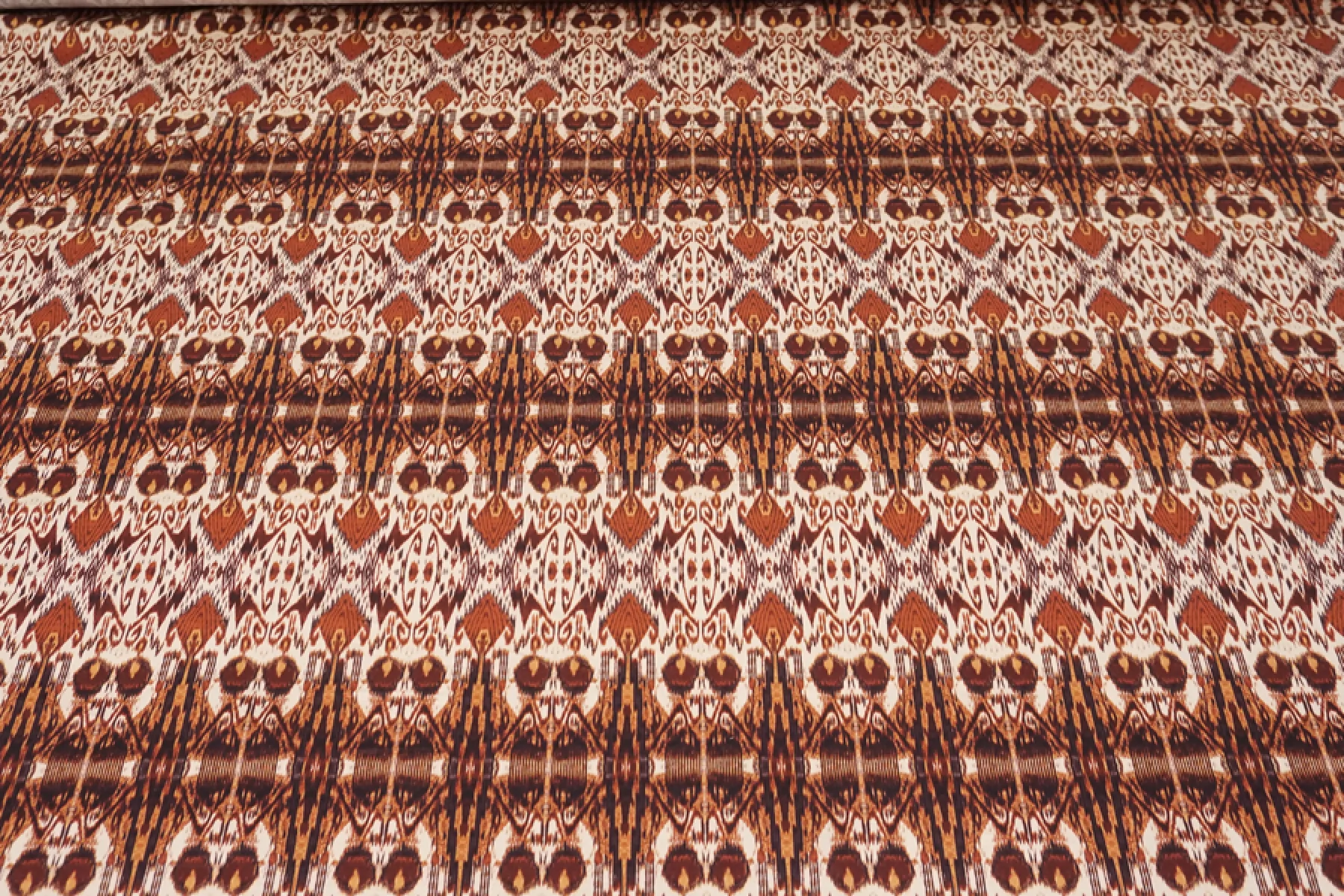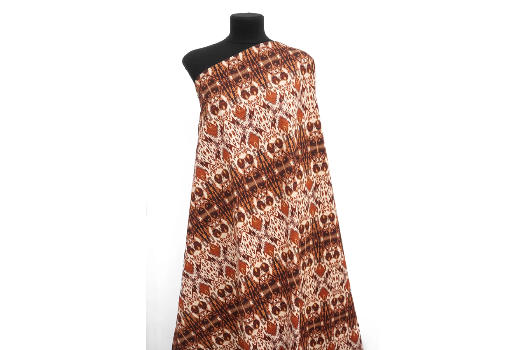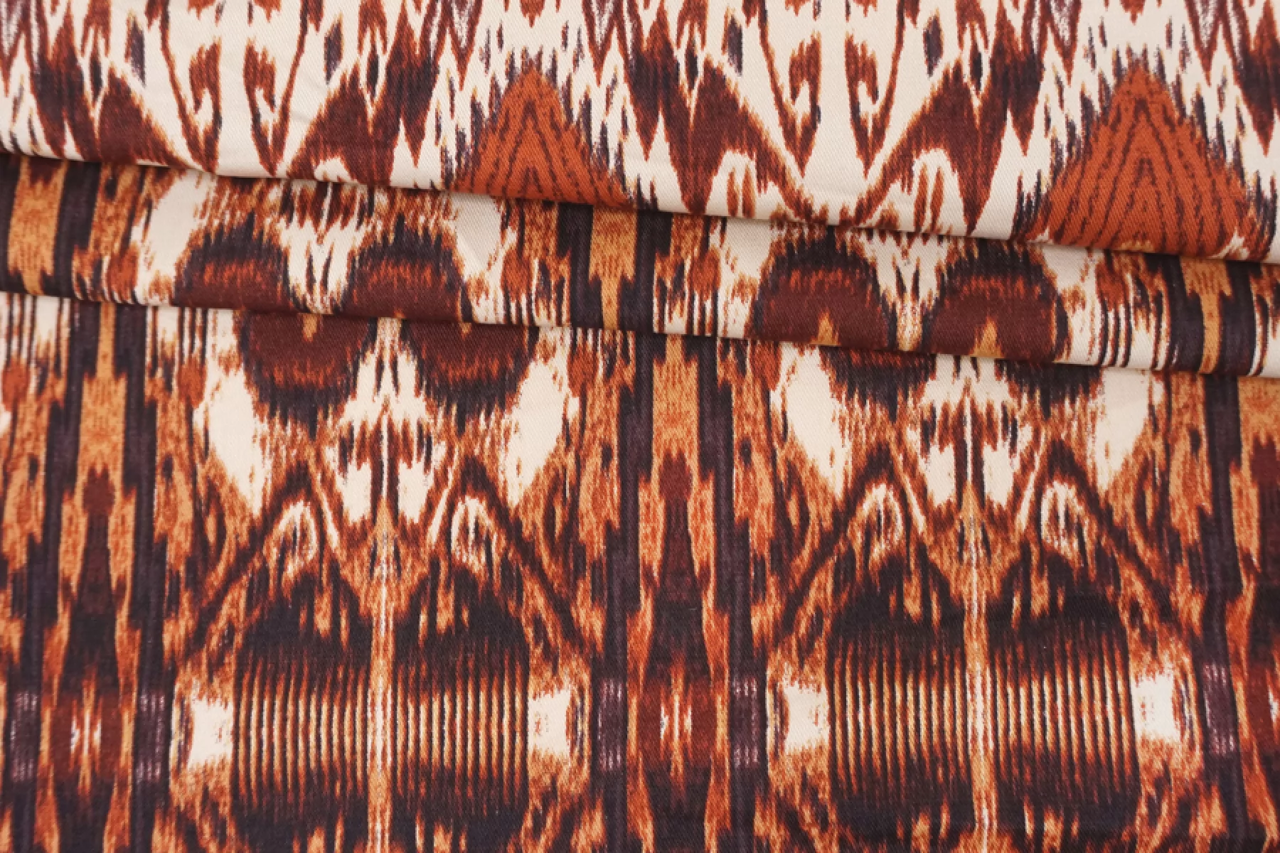 Костюмный хлопок от Max Mara диагонального плетения с принтом в виде икат в терракотовой цветовой гамме на светло-бежевом фоне. Материал тактильно очень приятный, мягкий и плотный. Не просвечивает. Хорошо держит форму. Неплохо тянется за счет содержания эластана. Используем на костюмы, платья, жакеты и не только.