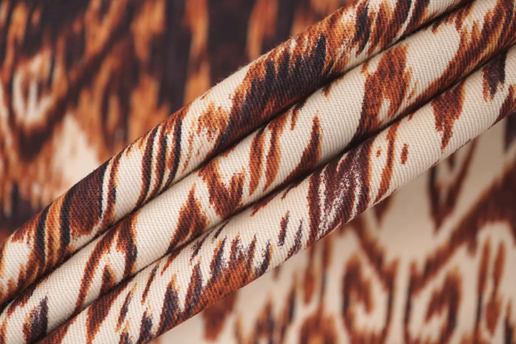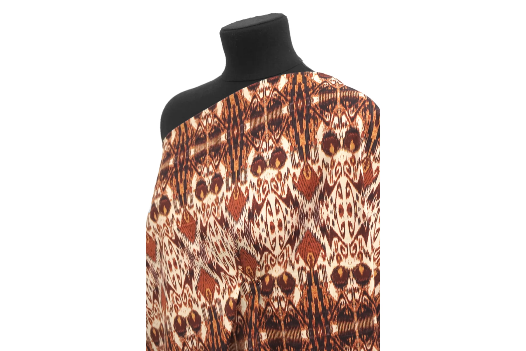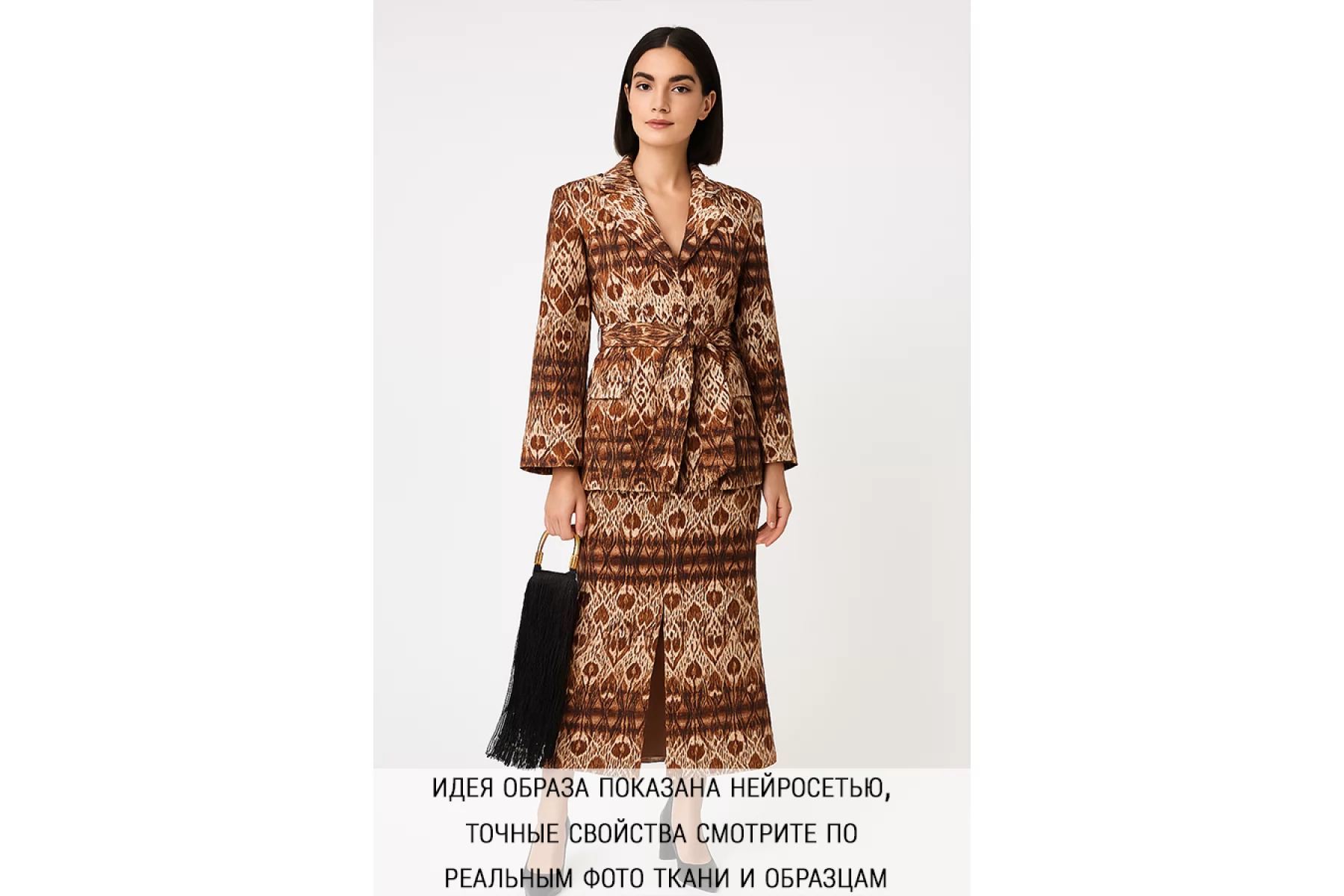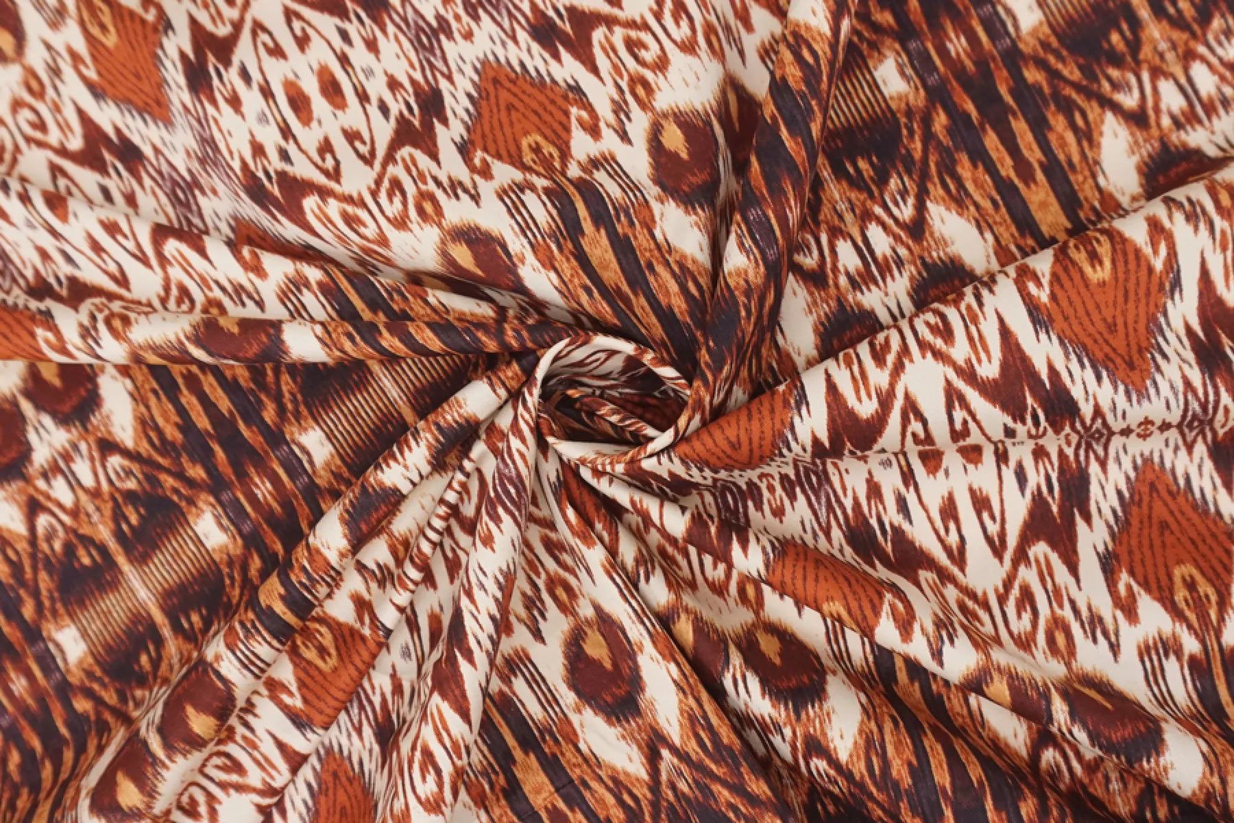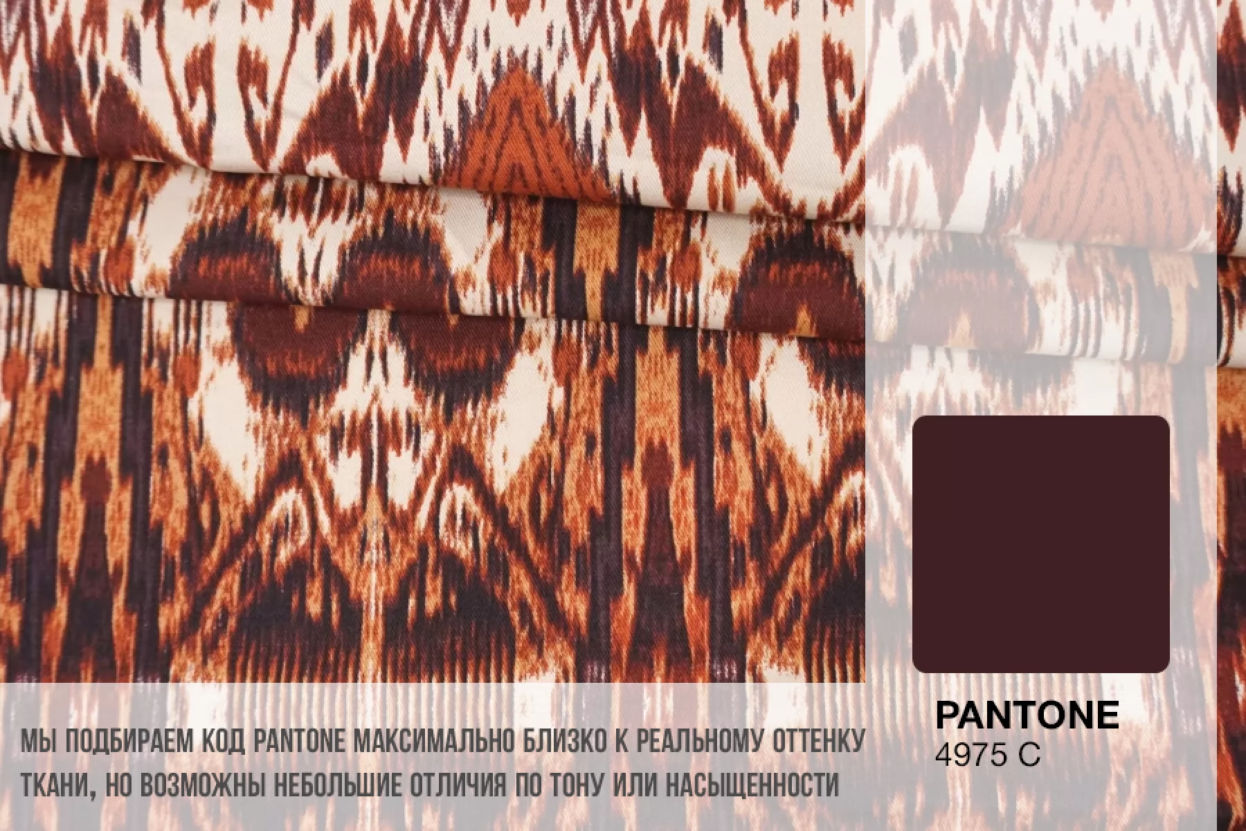 Костюмный хлопок от Max Mara диагонального плетения с принтом в виде икат в терракотовой цветовой гамме на светло-бежевом фоне. Материал тактильно очень приятный, мягкий и плотный. Не просвечивает. Хорошо держит форму. Неплохо тянется за счет содержания эластана. Используем на костюмы, платья, жакеты и не только.