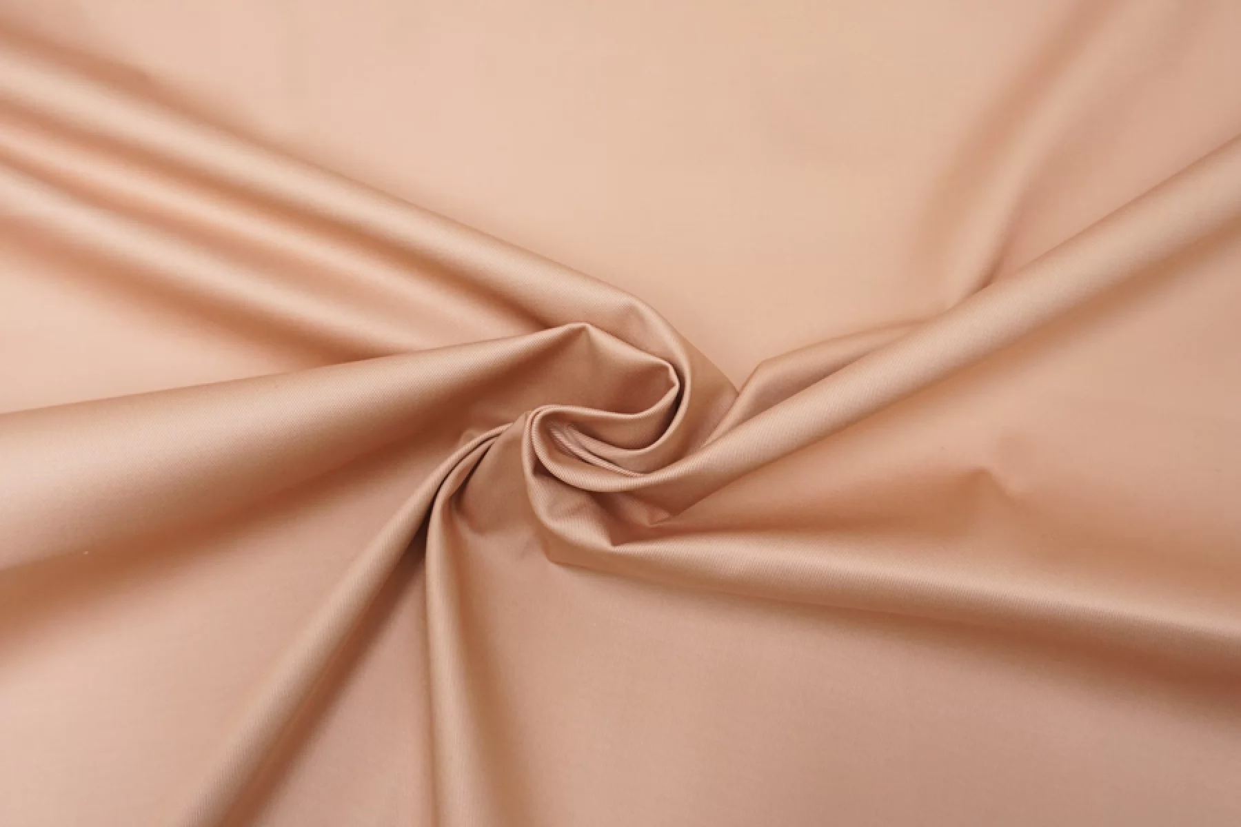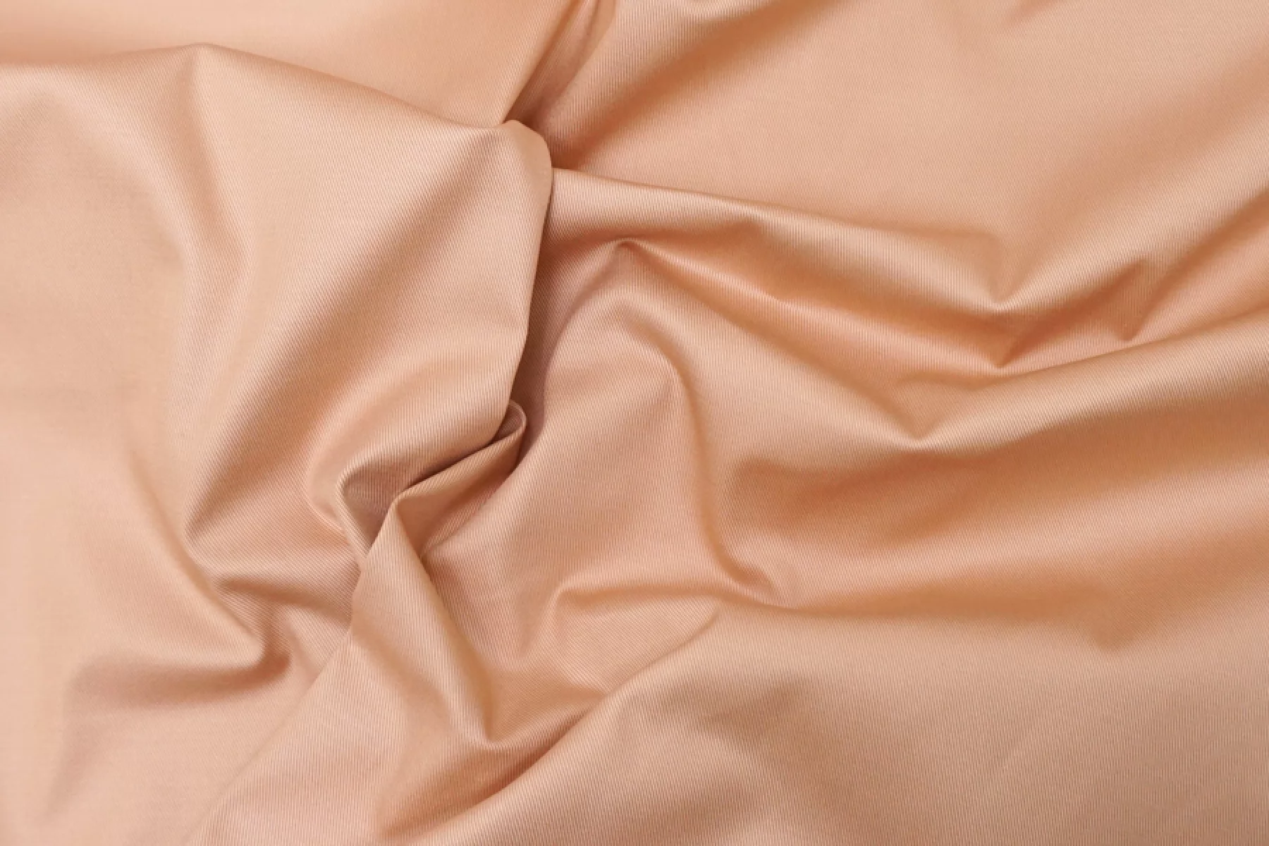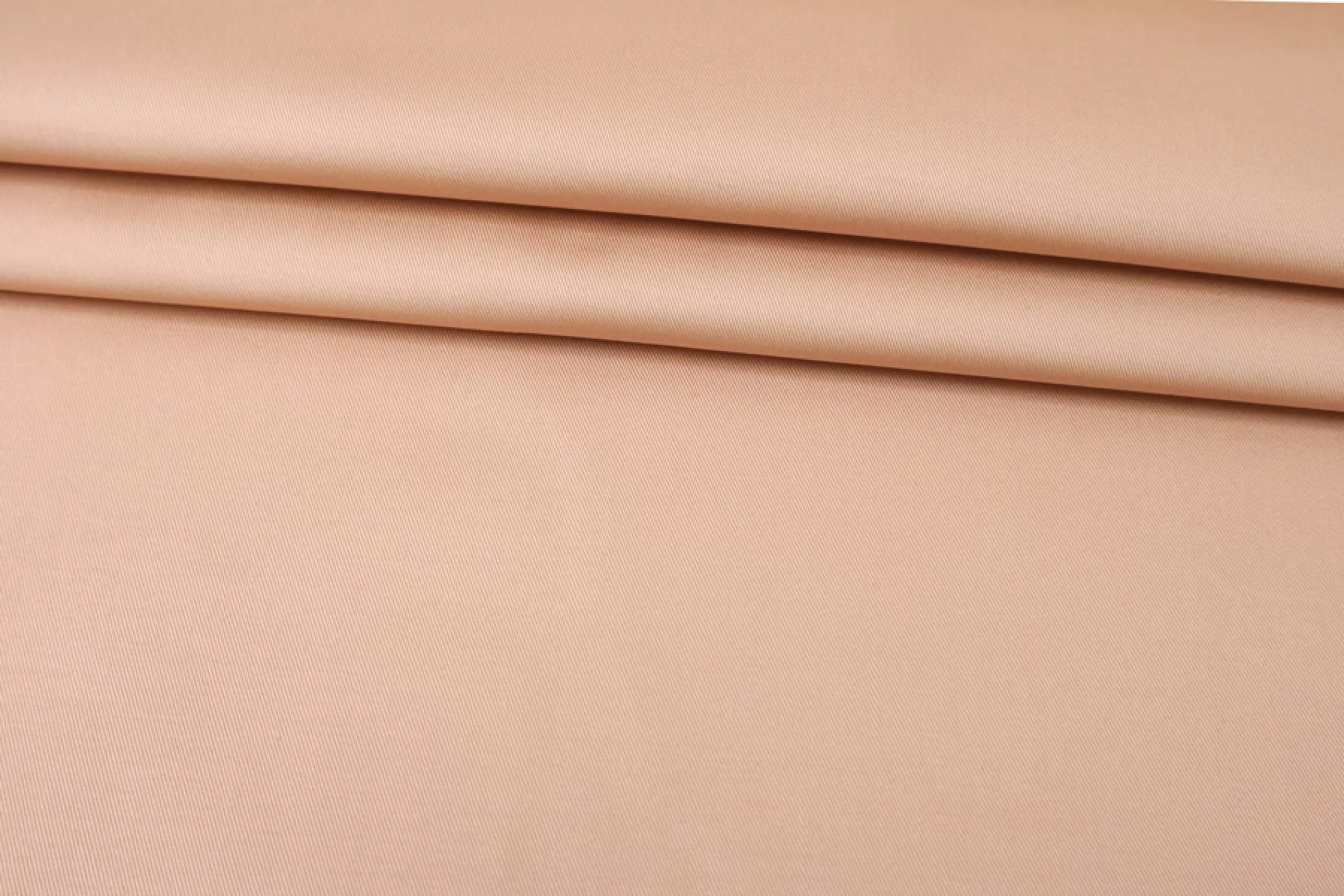 Прекрасного качества костюмный хлопок диагонального плетения, в неярком персиково-бежевом оттенке. Тактильно материал приятный, гладкий. Не просвечивает, тянется. Мнется средне, держит форму. Шьем костюмы, платья, юбки, брюки. Можно использовать и для пошива тренча либо пыльника, но учитывайте что материал сразу промокает.