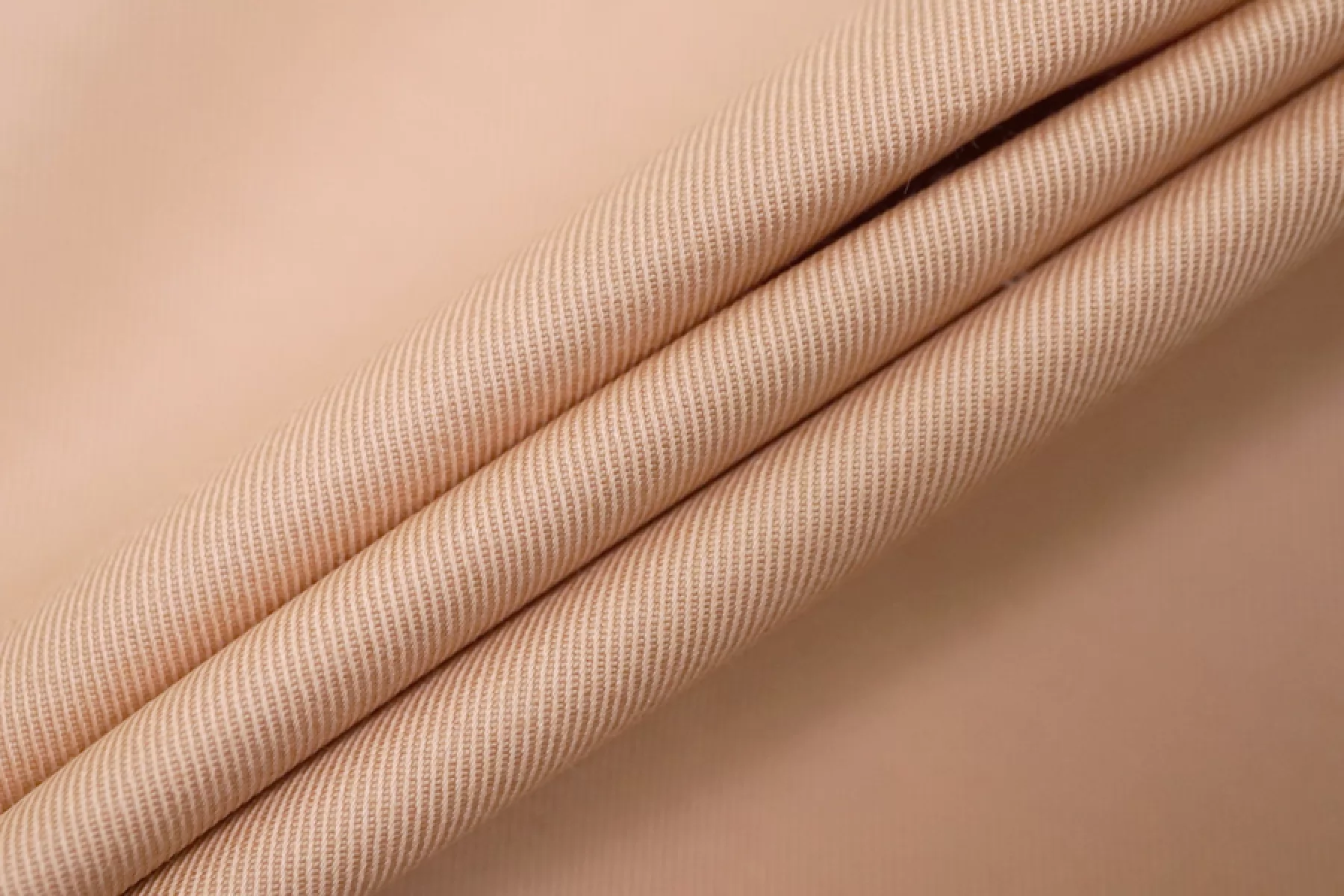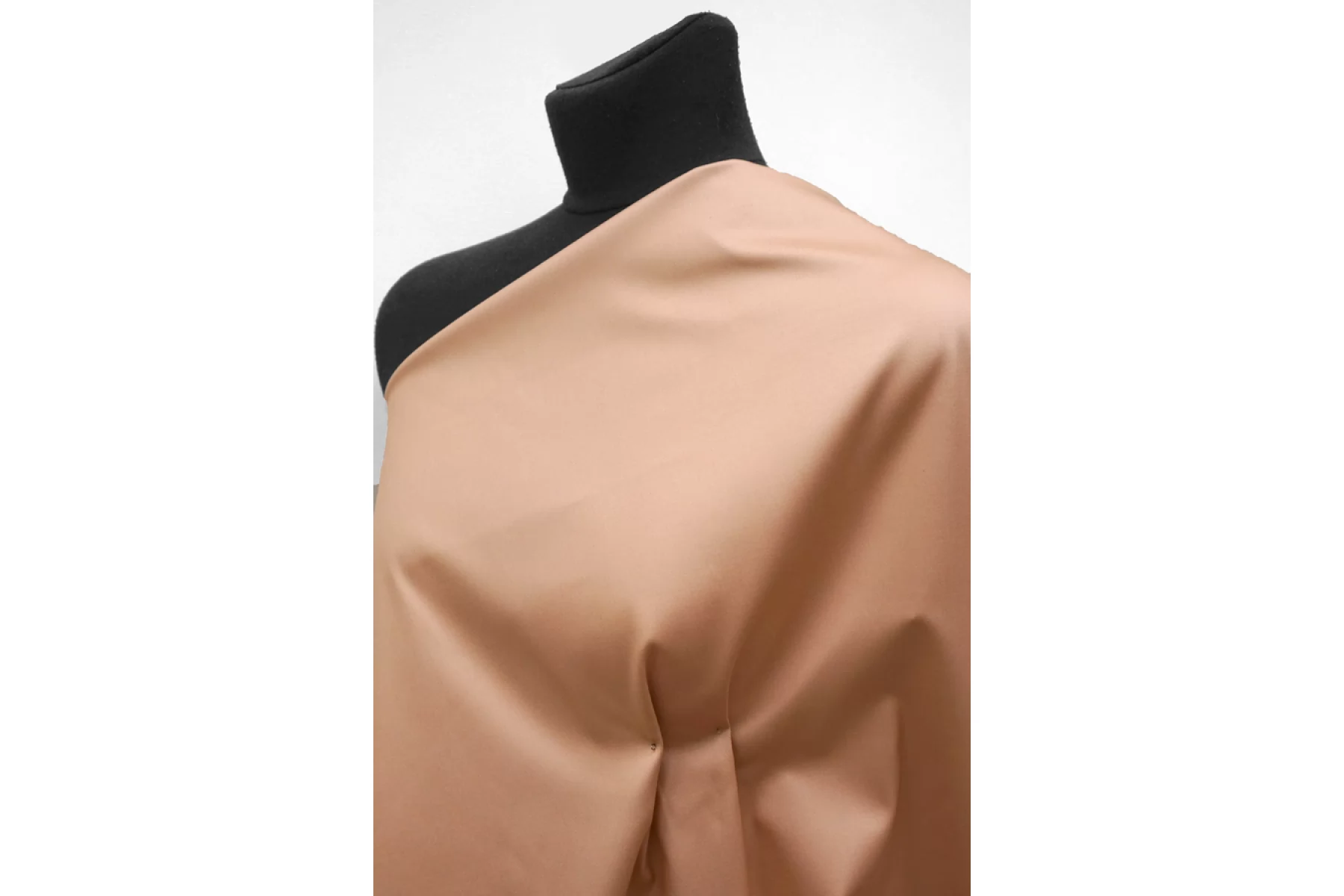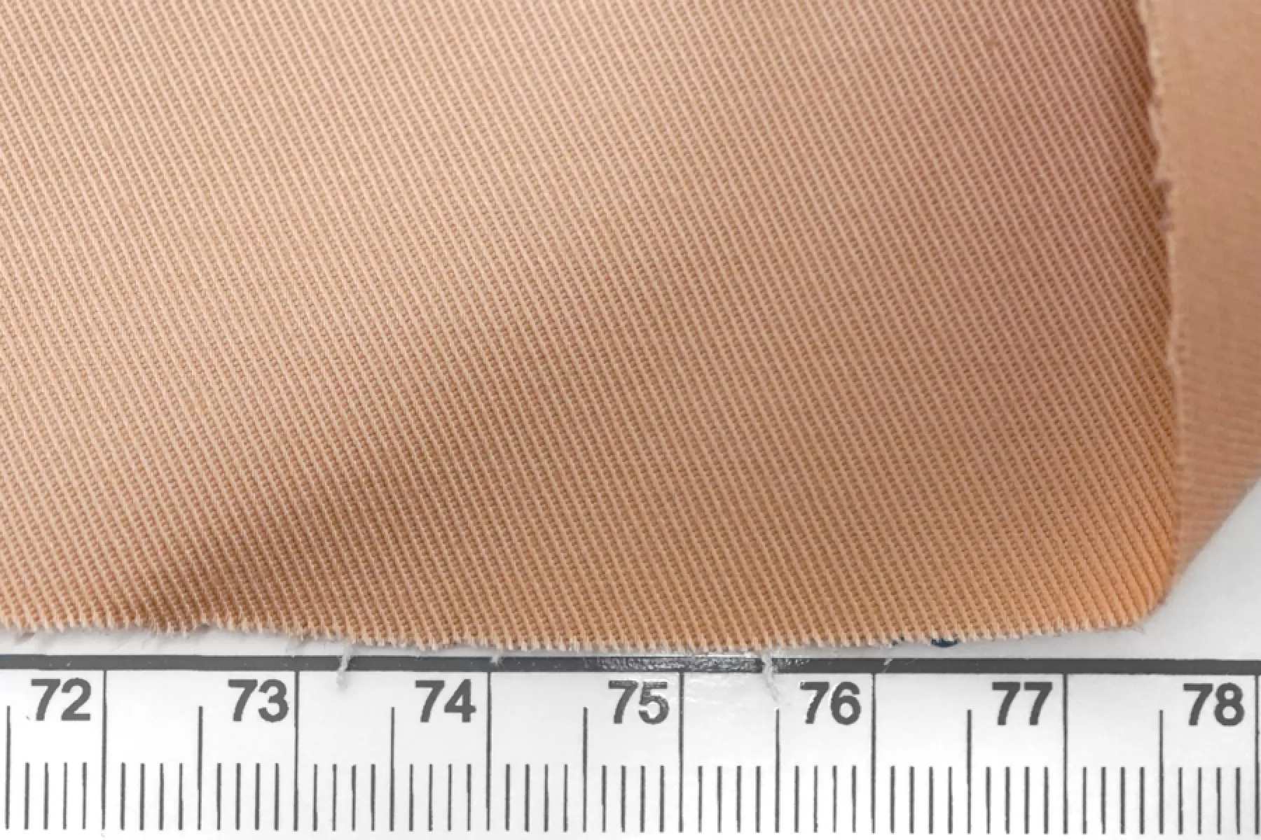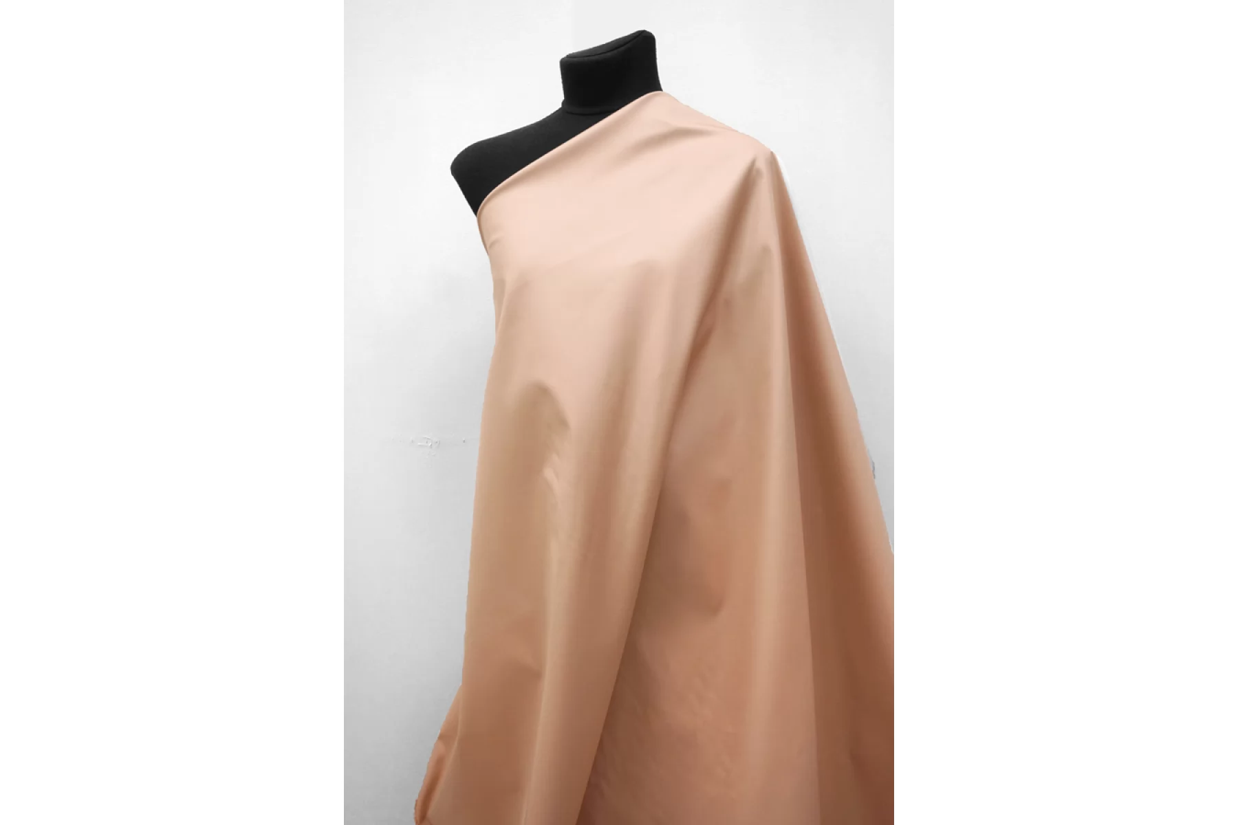 Прекрасного качества костюмный хлопок диагонального плетения, в неярком персиково-бежевом оттенке. Тактильно материал приятный, гладкий. Не просвечивает, тянется. Мнется средне, держит форму. Шьем костюмы, платья, юбки, брюки. Можно использовать и для пошива тренча либо пыльника, но учитывайте что материал сразу промокает.
