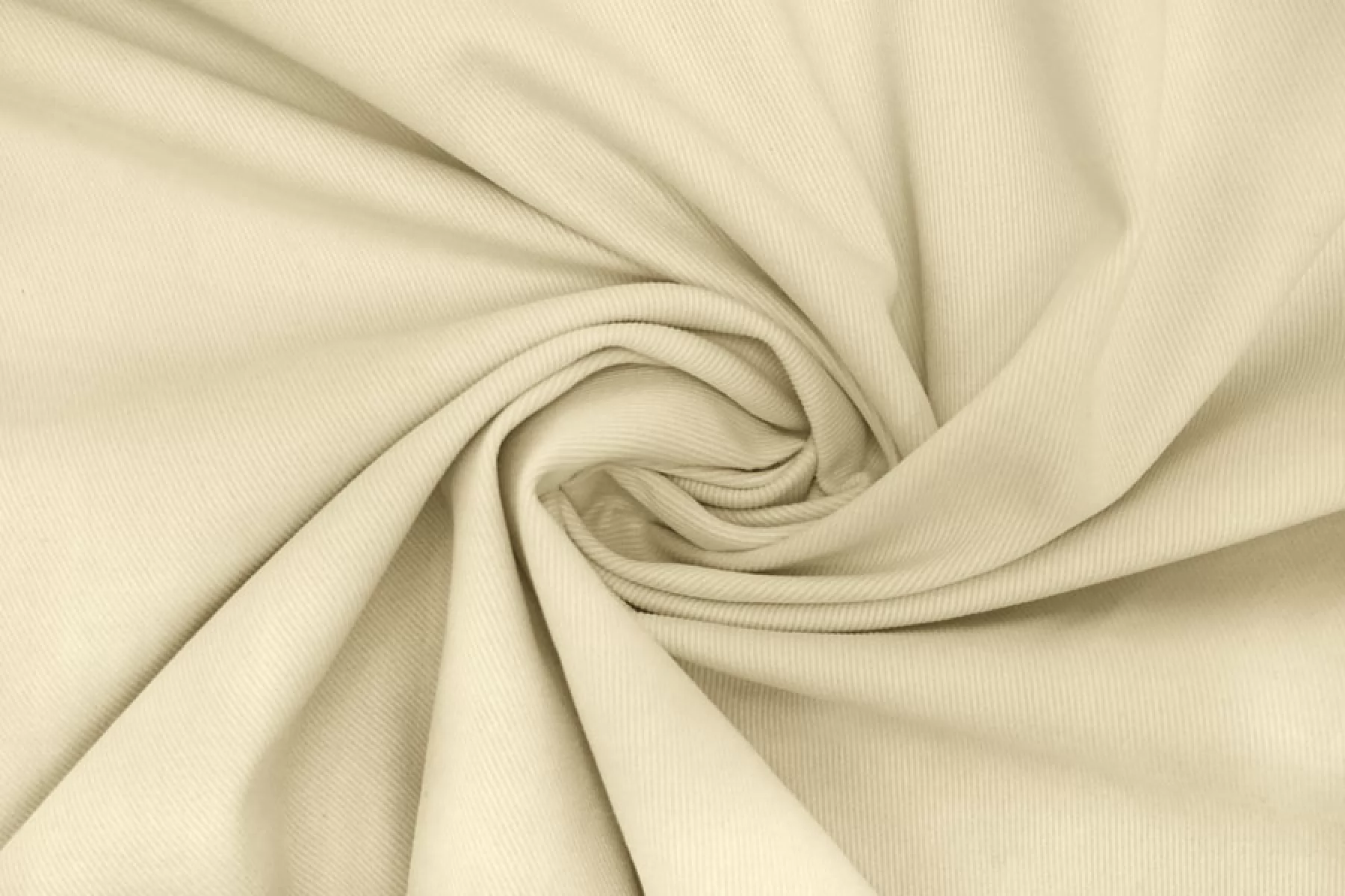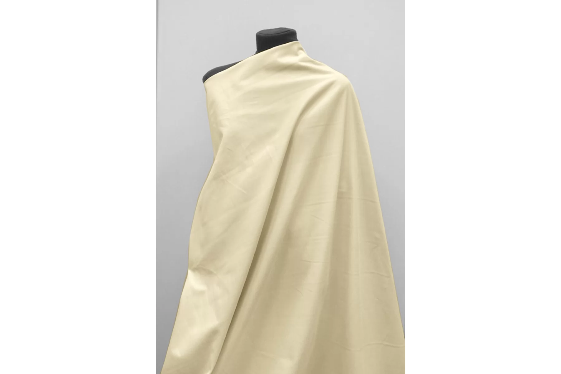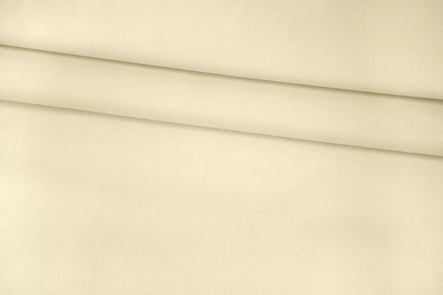 Отличного качества костюмный хлопок диагонального плетения, с бархатистой поверхностью «под велюр», в приятном сливочном цвете (бледно-желтый с бежевинкой). Тактильно материал очень приятный, велюровый. Не просвечивает, тянется. Мнется средне, держит форму. Шьем костюмы, платья, юбки, брюки. Можно использовать и для пошива тренча либо пыльника, но учитывайте что материал сразу промокает.