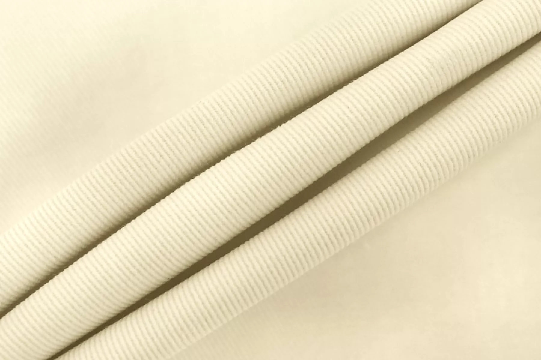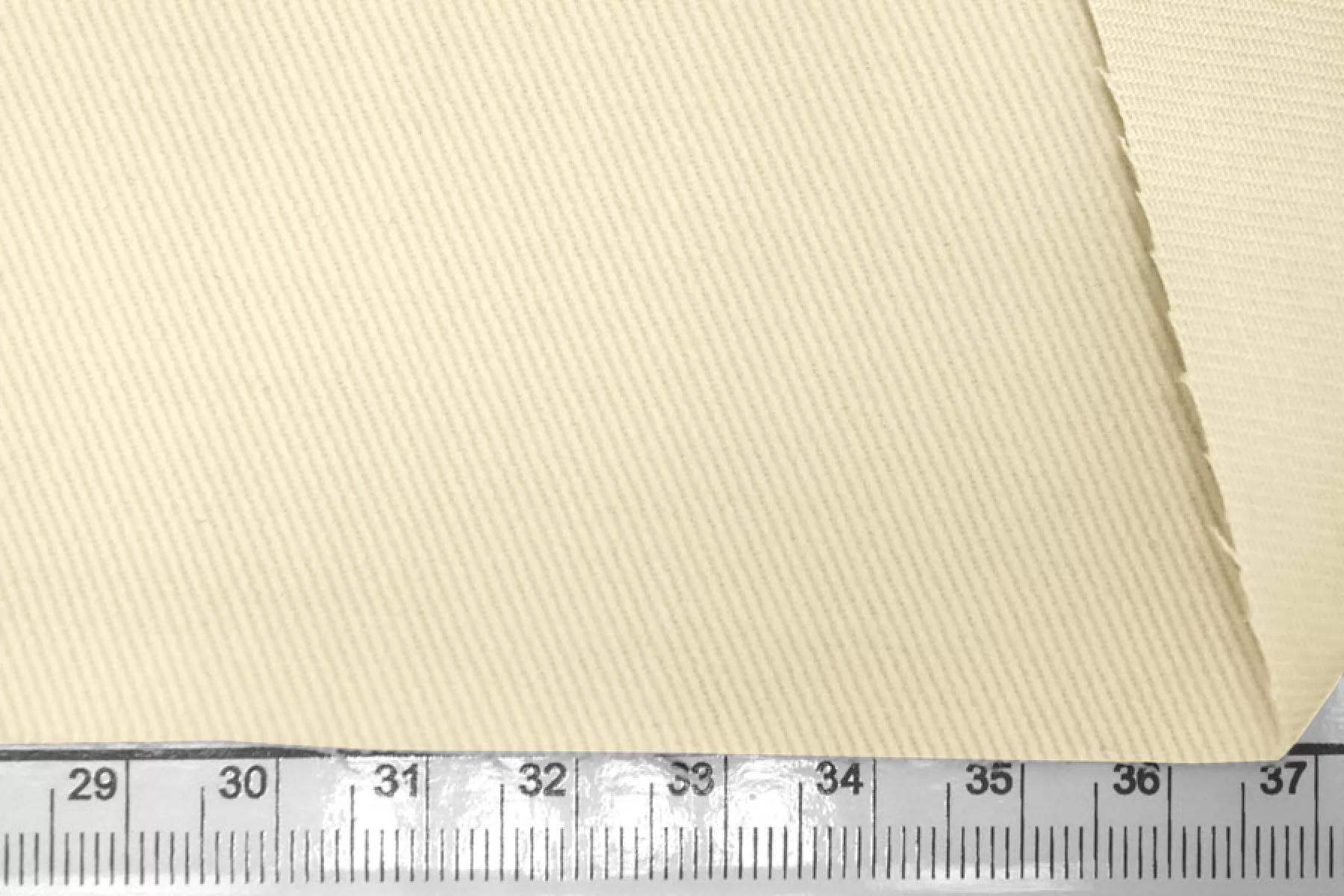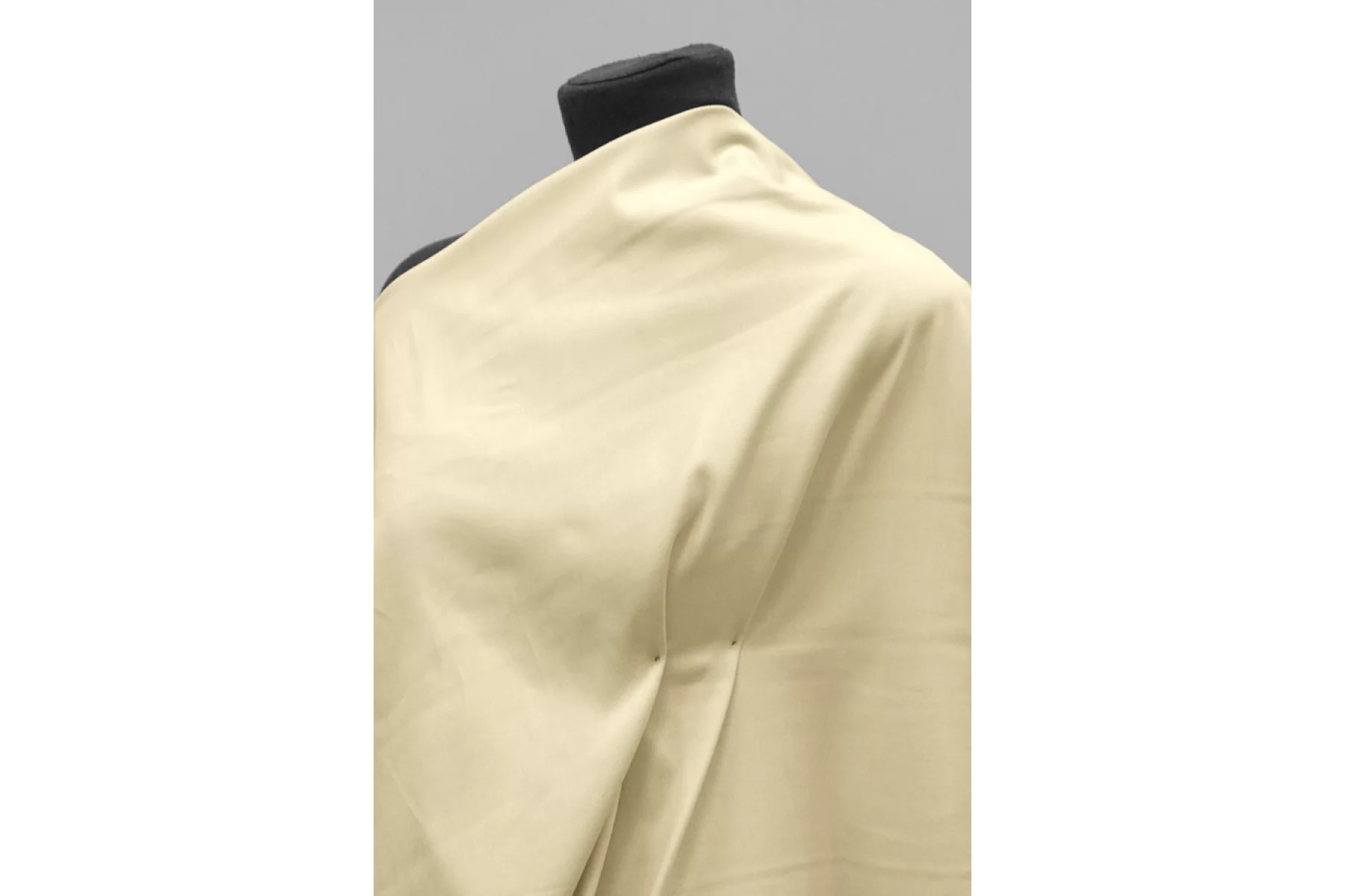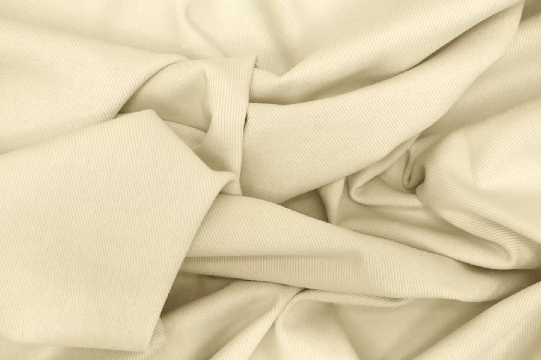 Отличного качества костюмный хлопок диагонального плетения, с бархатистой поверхностью «под велюр», в приятном сливочном цвете (бледно-желтый с бежевинкой). Тактильно материал очень приятный, велюровый. Не просвечивает, тянется. Мнется средне, держит форму. Шьем костюмы, платья, юбки, брюки. Можно использовать и для пошива тренча либо пыльника, но учитывайте что материал сразу промокает.