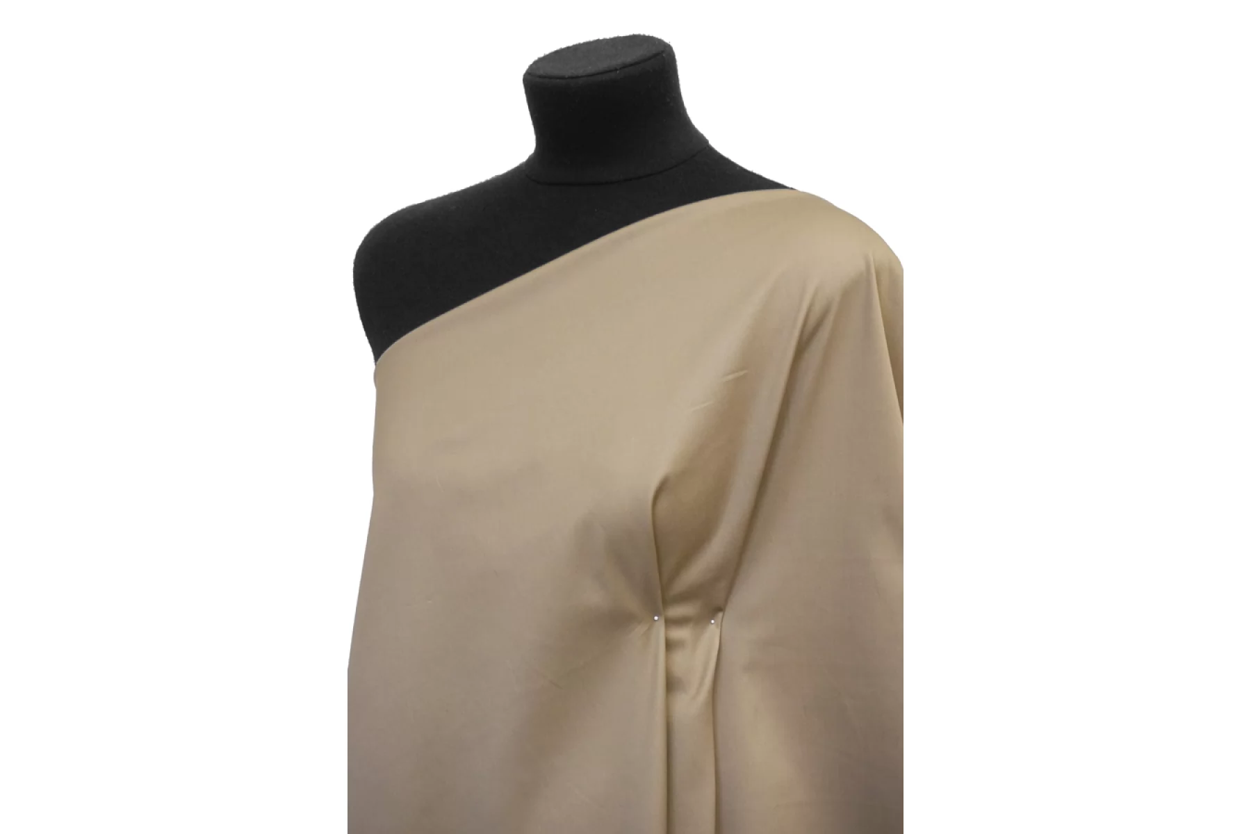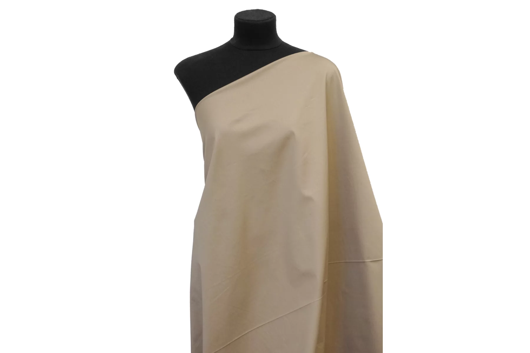 Костюмный сатиновый хлопок бежевого оттенка с сероватым подтоном. Обладает приятным матовым лоском. Материал плотный и пластичный, тактильно очень приятный, мягкий. Хорошо и упруго тянется за счет содержания эластана. Не просвечивает. Прекрасно драпируется и держит форму и складки. Мнется. Шьем костюмы, платья, юбки, мягкие жакеты и другие варианты.