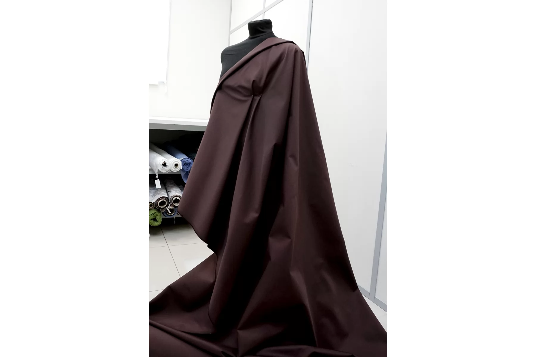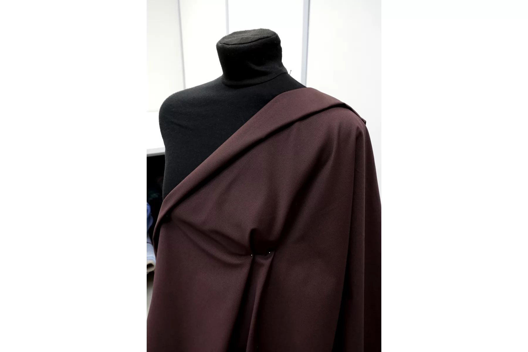 Итальянский хлопок костюмной плотности, в приглушенном коричнево-бордовом оттенке. Плетение диагональное. Материал плотной, но тонкий, пластичный, немного жестковатый. Не тянется. Хорошо держит форму. Не просвечивает. Сминается, но частично восстанавливается. Отличный вариант на отрезные платья, юбки, костюмы, тренчи или пыльники (воду не отталкивает). Учитывайте усадку.