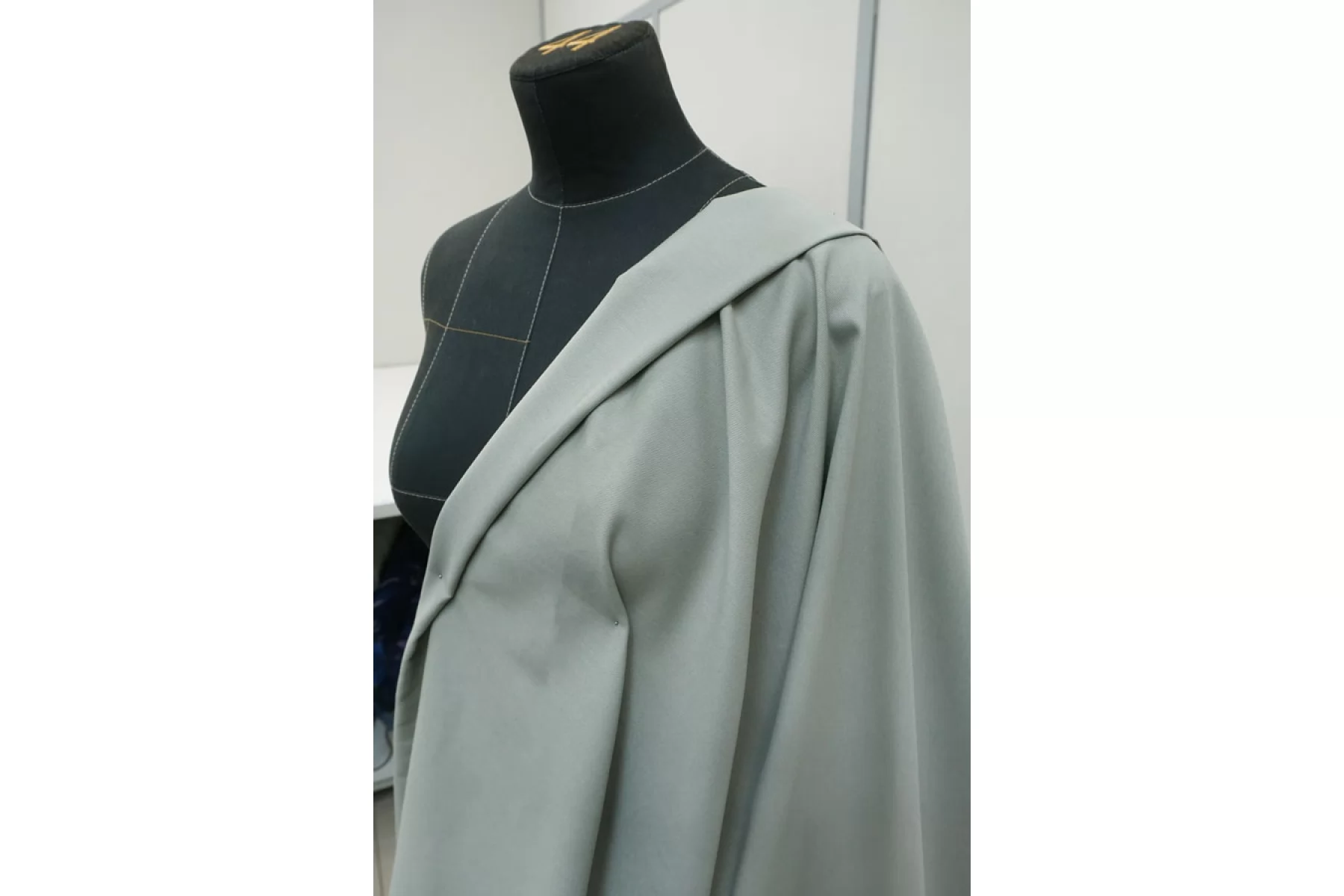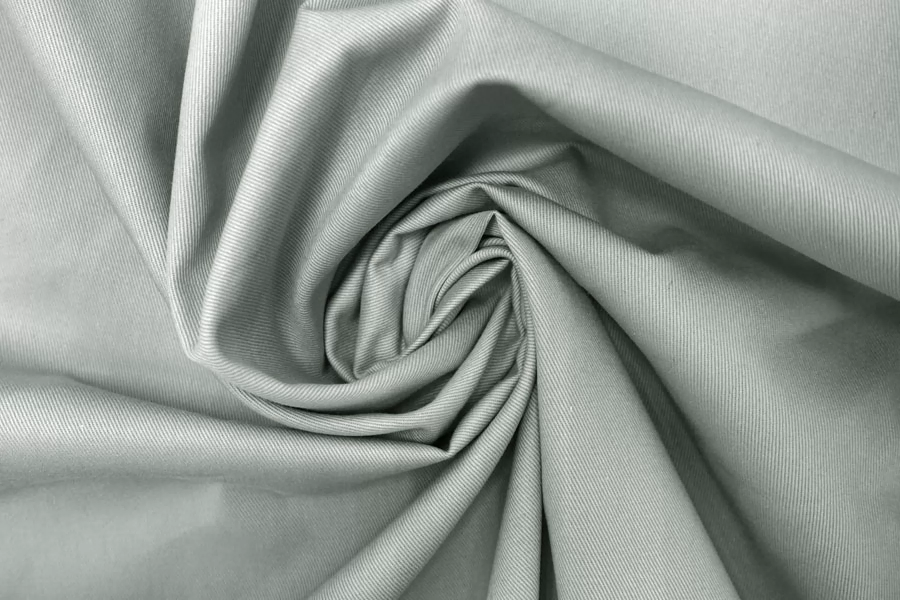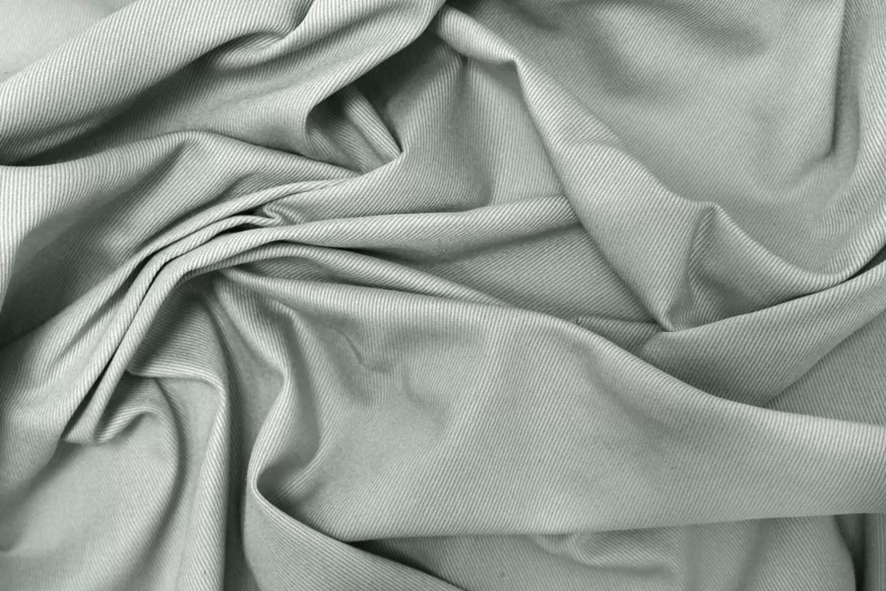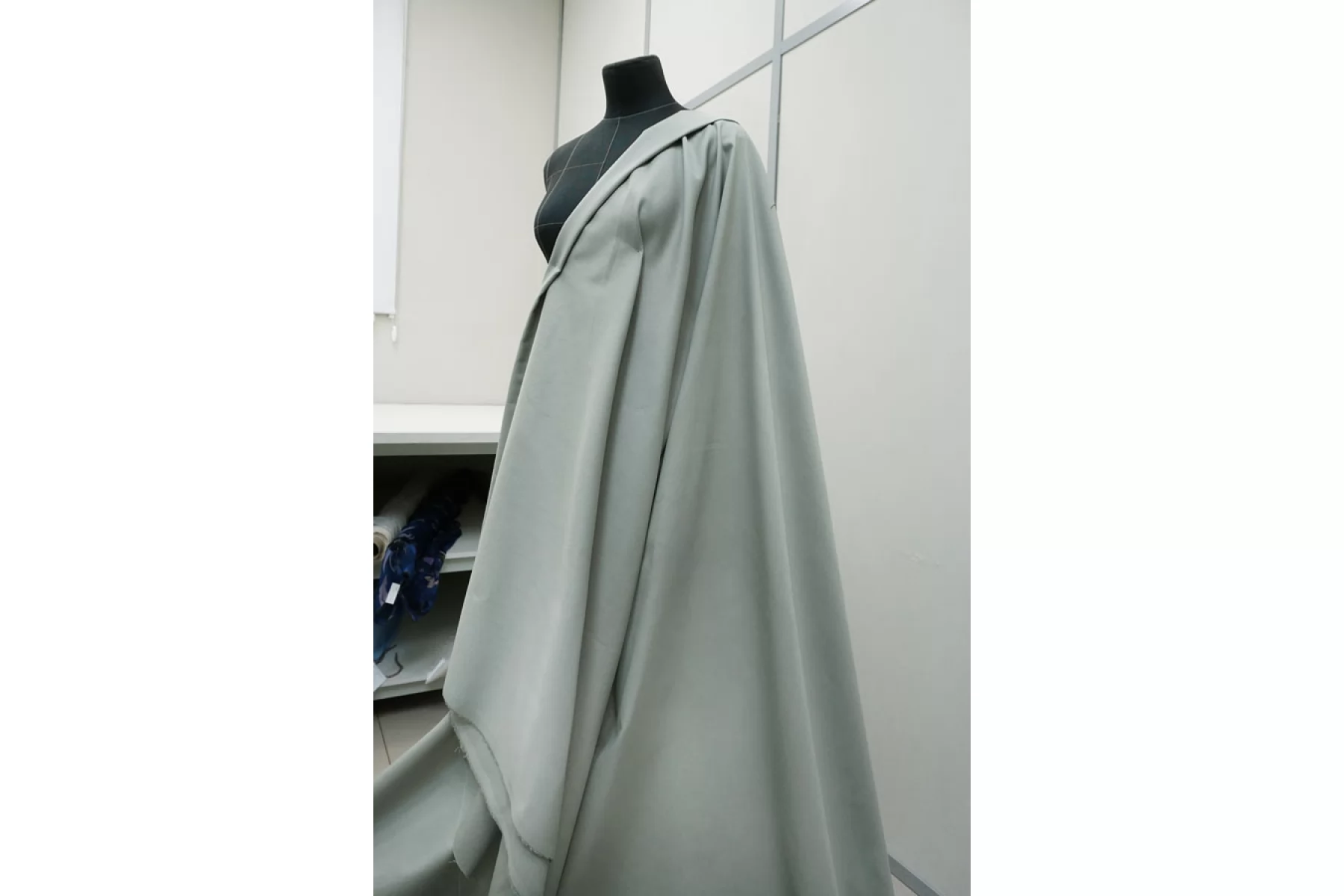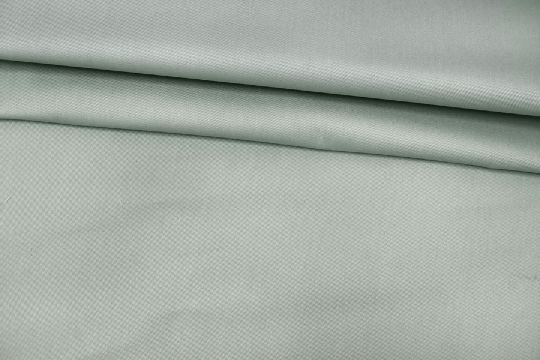 Итальянский хлопок костюмной плотности, светло-серого цвета с зеленоватым подтоном, плетение диагональное. Тактильно чуть суховат. Не тянется, пластичный но форму держит хорошо, мнется. Не просвечивает. Отличный вариант на платья, юбки, костюмы, брюки (учитывайте, что не тянется). Учитывайте возможную усадку. Можно сшить тренч или пыльник, но учитывайте что воду не отталкивает.