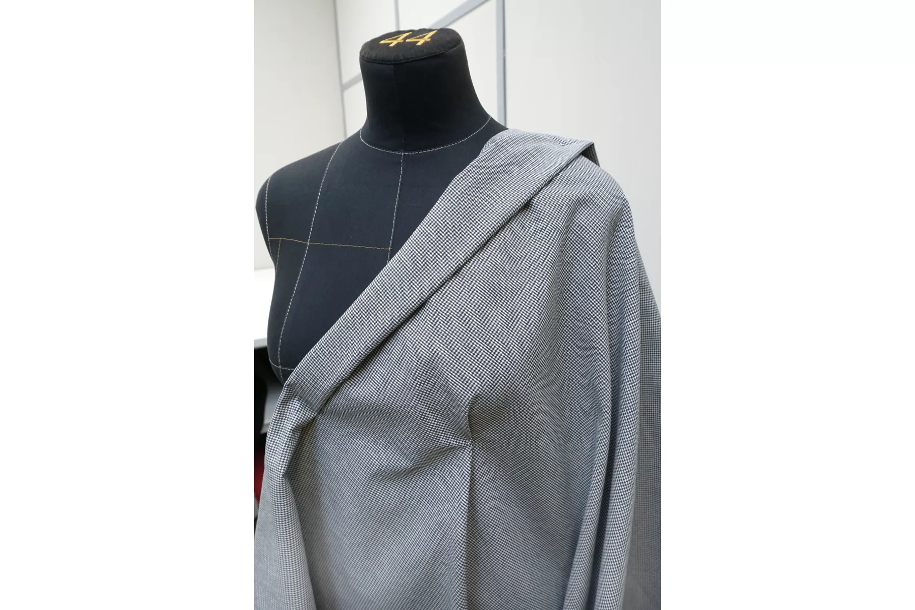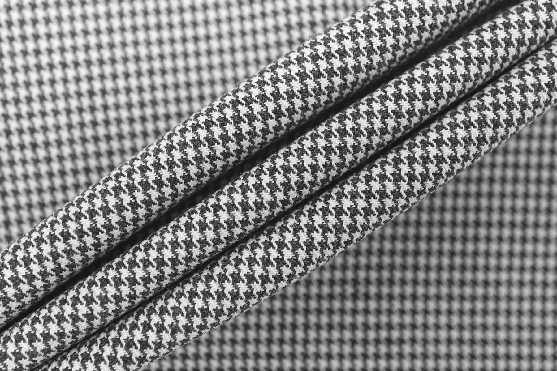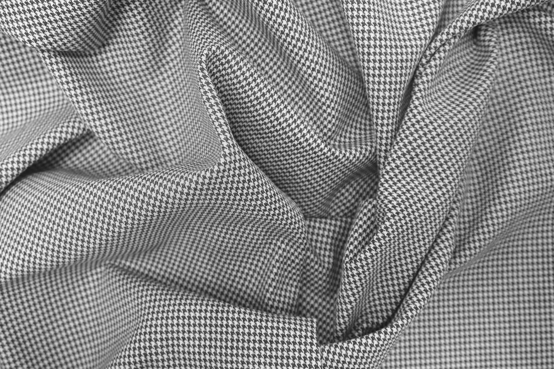 Хлопок костюмной плотности от бренда Thom Browne, узор - мелкая гусиная лапка, нити тёмно-серого и белого цвета. Поверхность тактильно приятная, немного фланелевая. Держит форму, умеренной пластичности. Не тянется, не просвечивает. Подойдет для пошива костюма (в том числе и мужского), платья держащего форму, юбки.