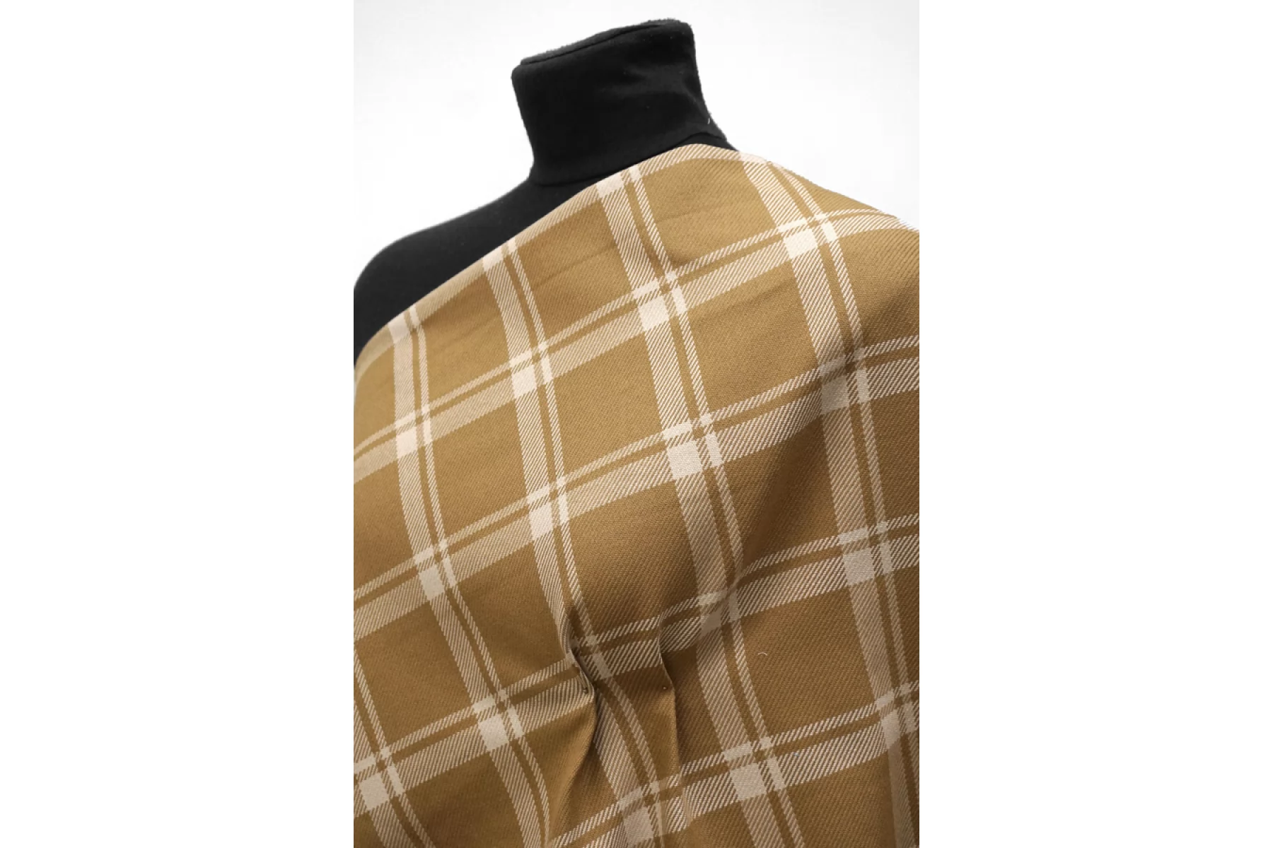 Итальянский костюмный хлопок в клетку от Ralph Lauren, нити песочно-бежевого и светло-бежевого цвета. Держит форму но при этом пластичный, не тянется, не просвечивает. Подойдет для пошива костюма, платья держащего форму, юбки, брюк.