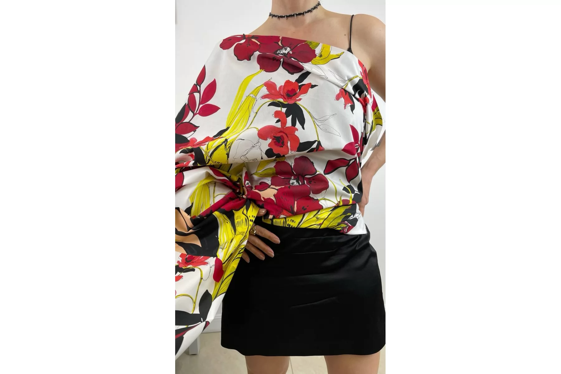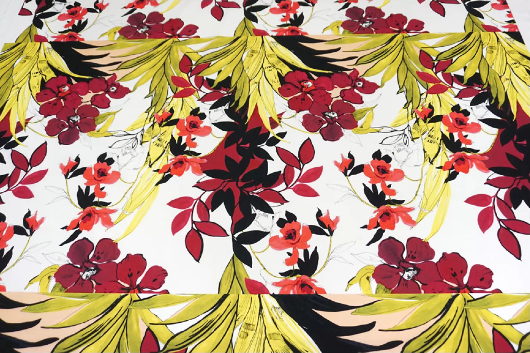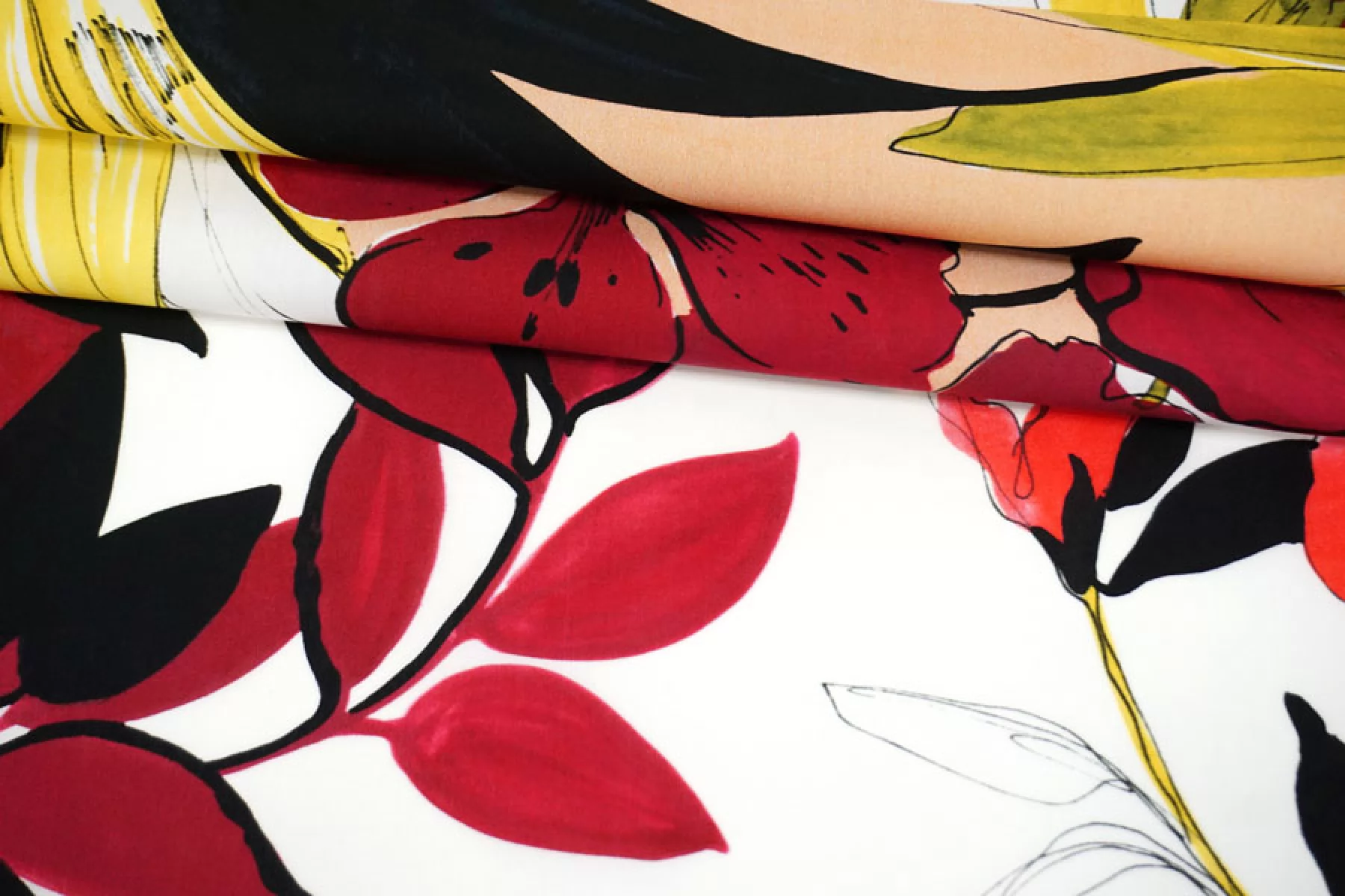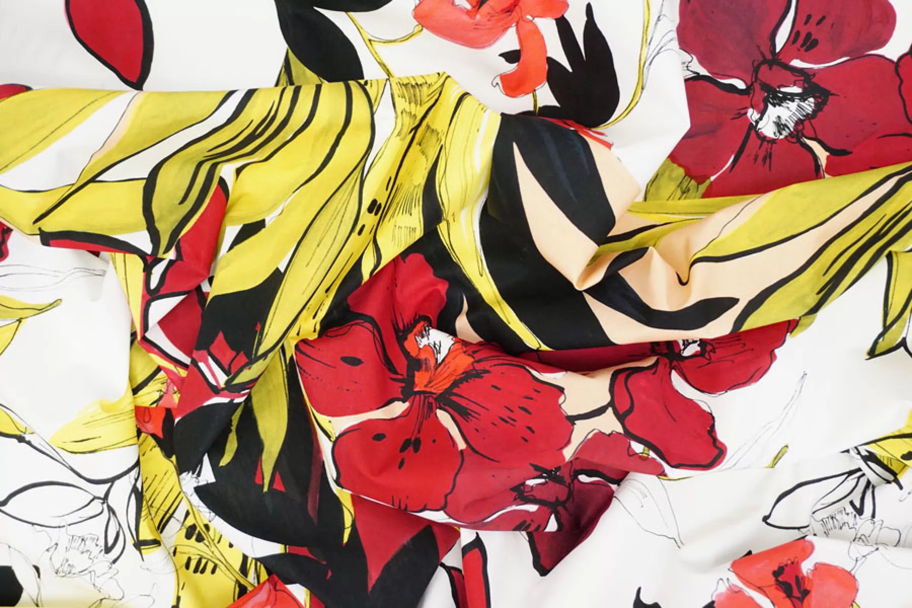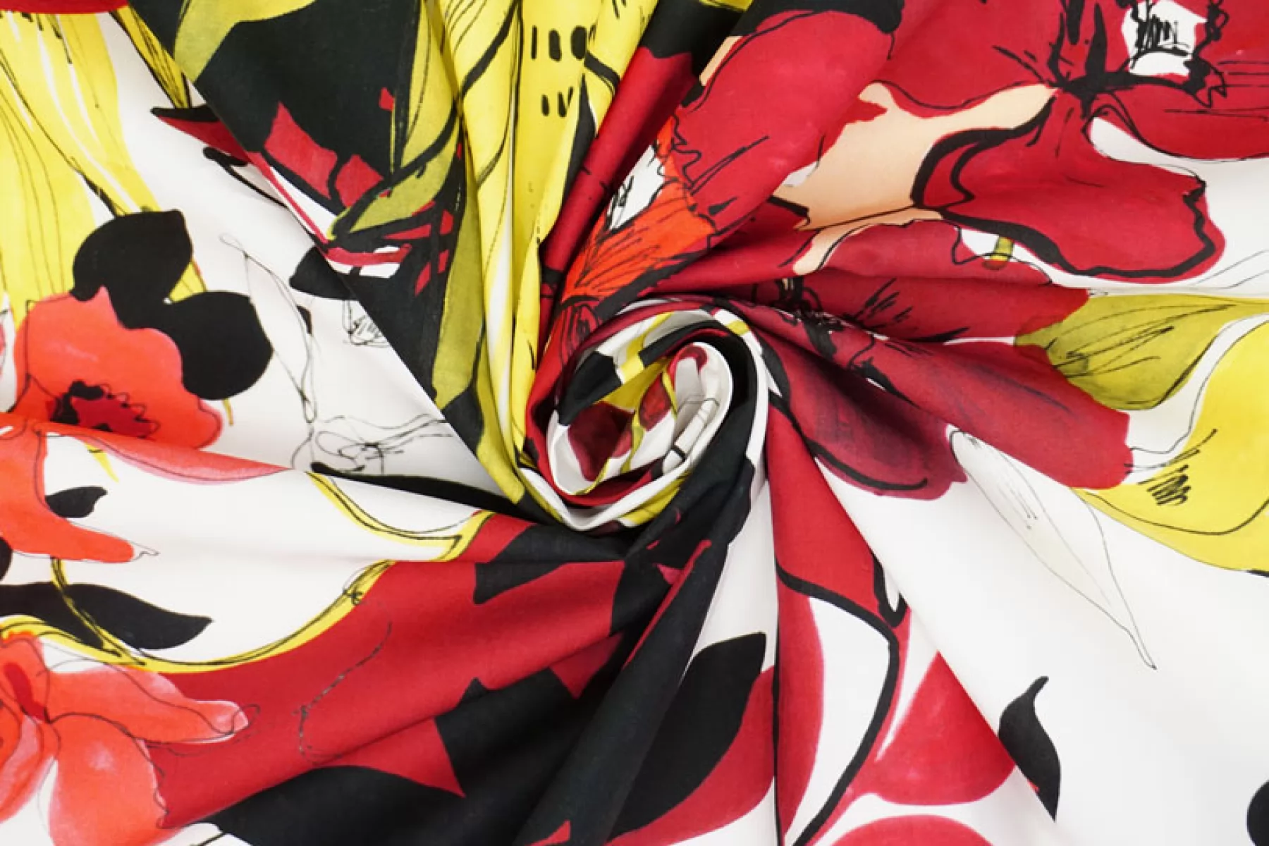 !Внимание! Ткань с раппортом, продается купонами, длина купона 69 см, цена за купон 1138,5 руб.! Итальянский мерсеризованный хлопок белого цвета с крупным цветочным принтом. Материал плотный, гладкий, с красивым лоском. Слегка просвечивает силуэт. Немного держит форму. Мнется. Отлично подойдет для пошива платьев, рубашек или юбок. Учитывайте усадку.