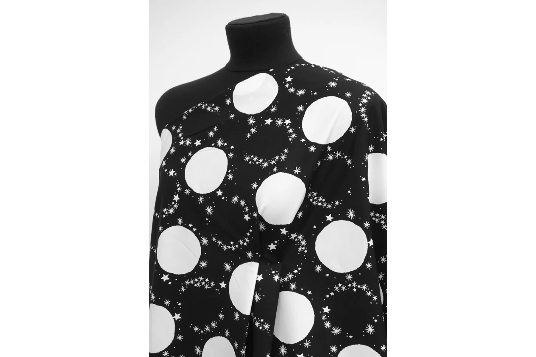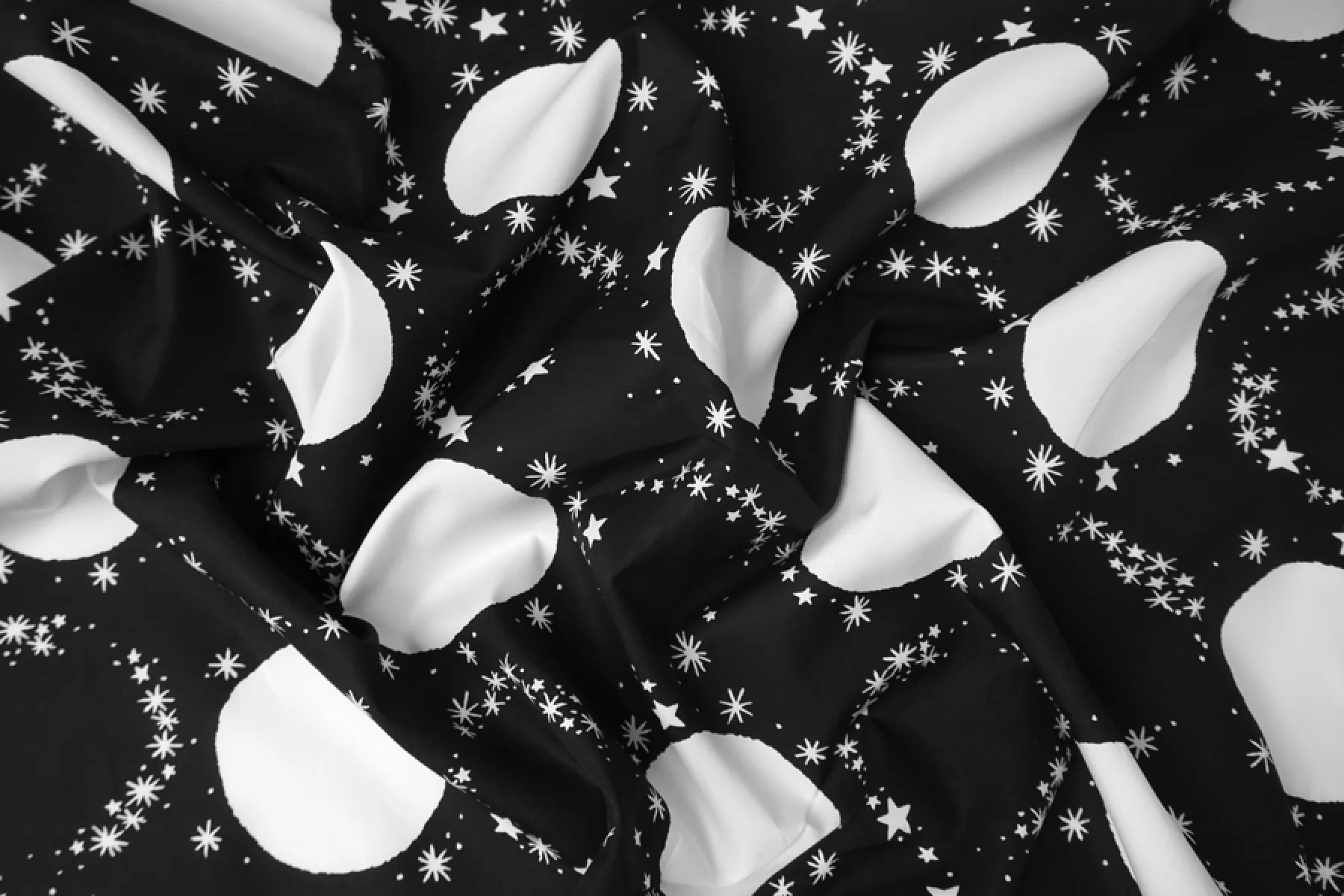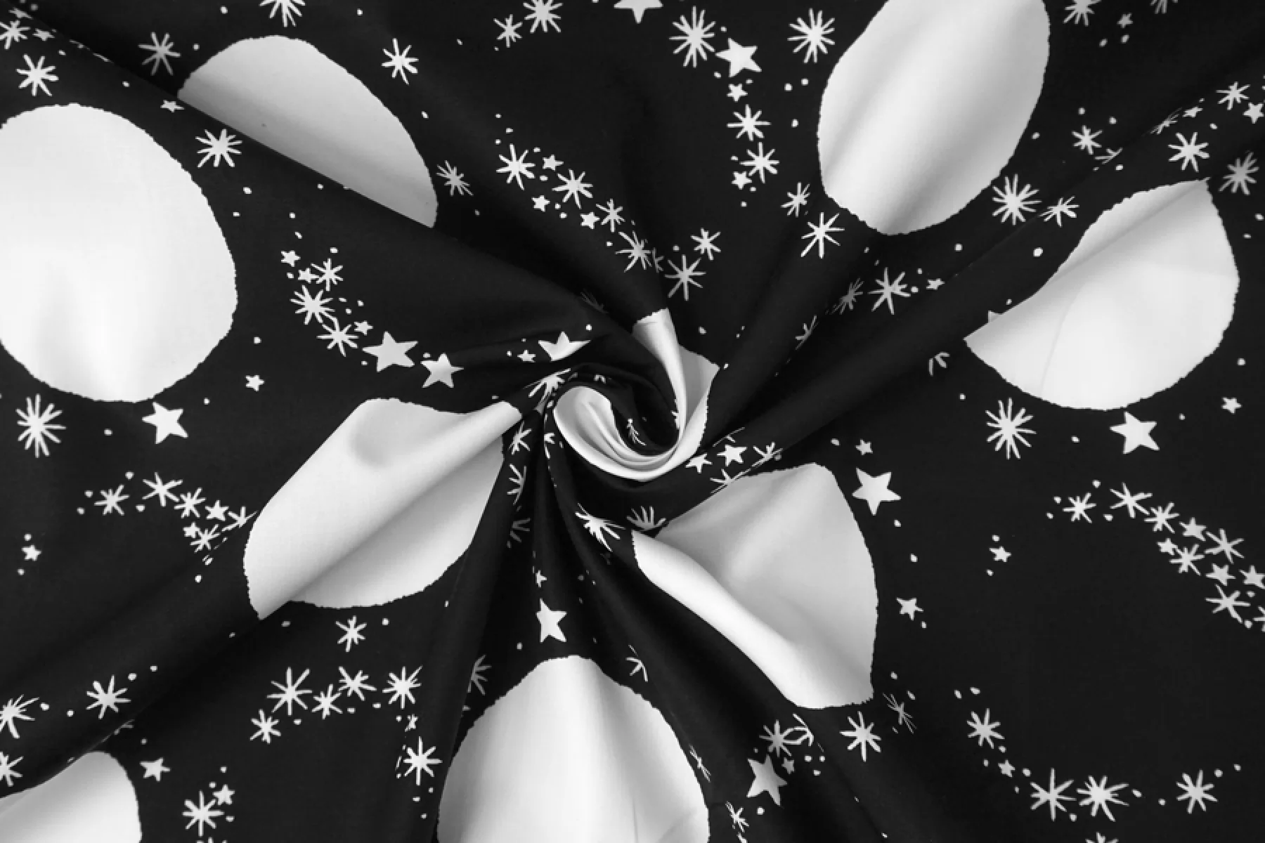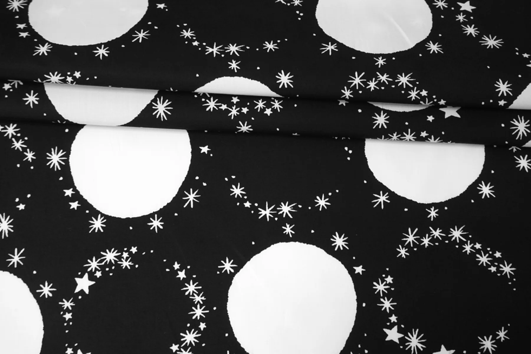 Итальянский мерсеризованный хлопок от Max Mara. Принт - белые звезды с луной на черном фоне. Материал плотный, гладкий, с красивым лоском. На белых фрагментах рисунка слегка просвечивает силуэт. Немного держит форму. Мнется. Отлично подойдет для пошива платьев, рубашек или юбок.