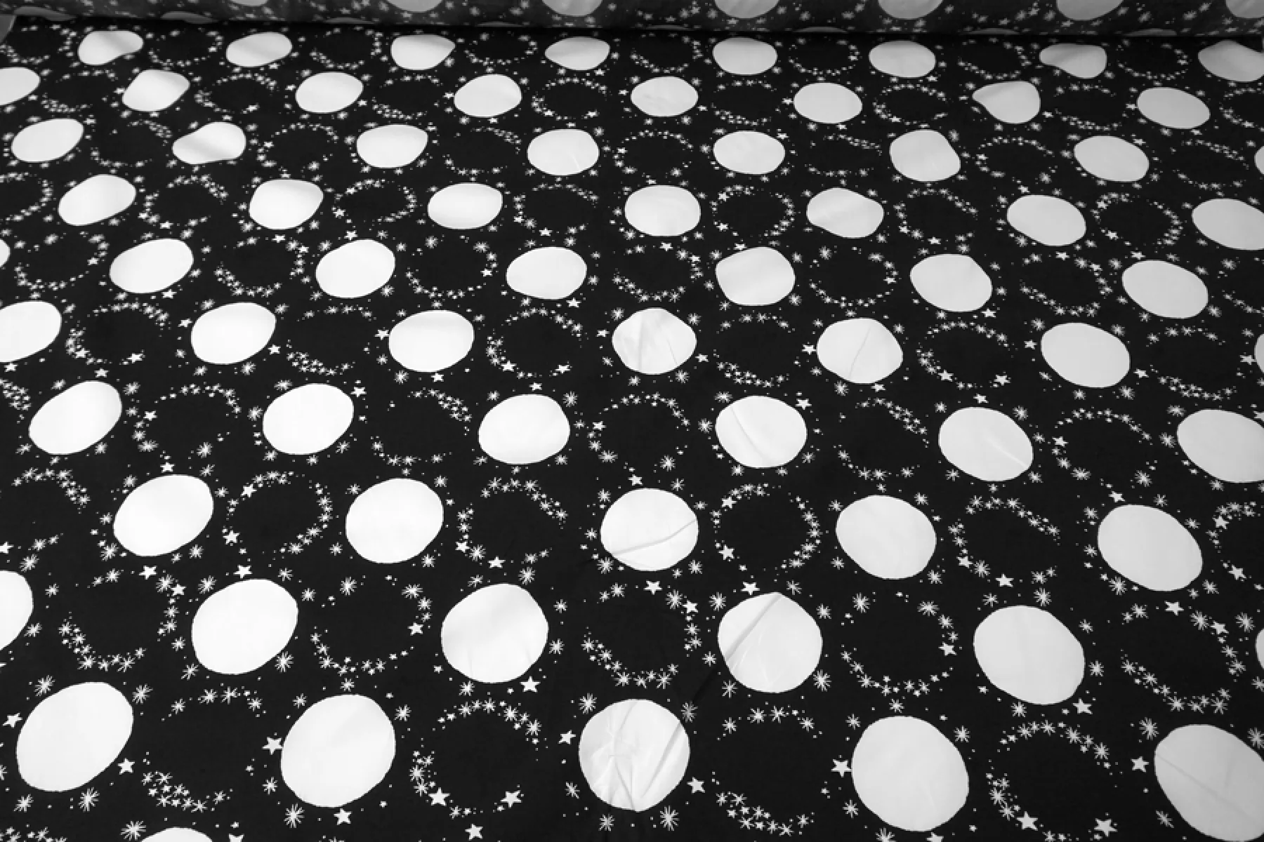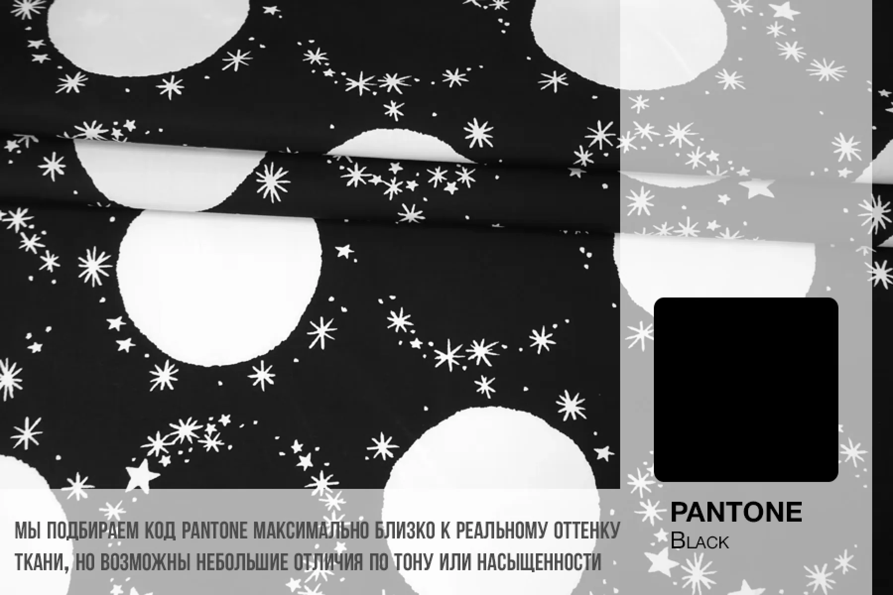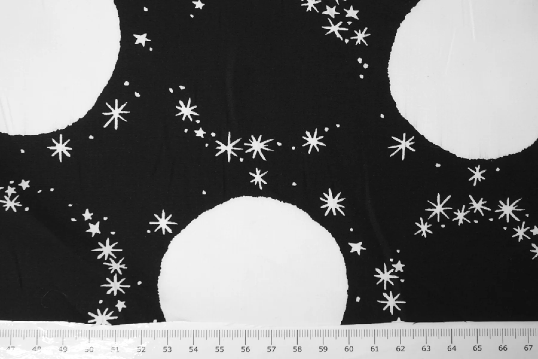 Итальянский мерсеризованный хлопок от Max Mara. Принт - белые звезды с луной на черном фоне. Материал плотный, гладкий, с красивым лоском. На белых фрагментах рисунка слегка просвечивает силуэт. Немного держит форму. Мнется. Отлично подойдет для пошива платьев, рубашек или юбок.