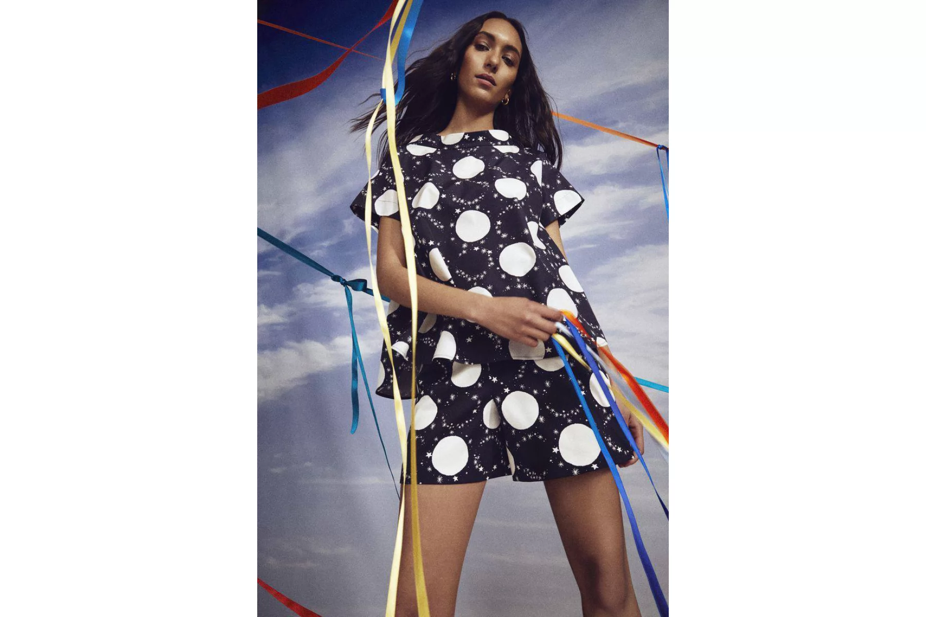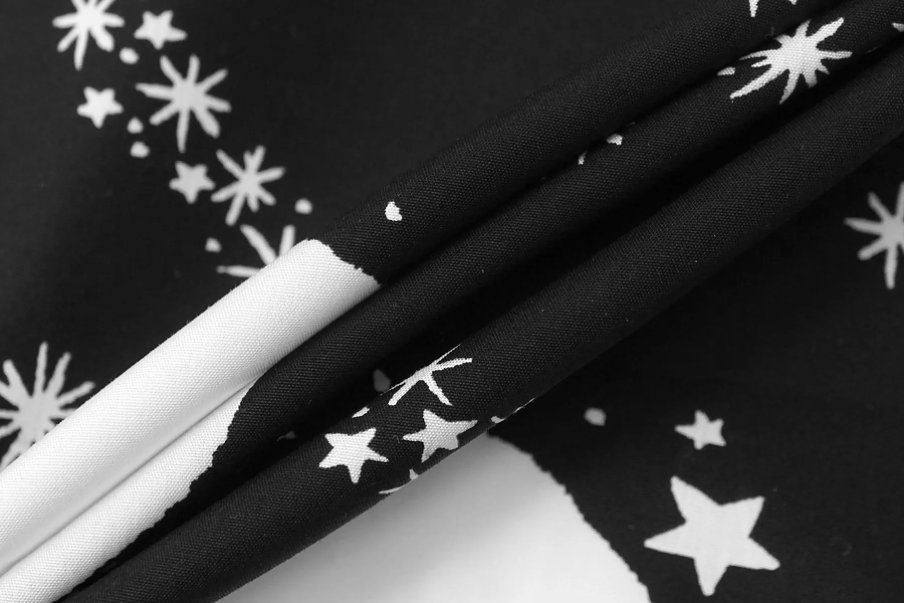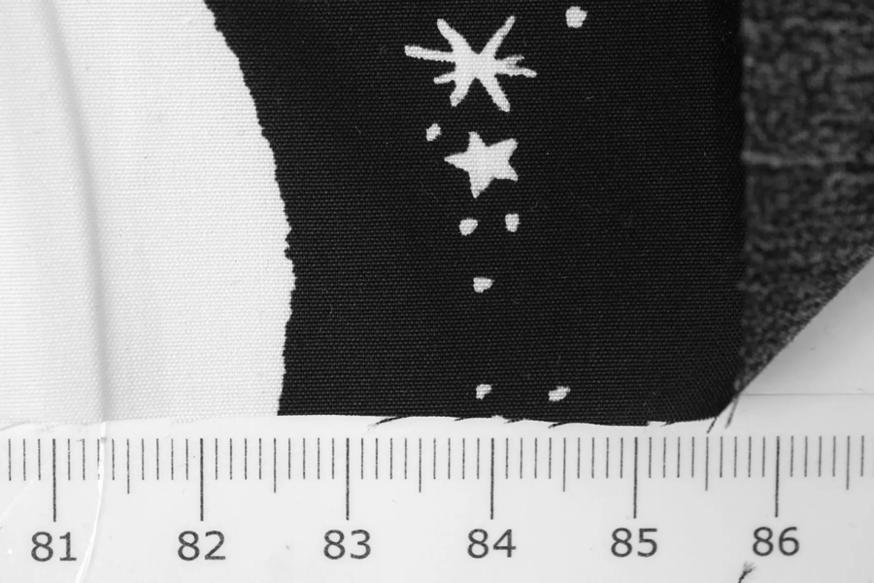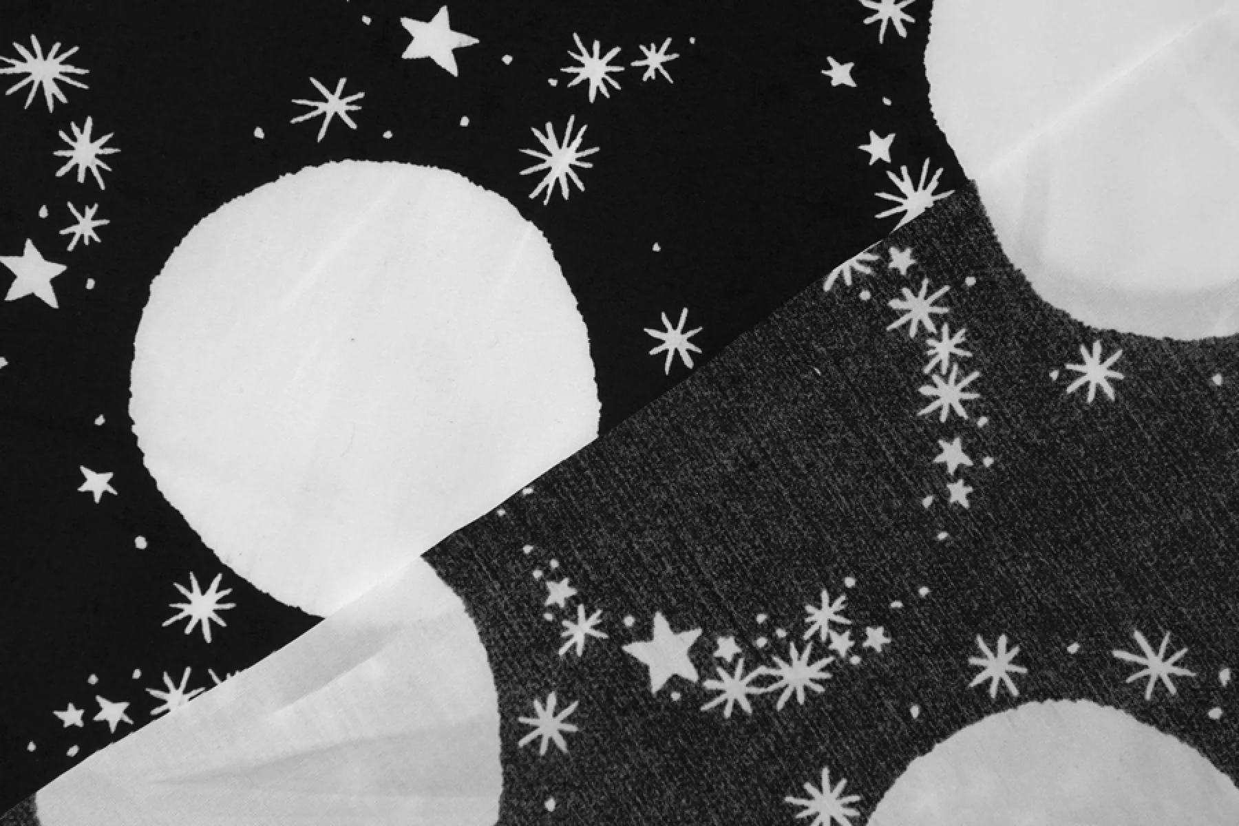 Итальянский мерсеризованный хлопок от Max Mara. Принт - белые звезды с луной на черном фоне. Материал плотный, гладкий, с красивым лоском. На белых фрагментах рисунка слегка просвечивает силуэт. Немного держит форму. Мнется. Отлично подойдет для пошива платьев, рубашек или юбок.