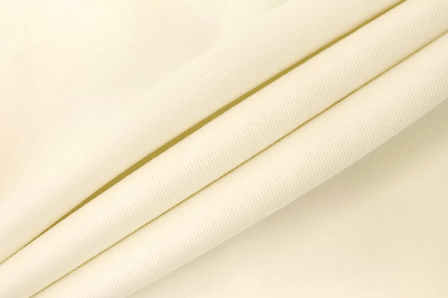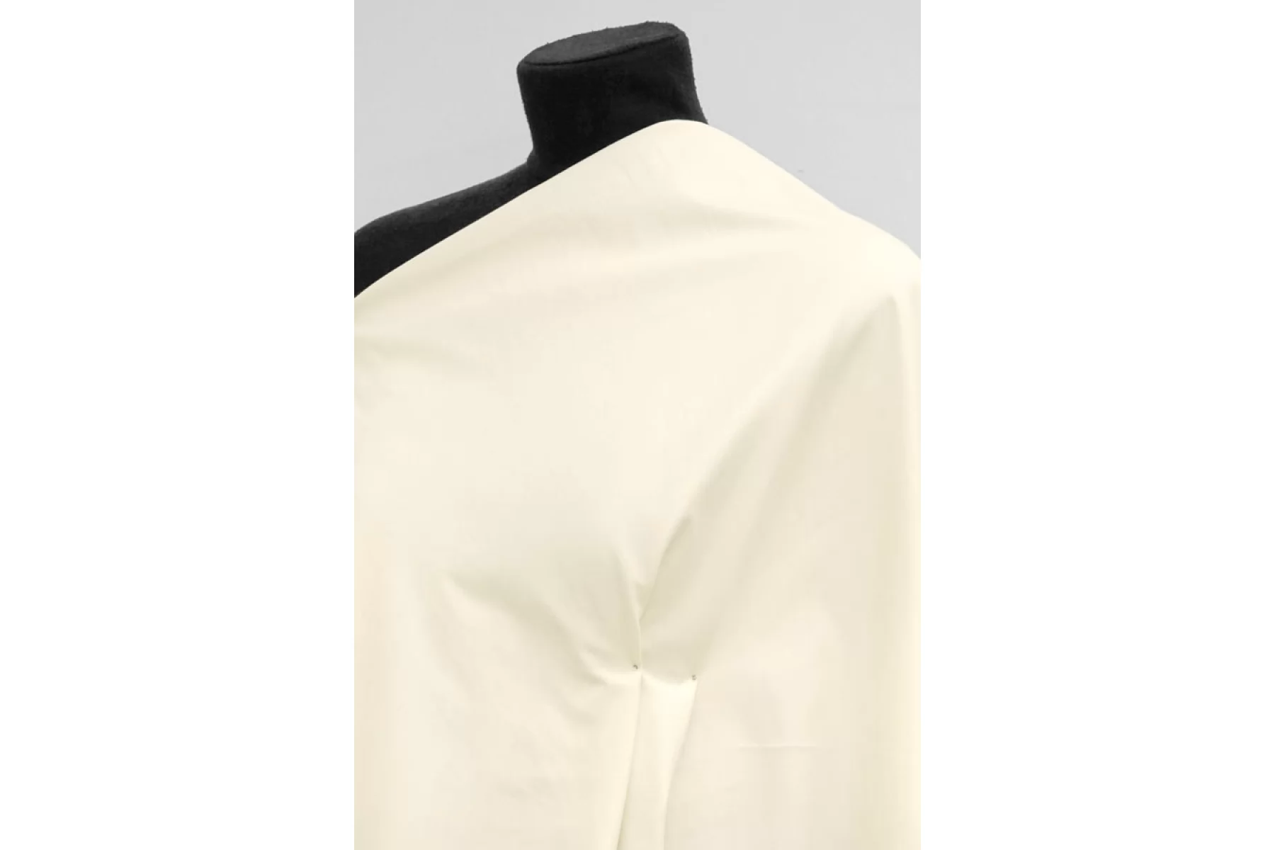 Прекрасный молочный хлопок плательно-костюмной плотности в сливочном оттенке. Тактильно гладкий, приятный. С благородным легким лоском. Неплохо тянется. Немного просвечивает.Сминается. Форму держит. Шьем легкие костюмы, платья, юбки, а также шорты и брюки. Материал может давать усадку.
