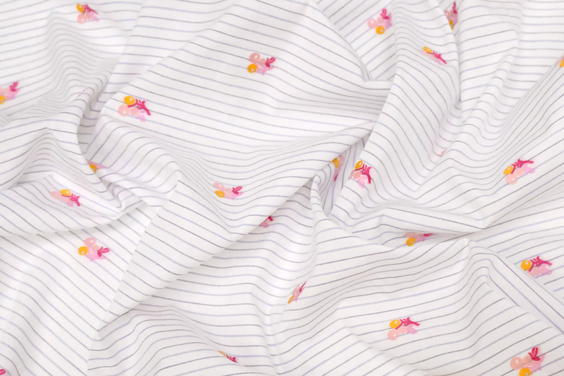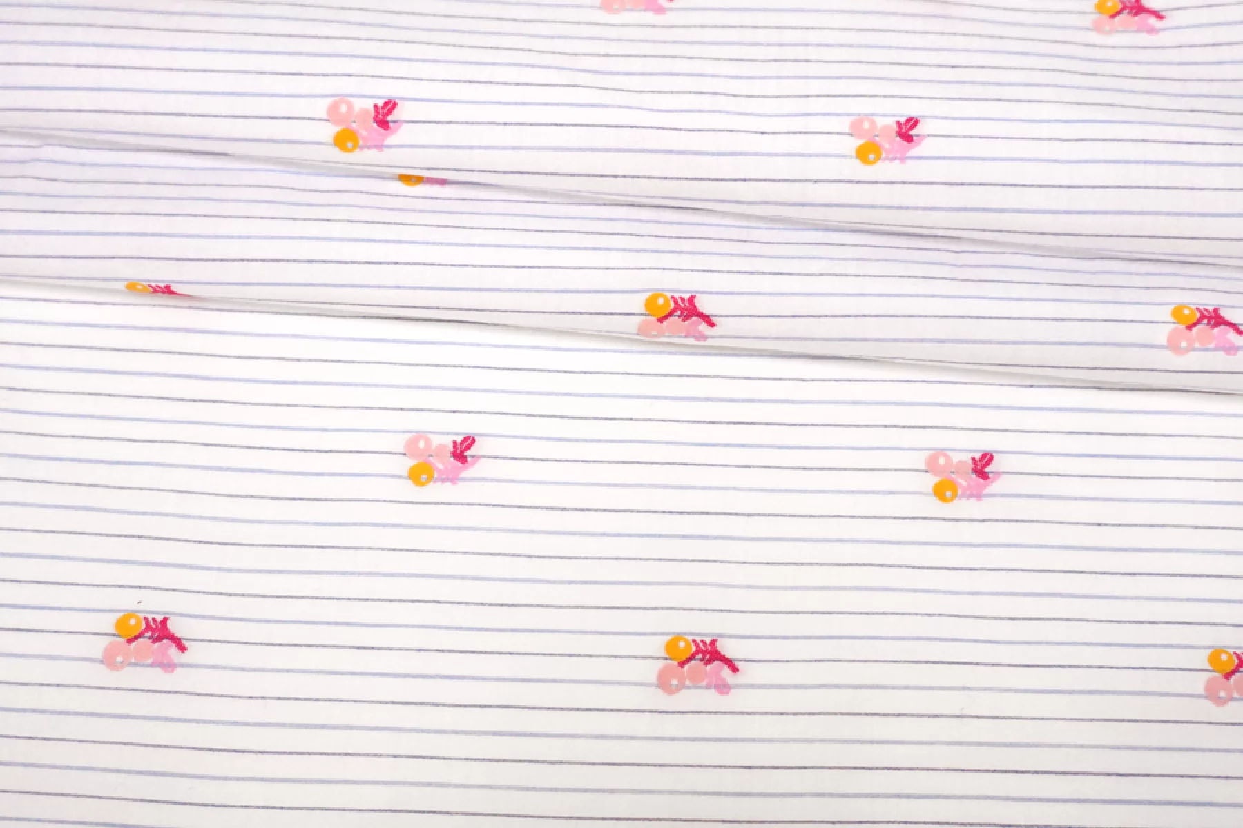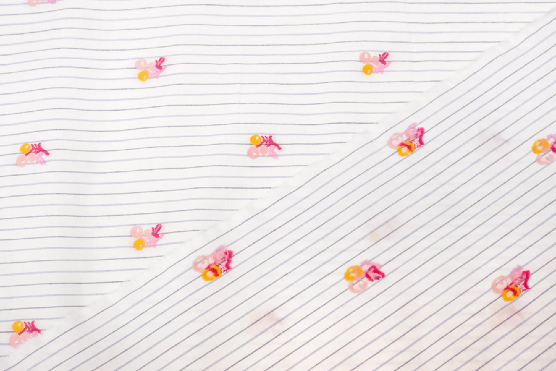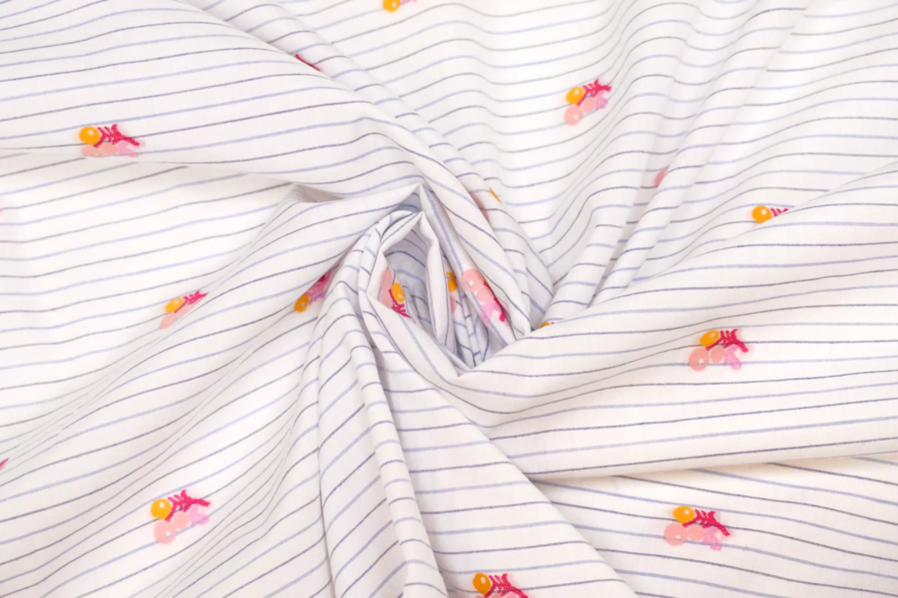 Итальянский рубашечный хлопок в полоску голубого цвета и розовой вышивкой в виде маленьких ягодок, от бренда ETRO. С легким лоском. Материал тактильно очень приятный и мягкий. Хорошо драпируется и красиво смотрится в складке. Форму держит неплохо. Не тянется. Немного просвечивает. Отличный вариант для пошива платья, рубашки, сарафана и юбки. Для однослойных изделий при необходимости используйте подкладочный материал.