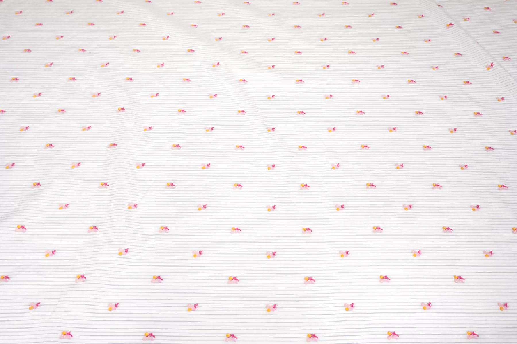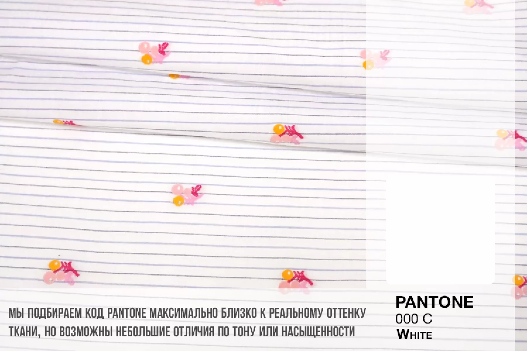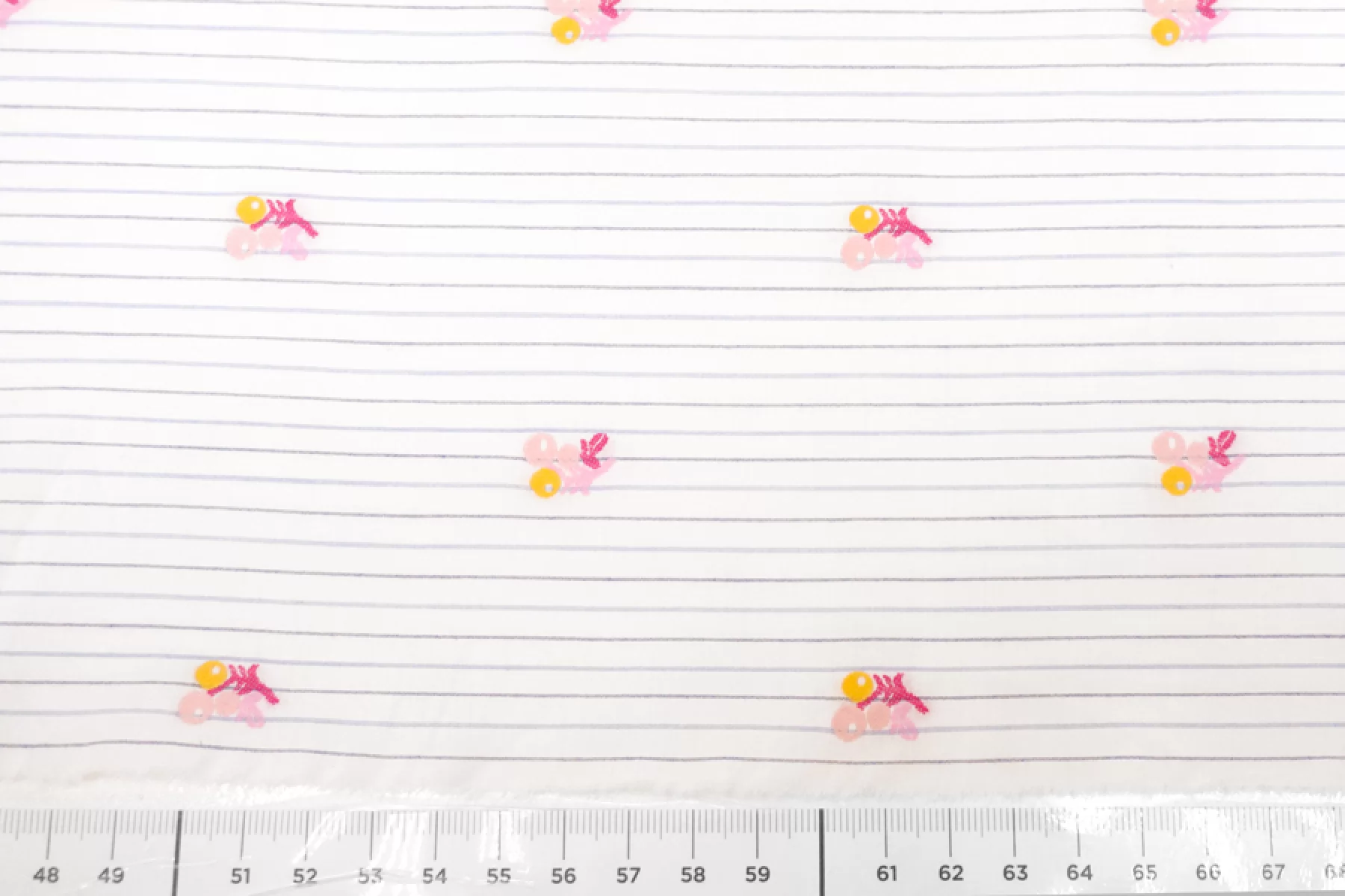 Итальянский рубашечный хлопок в полоску голубого цвета и розовой вышивкой в виде маленьких ягодок, от бренда ETRO. С легким лоском. Материал тактильно очень приятный и мягкий. Хорошо драпируется и красиво смотрится в складке. Форму держит неплохо. Не тянется. Немного просвечивает. Отличный вариант для пошива платья, рубашки, сарафана и юбки. Для однослойных изделий при необходимости используйте подкладочный материал.