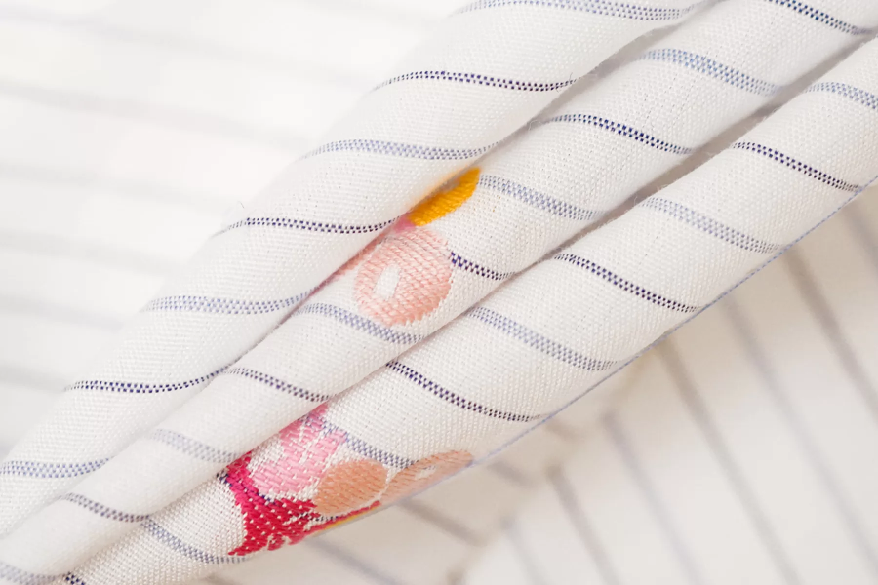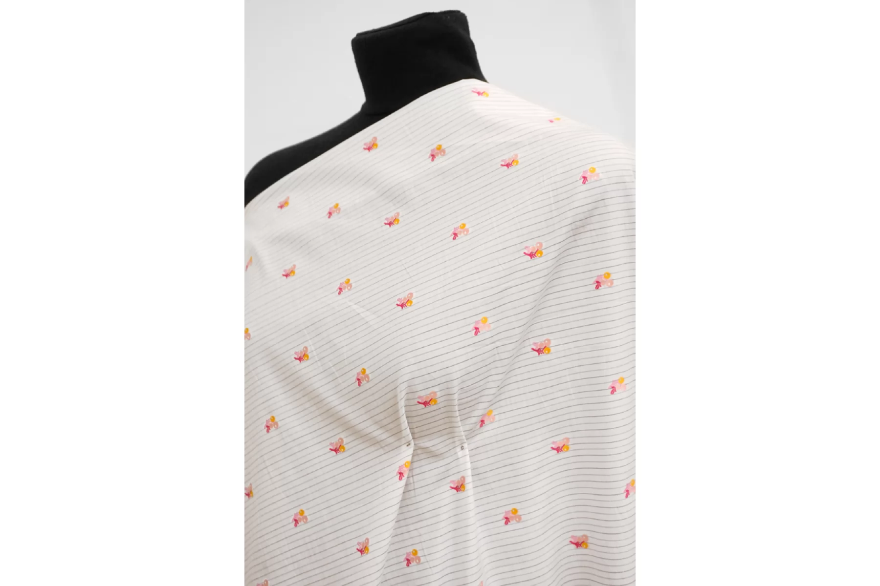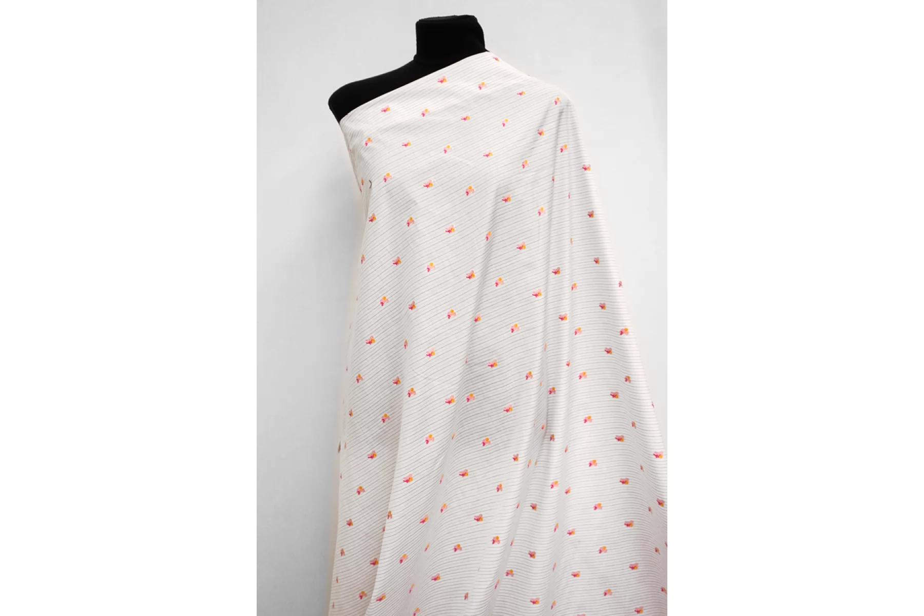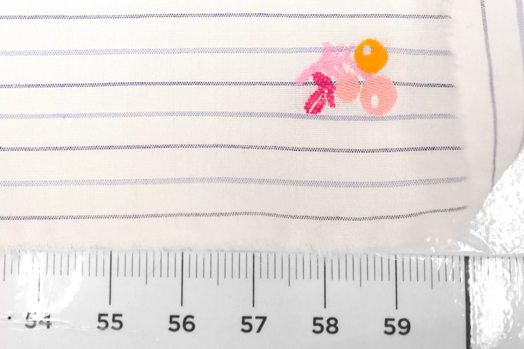 Итальянский рубашечный хлопок в полоску голубого цвета и розовой вышивкой в виде маленьких ягодок, от бренда ETRO. С легким лоском. Материал тактильно очень приятный и мягкий. Хорошо драпируется и красиво смотрится в складке. Форму держит неплохо. Не тянется. Немного просвечивает. Отличный вариант для пошива платья, рубашки, сарафана и юбки. Для однослойных изделий при необходимости используйте подкладочный материал.