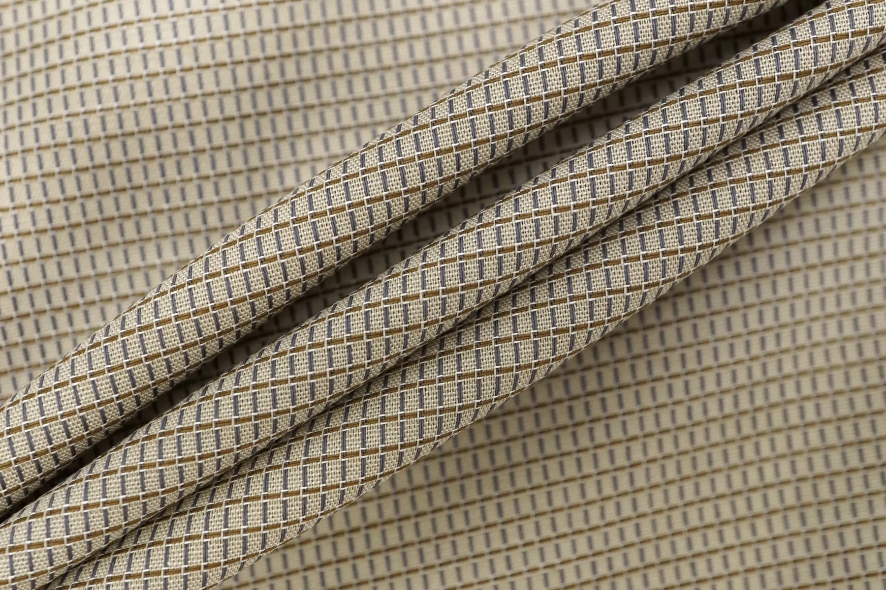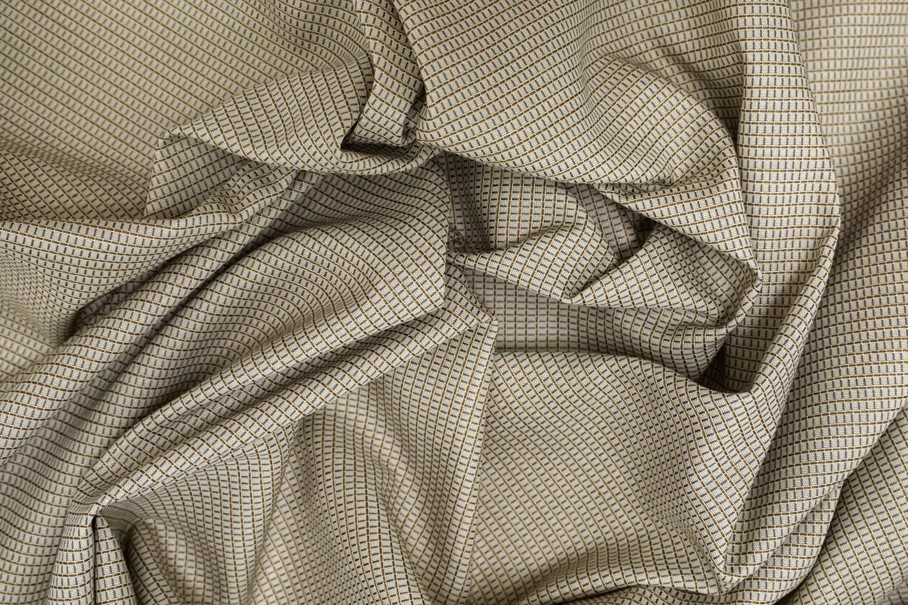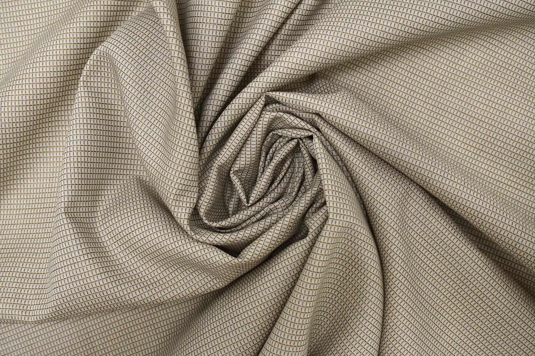 Рубашечно-плательный хлопок бежевого цвета, плюс вплетены серые и тёмно-горчичные нити. Материал мягкий, тонкий, слегка сухой тактильно. Мнется. Немного просвечивает, не тянется. Отлично драпируется, форму держит совсем немного. Прекрасный вариант на рубашки, юбки, платья. Материал дает усадку.