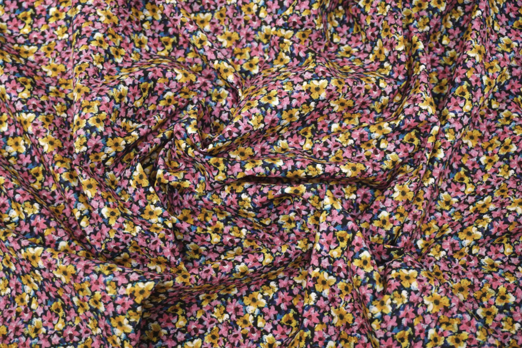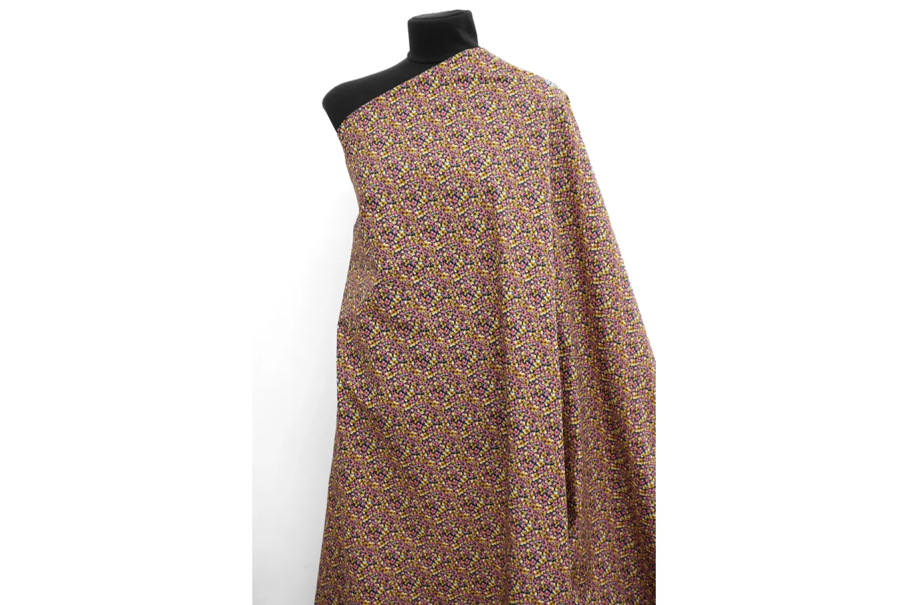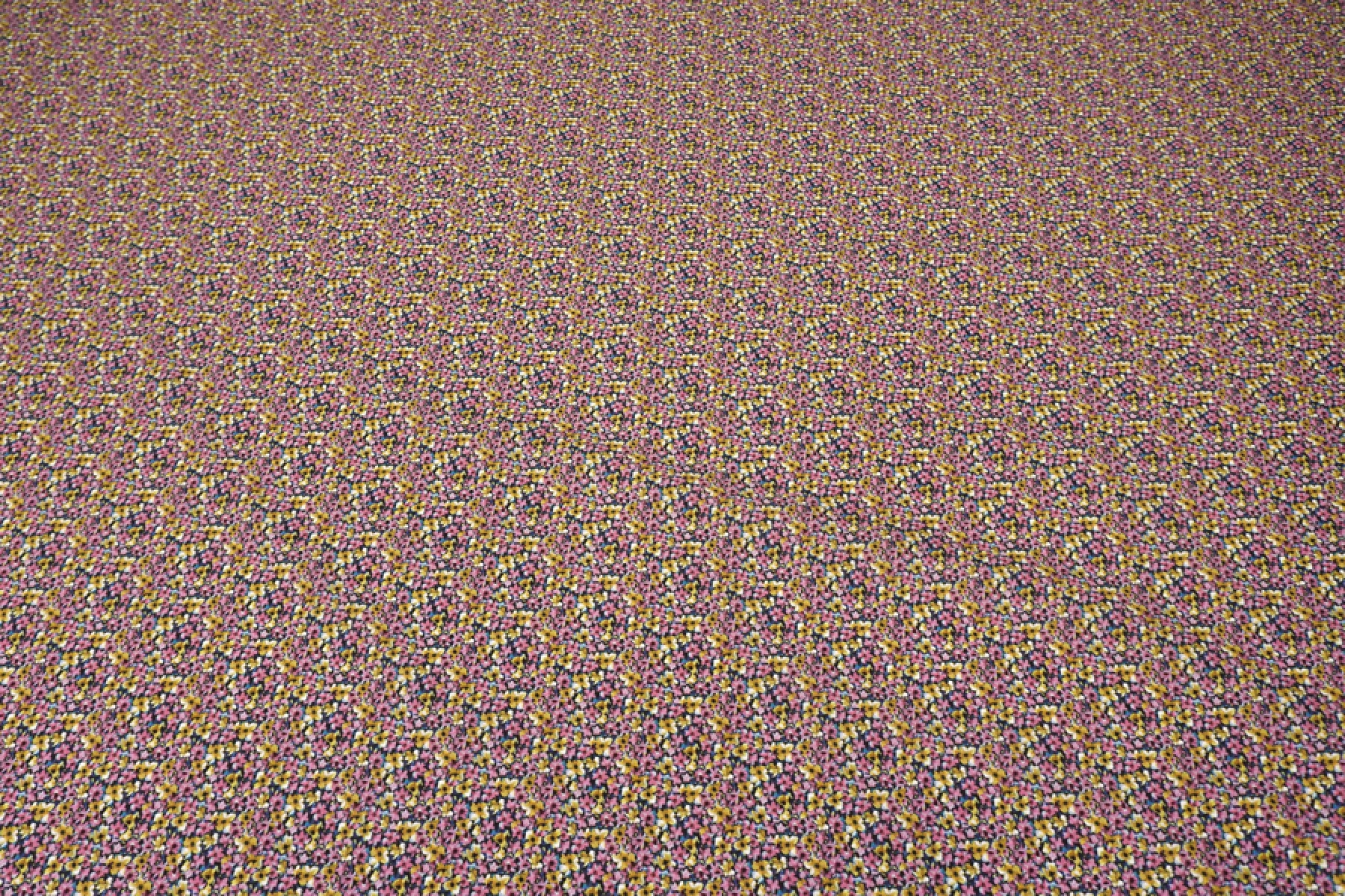 Итальянский хлопок рубашечно-плательной плотности с мелким цветочным принтом, основной цвет розовый и охристо-желтый, с синими, черными и бордовыми вкраплениями. Материал гладкий, слегка шуршащий, мягкий, тонкий. Немного мнется. Не просвечивает, не тянется. Пластичный и немного держит форму. Прекрасный вариант на рубашки, юбки, платья. Материал дает усадку.