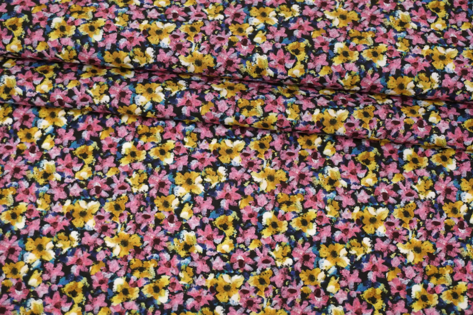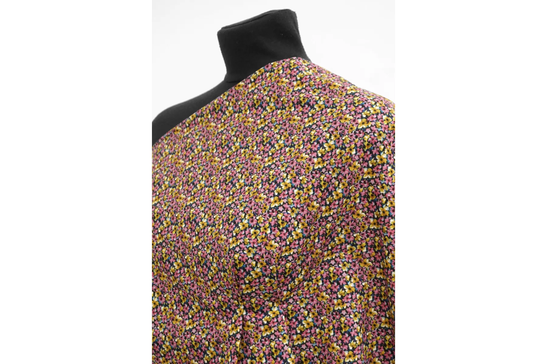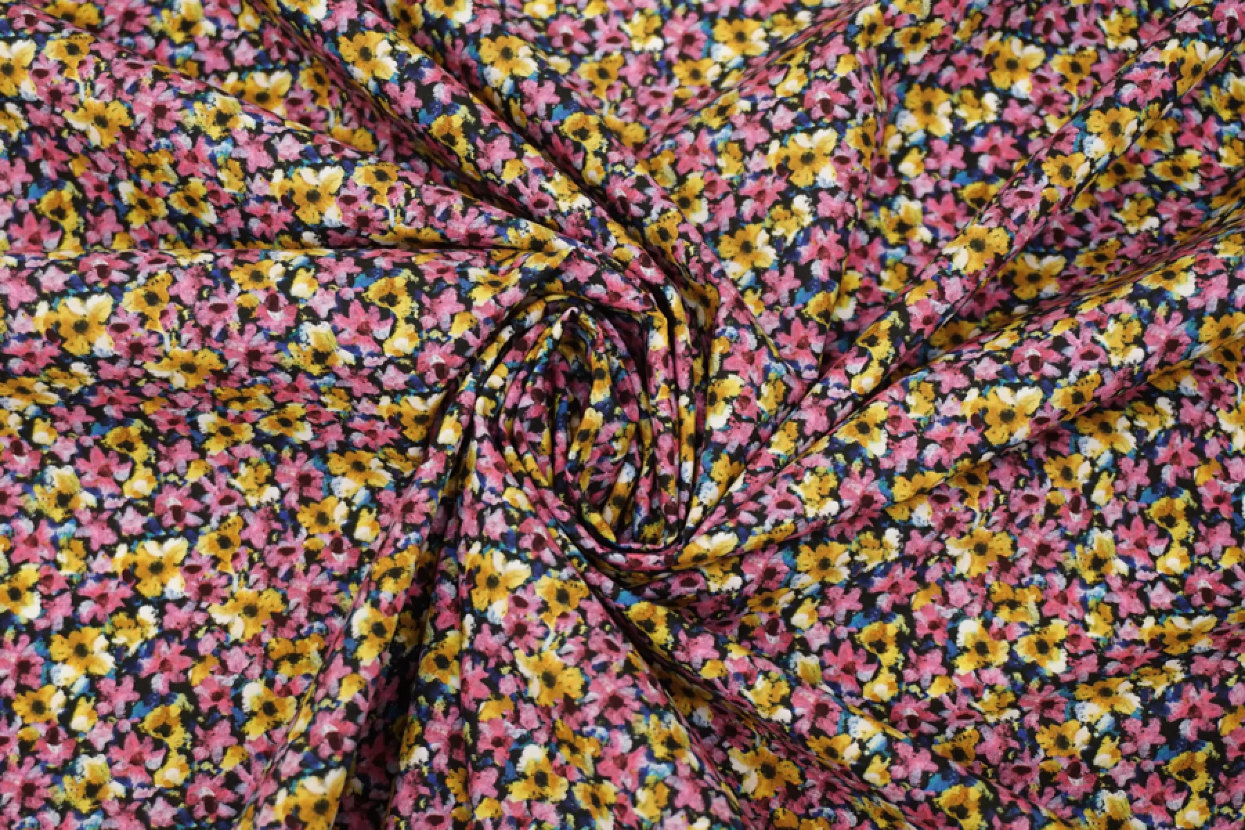 Итальянский хлопок рубашечно-плательной плотности с мелким цветочным принтом, основной цвет розовый и охристо-желтый, с синими, черными и бордовыми вкраплениями. Материал гладкий, слегка шуршащий, мягкий, тонкий. Немного мнется. Не просвечивает, не тянется. Пластичный и немного держит форму. Прекрасный вариант на рубашки, юбки, платья. Материал дает усадку.