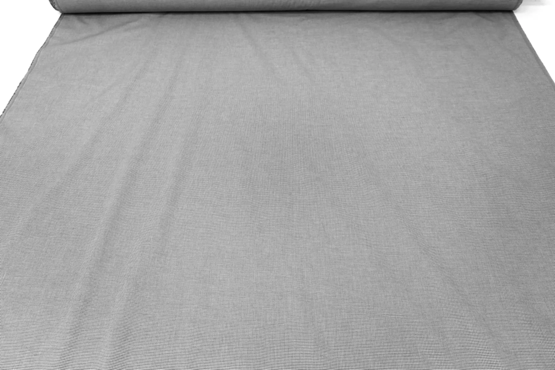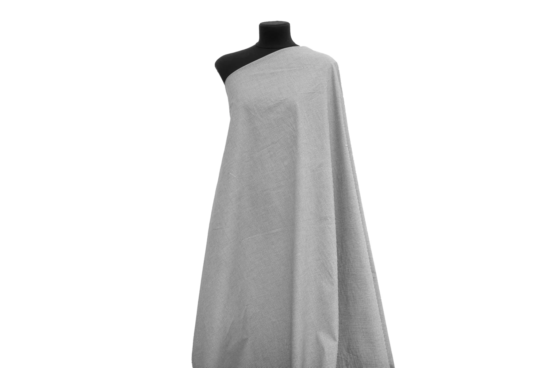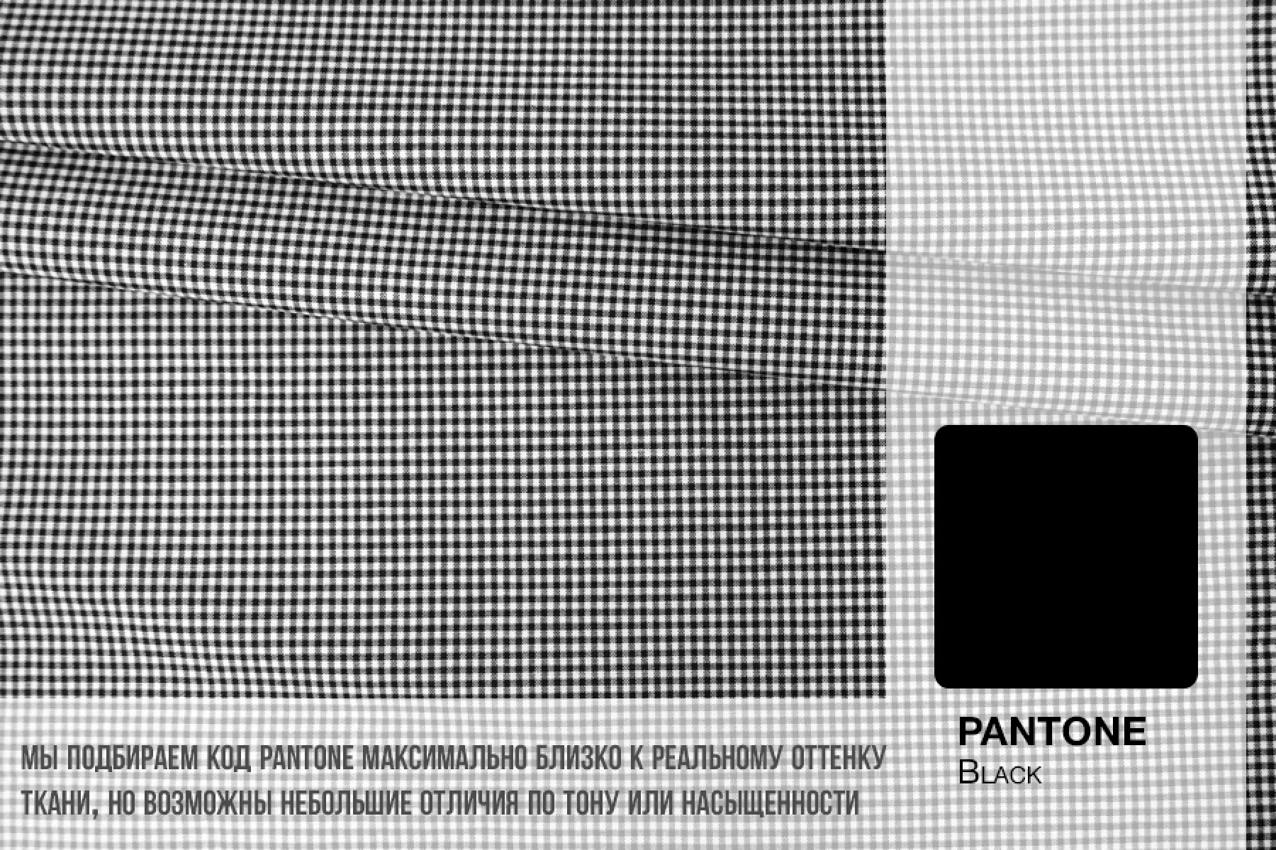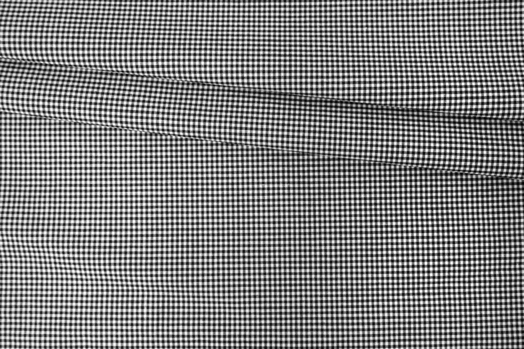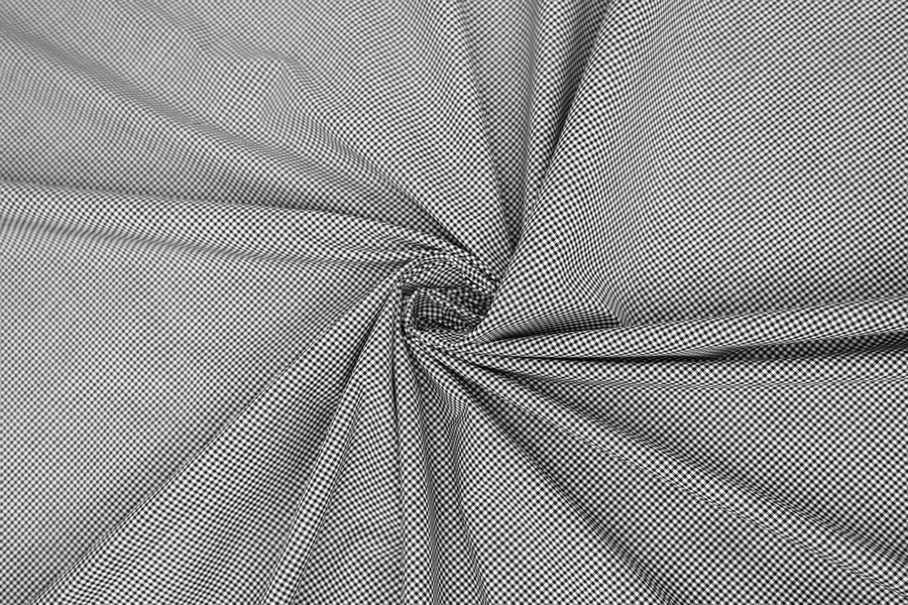 Рубашечно-плательный хлопок полотняного переплетения нитей черного и белого цветов, что образуют мелкую клетку. Тактильно материал тонкий, но плотный, мягкий и приятный, похрустывает. Содержит небольшое количество эластана, что позволяет материалу тянуться. Отлично драпируется и неплохо держит форму. Не просвечивает. Классный вариант на платья, юбки и рубашки.