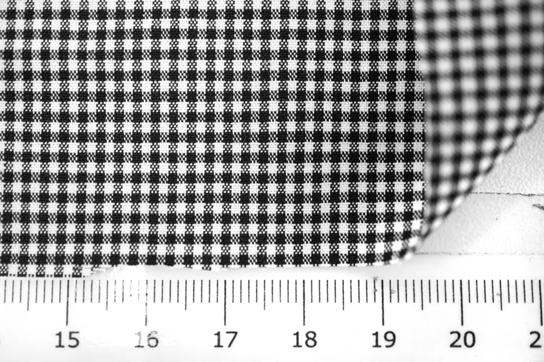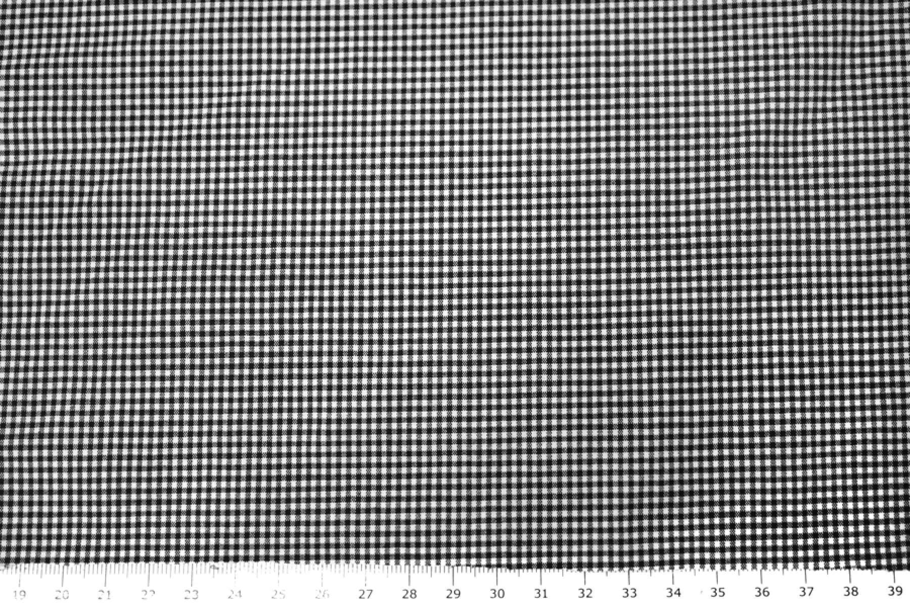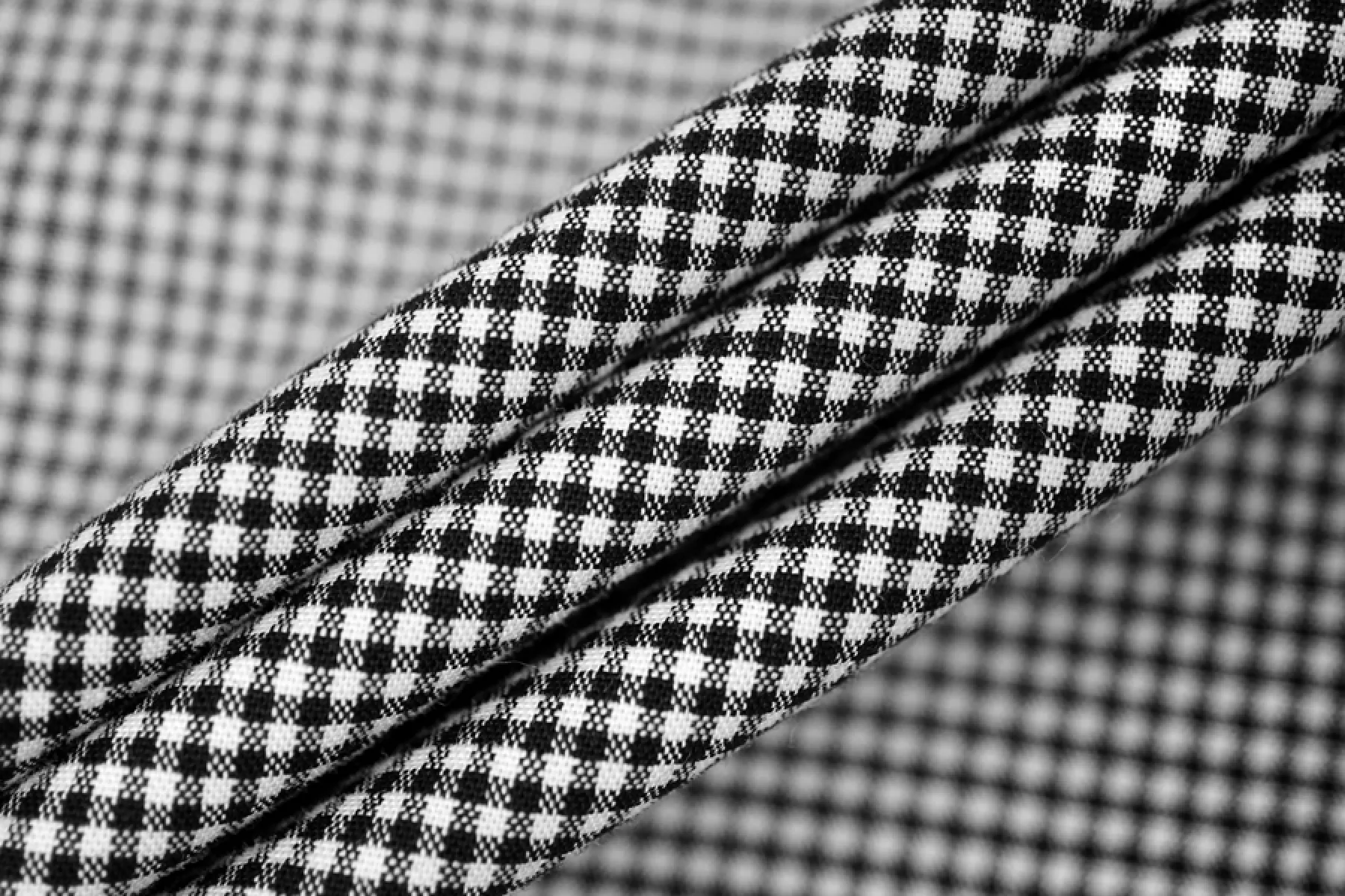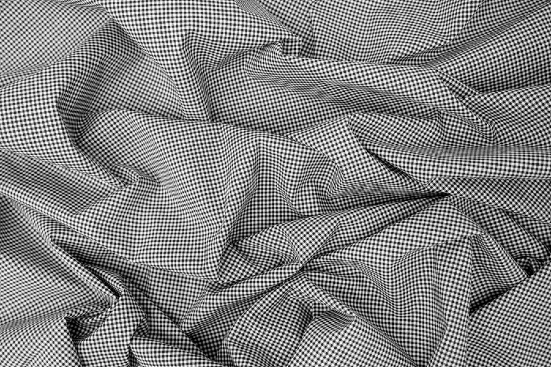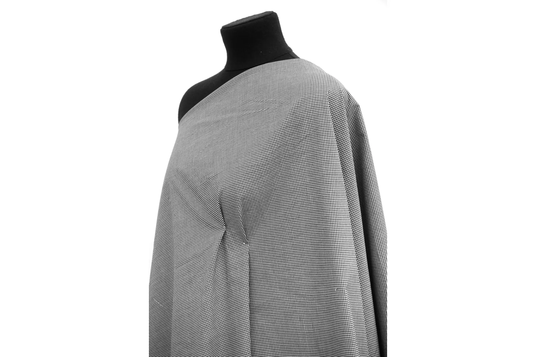 Рубашечно-плательный хлопок полотняного переплетения нитей черного и белого цветов, что образуют мелкую клетку. Тактильно материал тонкий, но плотный, мягкий и приятный, похрустывает. Содержит небольшое количество эластана, что позволяет материалу тянуться. Отлично драпируется и неплохо держит форму. Не просвечивает. Классный вариант на платья, юбки и рубашки.